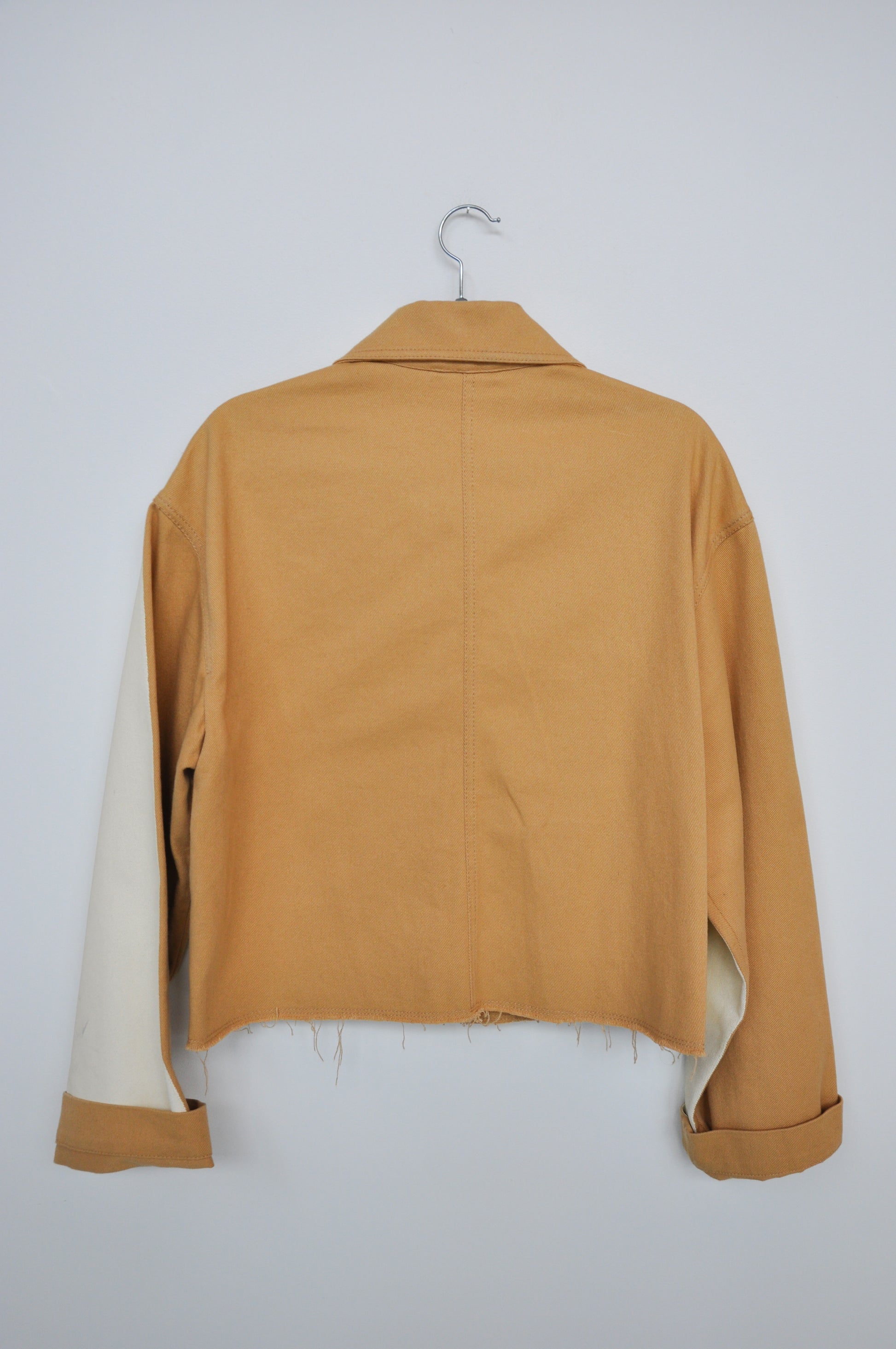 Boxy style jacket. Partially waxed cotton detail at the front. Button up. Two front pockets. By the brand Acne Studios.