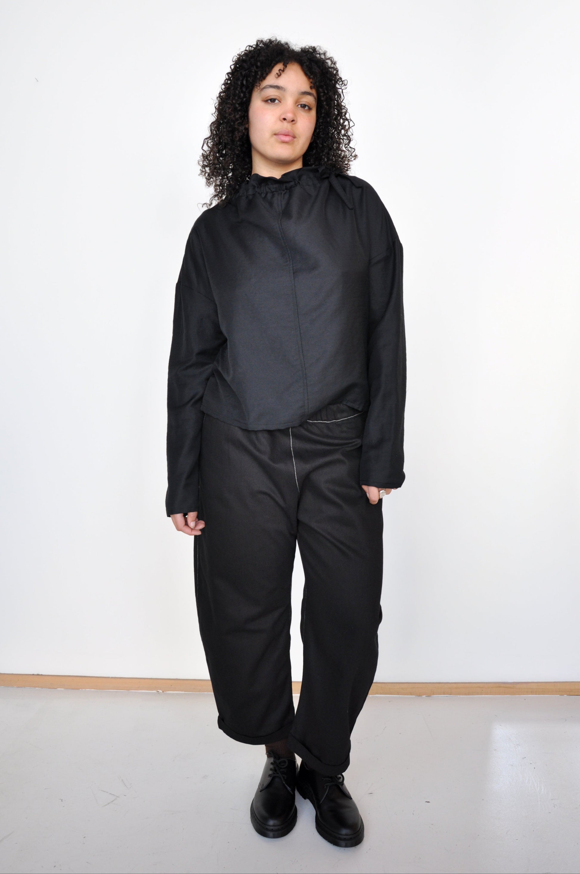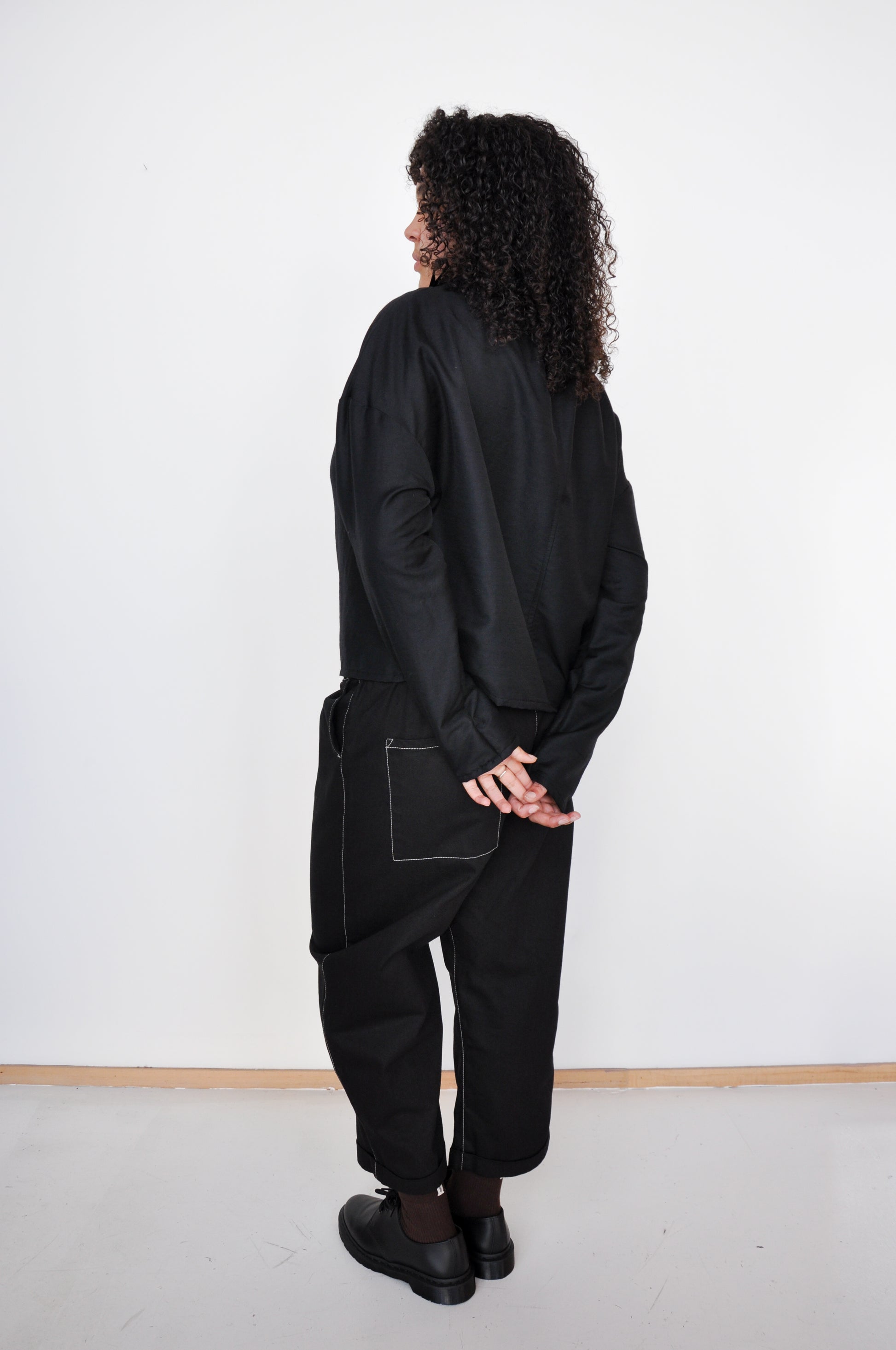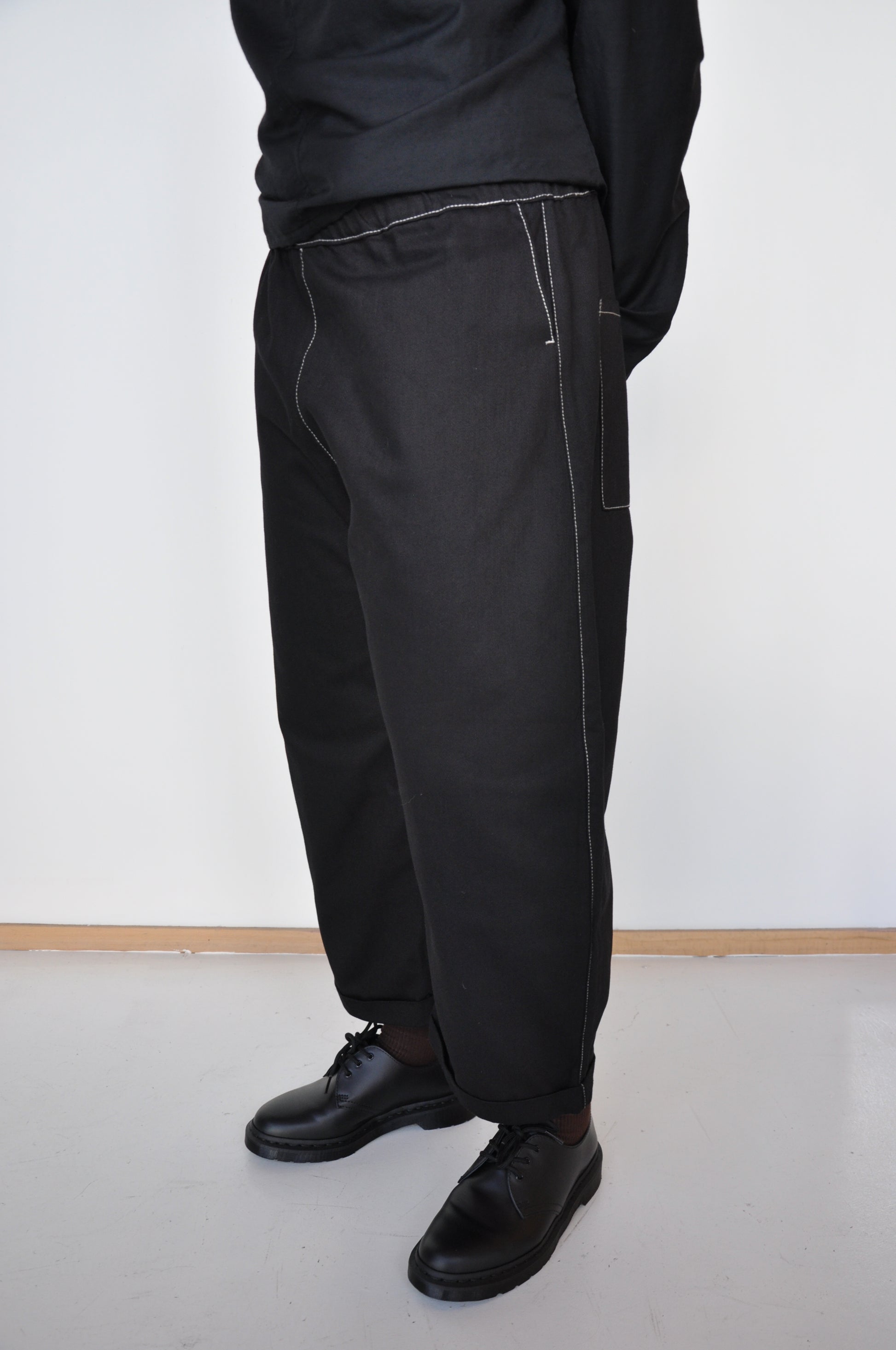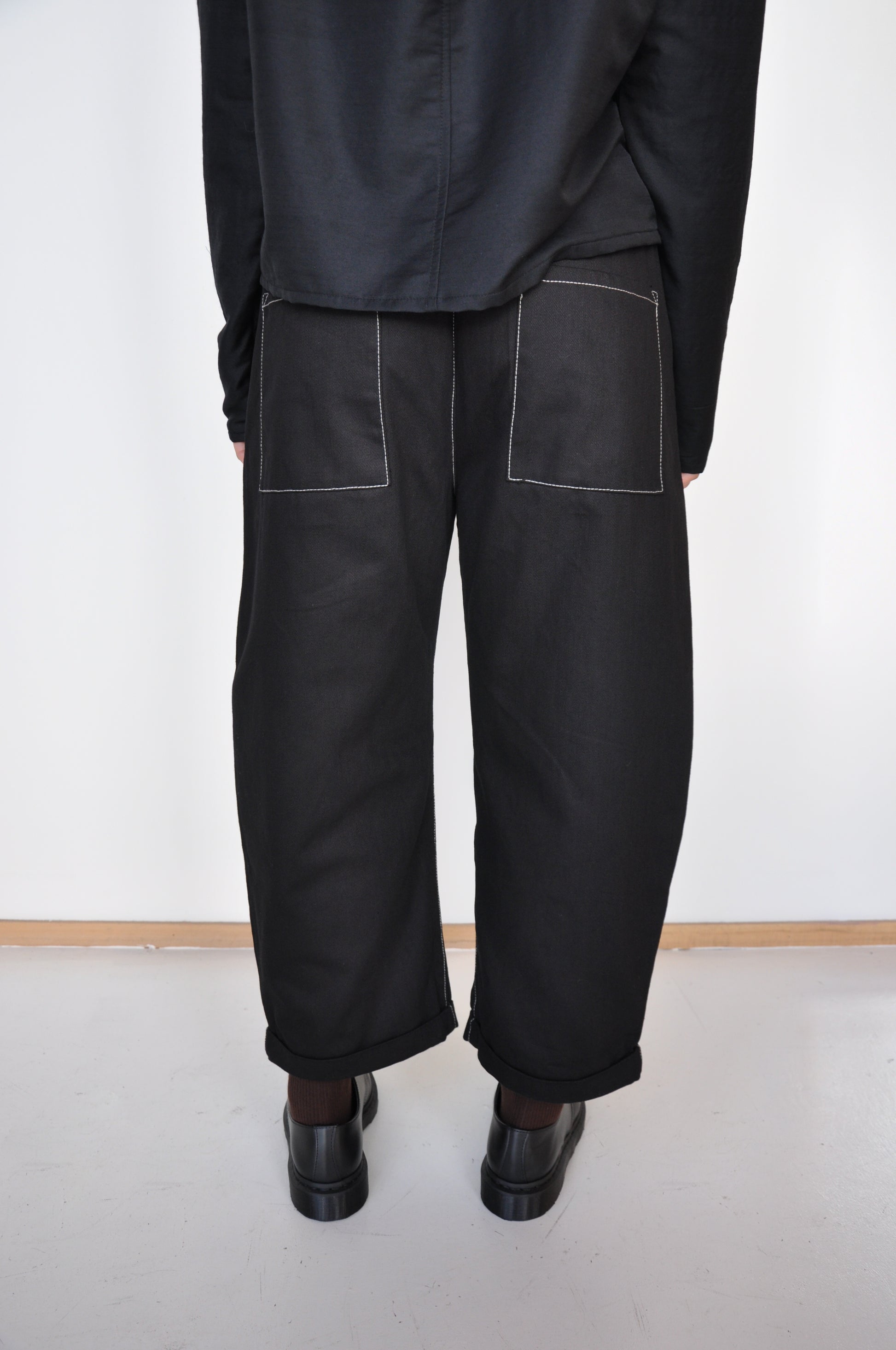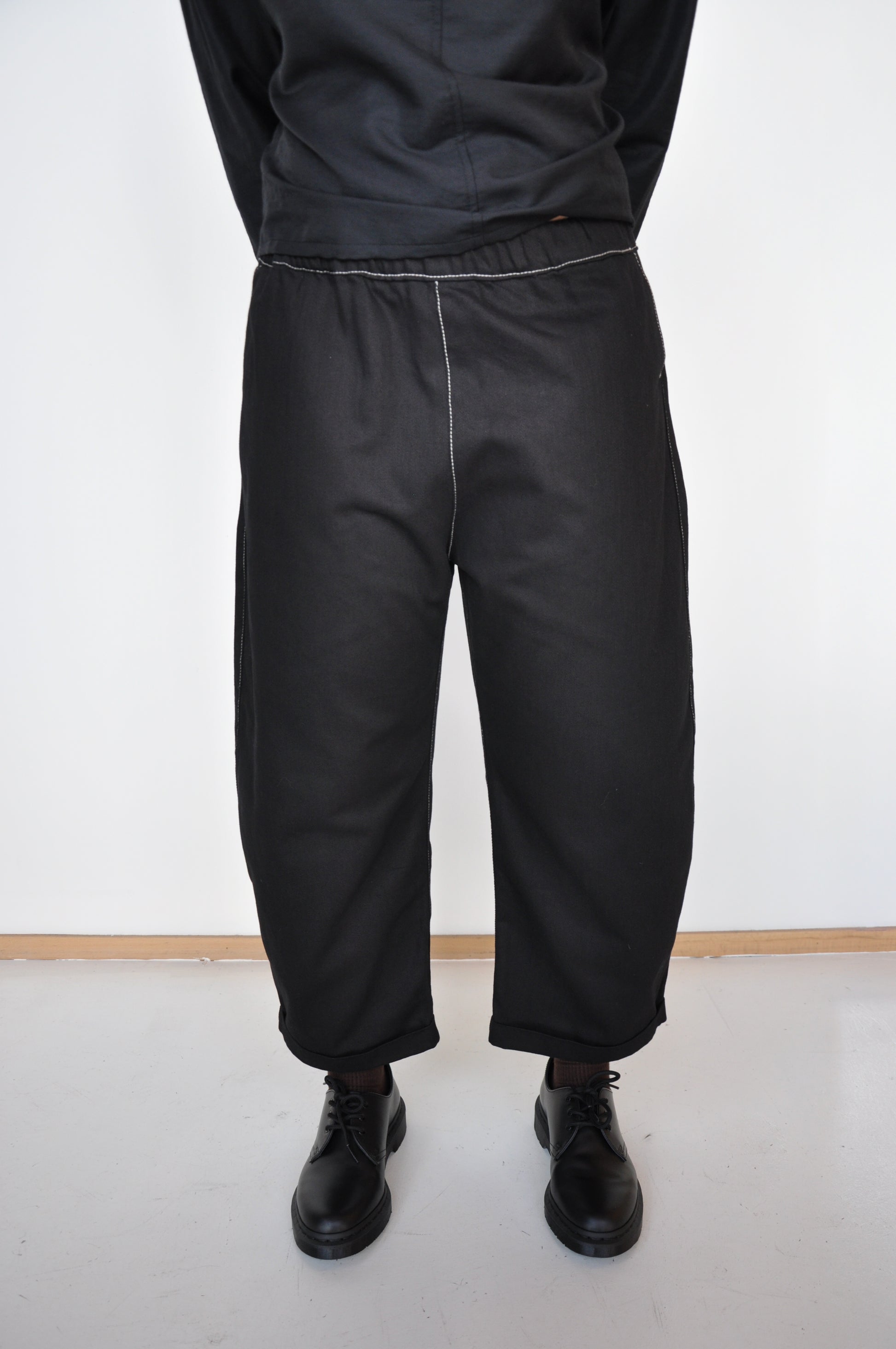 Agate Pants in Black Denim are an oversized, curved leg denim trouser. Slightly cropped at with a little fold and featuring a elastic waist and side pockets.