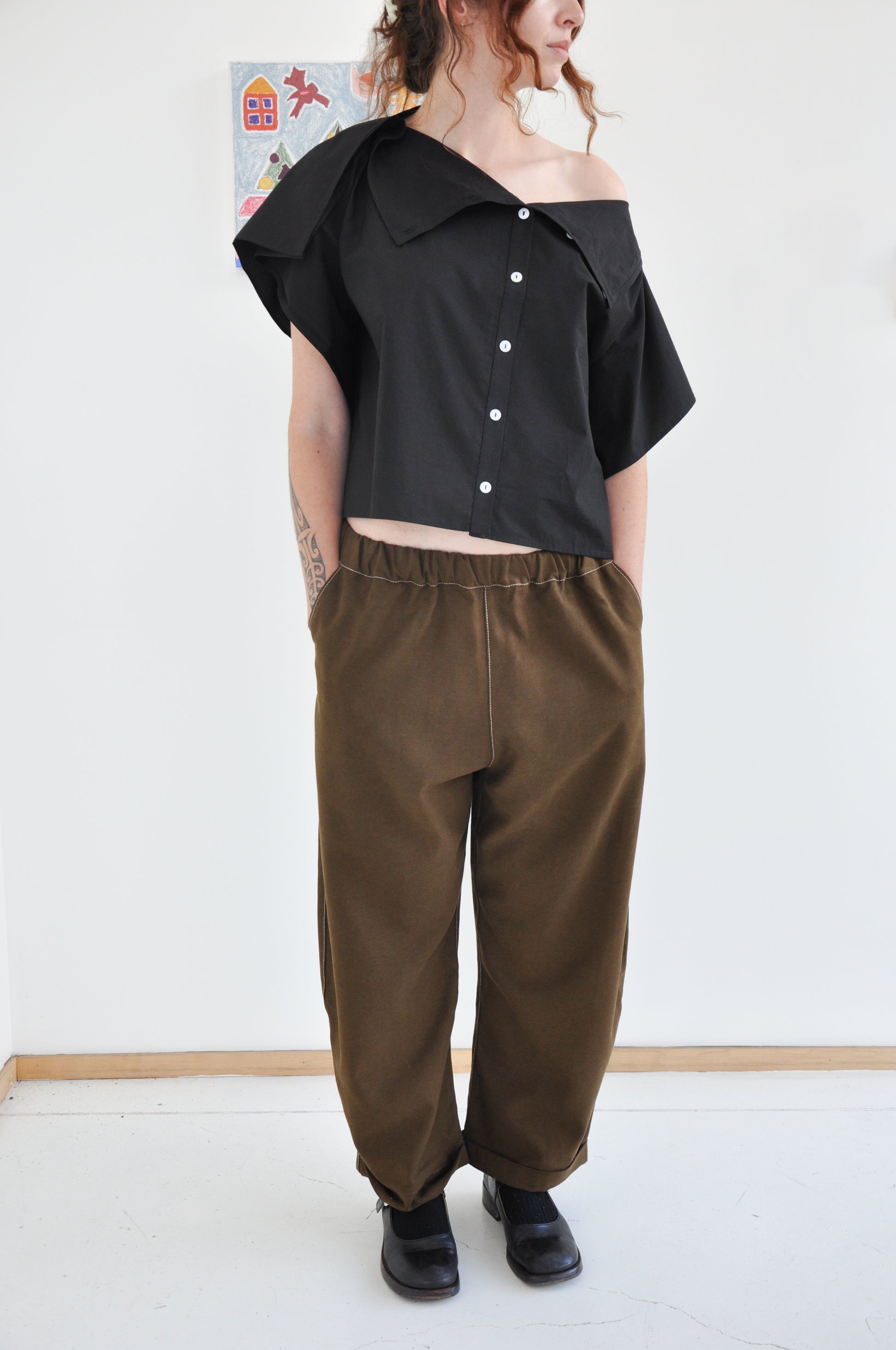 Agate Pants in Cedar are an oversized, curved leg cotton, linen and tencel trouser. Slightly cropped at with a little fold and featuring a elastic waist and side pockets.