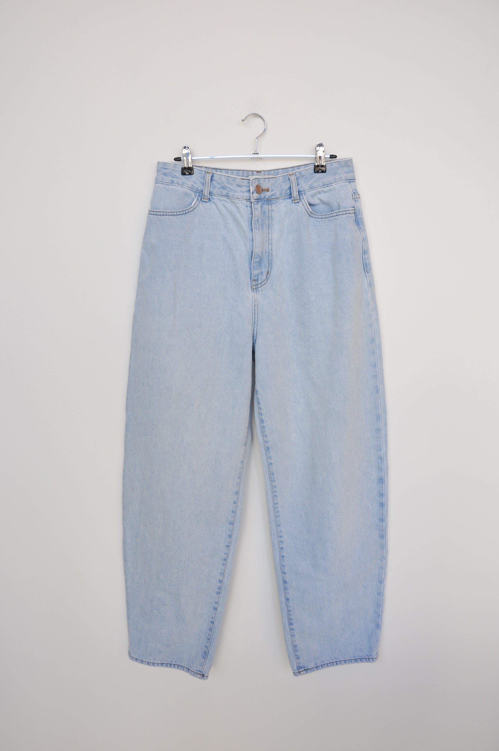 Wide leg jeans. Tappers at the bottom. Two front and two back pockets. Zip and button at the close. Belt loops. Size 2/ 28-29. By the brand Amomento.