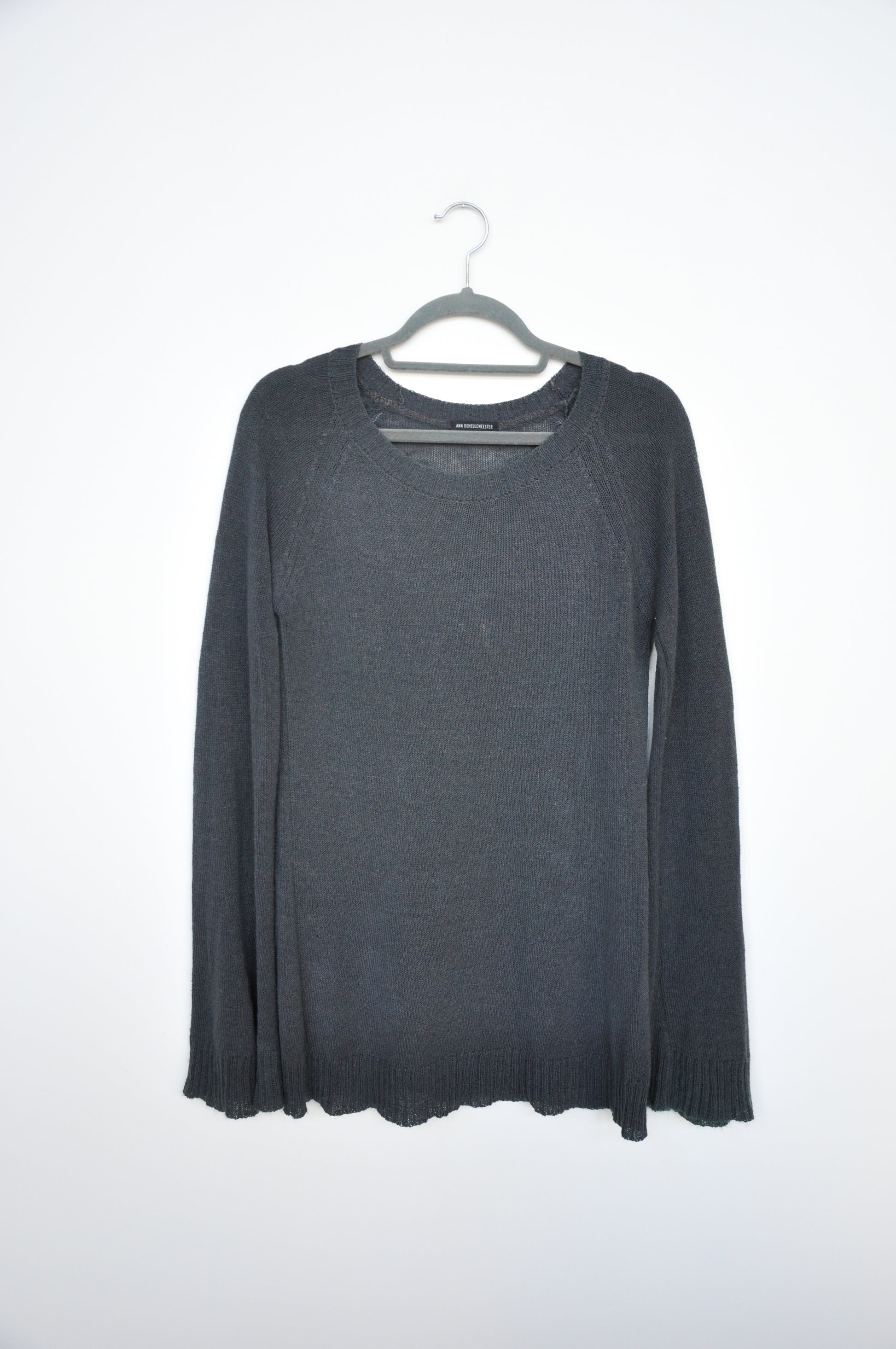 Heavy knit jumper. Semi sheer. The trimmings of the jumper feature subtle green texture. By the brand Ann Demulemeester.