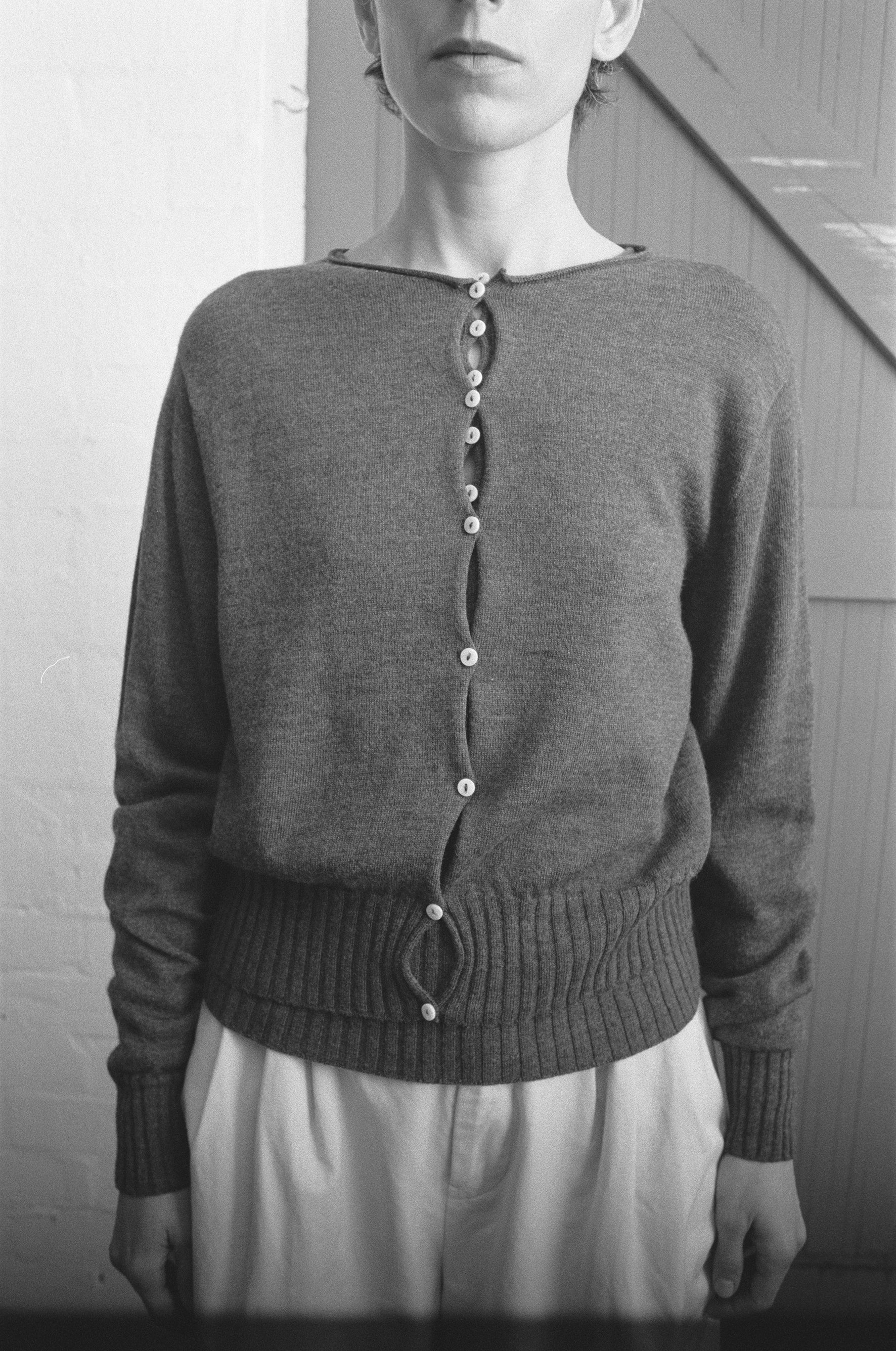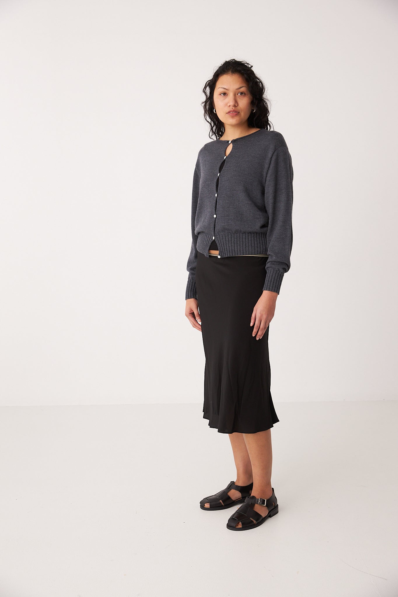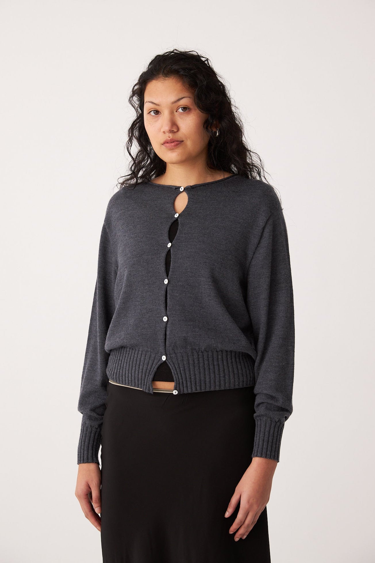 Anni Cardigan in Shadow Grey, a lightweight, cropped, crew-neck cardigan for seasonless layering. A more traditional fit that is designed to be relatively neat in fit and finish at the waist. Size up for a slouchier fit.