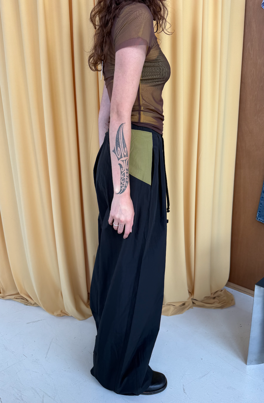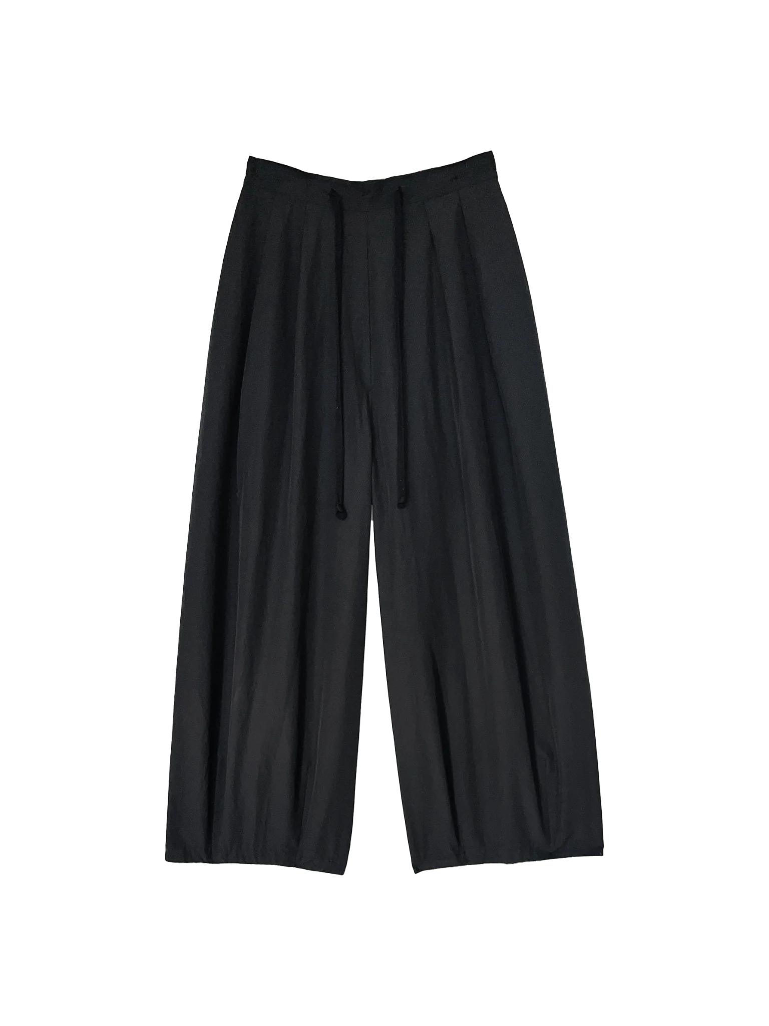Wide-leg pants with a pleated front waist. Features a partly elasticated back waistband, front drawstring for added comfort, centre-back zip, and in-seam pockets. The generous cut and carefully positioned darts at the hem create the unique shape. Constructed from a premium cotton-nylon blend for structure, breathability and durability. Similar to previous style — Leisure Pants.