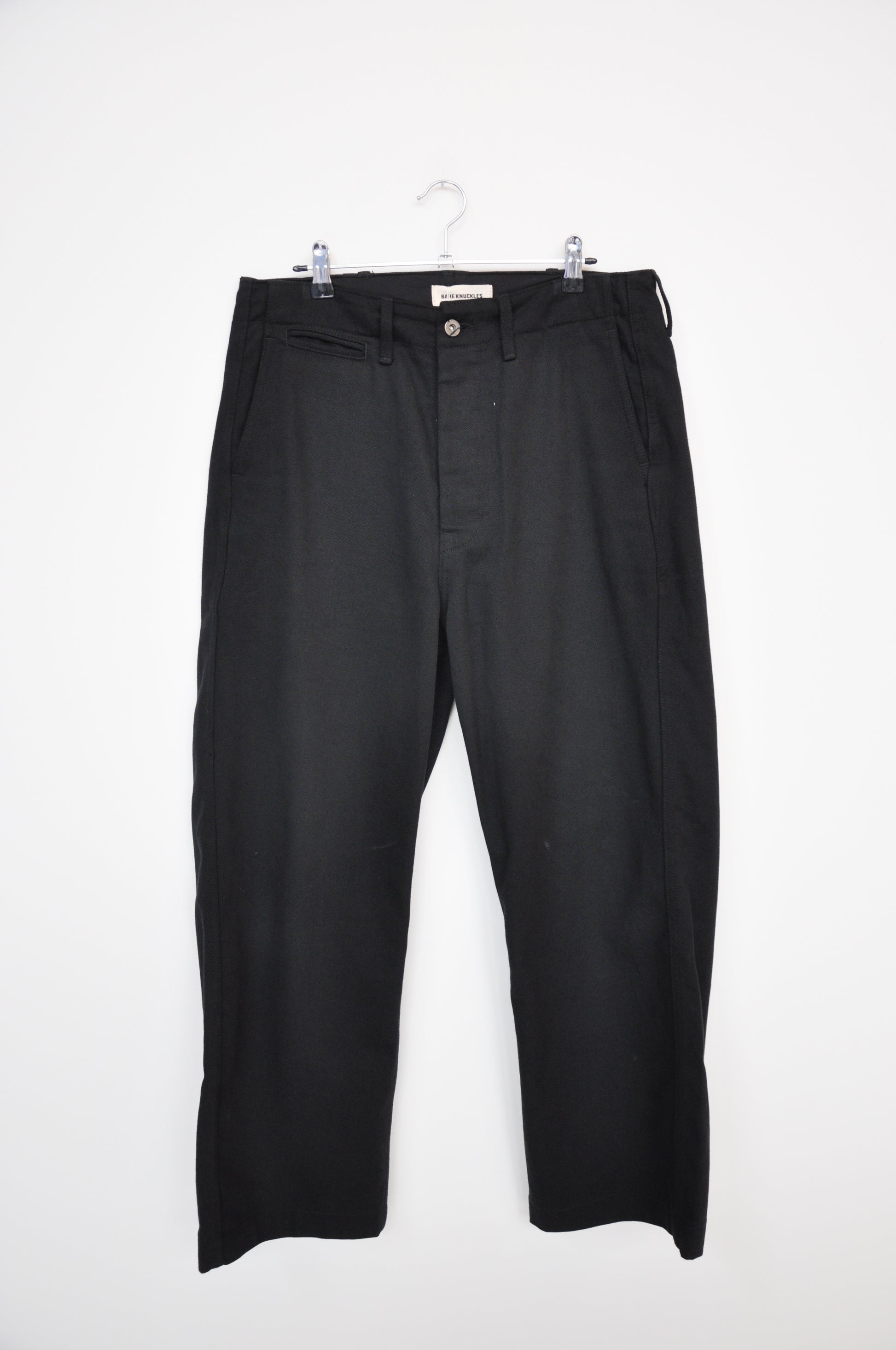 Wide leg. Loose fit. One slit pocket detail at the front. Two pockets at the back. By the brand Bare Knuckles.