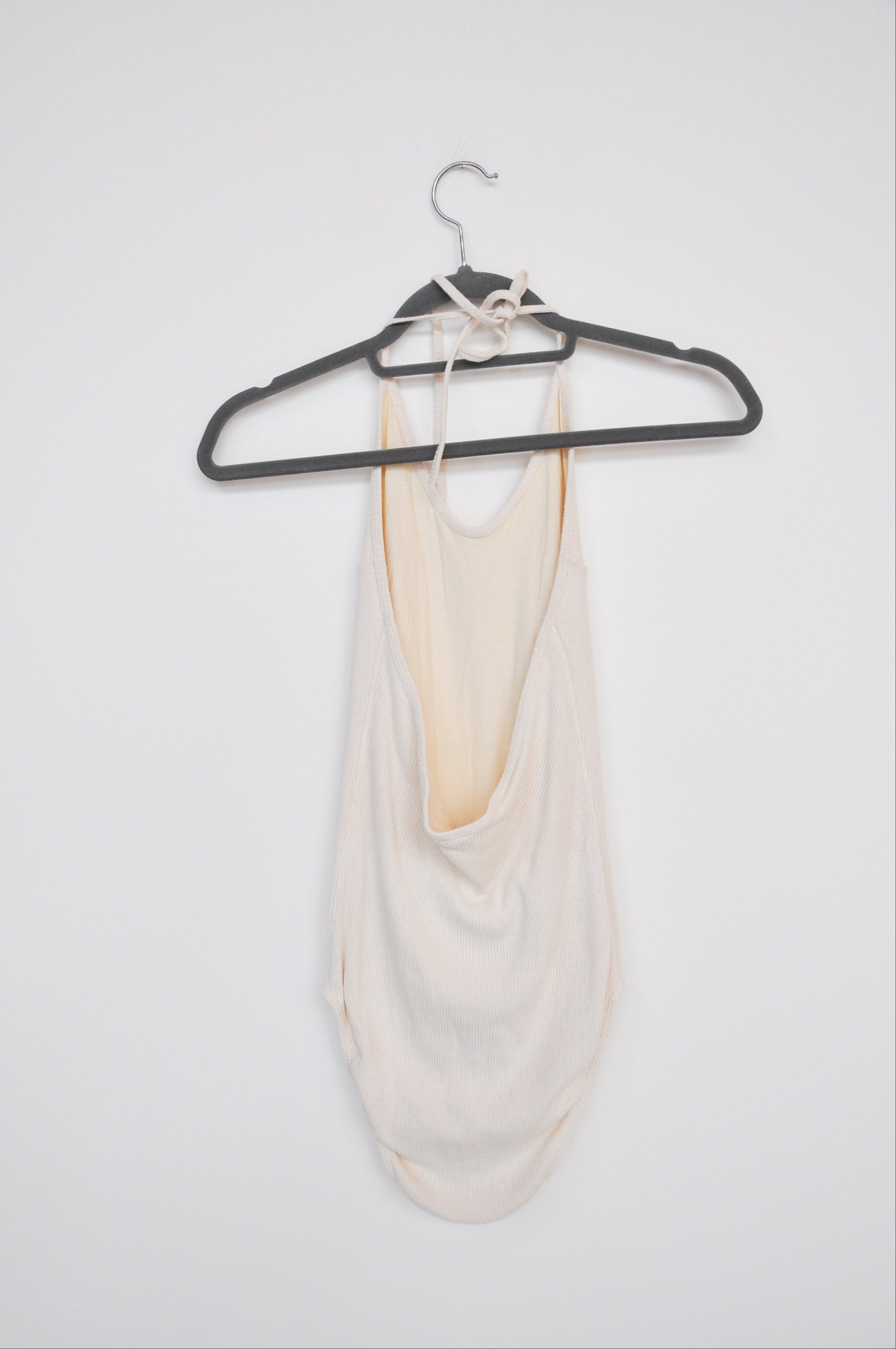 Ribbed halter One Piece. Undyed cotton. Ties at the neck. Button closure at the base. By the brand Baserange.