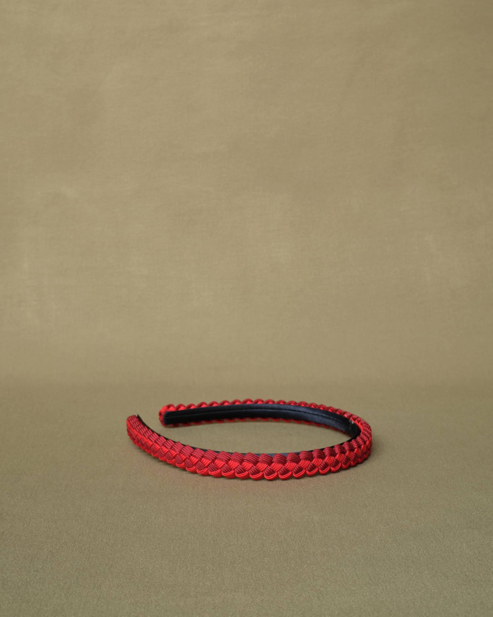 Braided headband by Ola Ro. Features contrasting colours of line-braid braided together on top of a flexible satin headband.