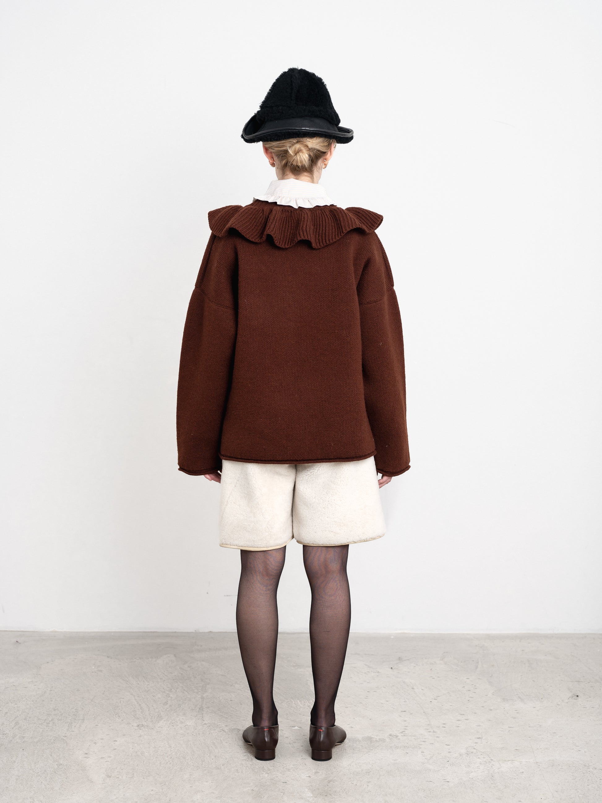 British Merino Wool Ruffle Jumper in Bordeaux - the ruffle jumper is a playful oversized pullover, knitted from 100% merino wool. it features a crew neckline with an added whimsical ruffle detail. rolled welts and a split side hem finish the relaxed silhouette.