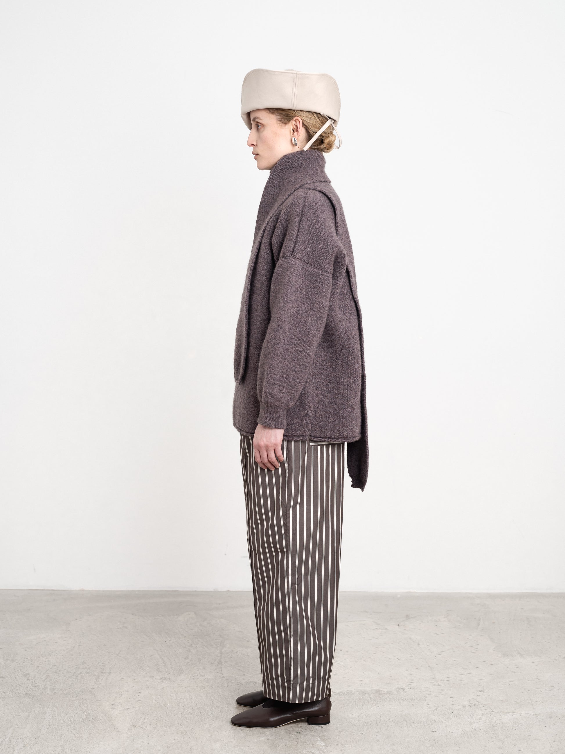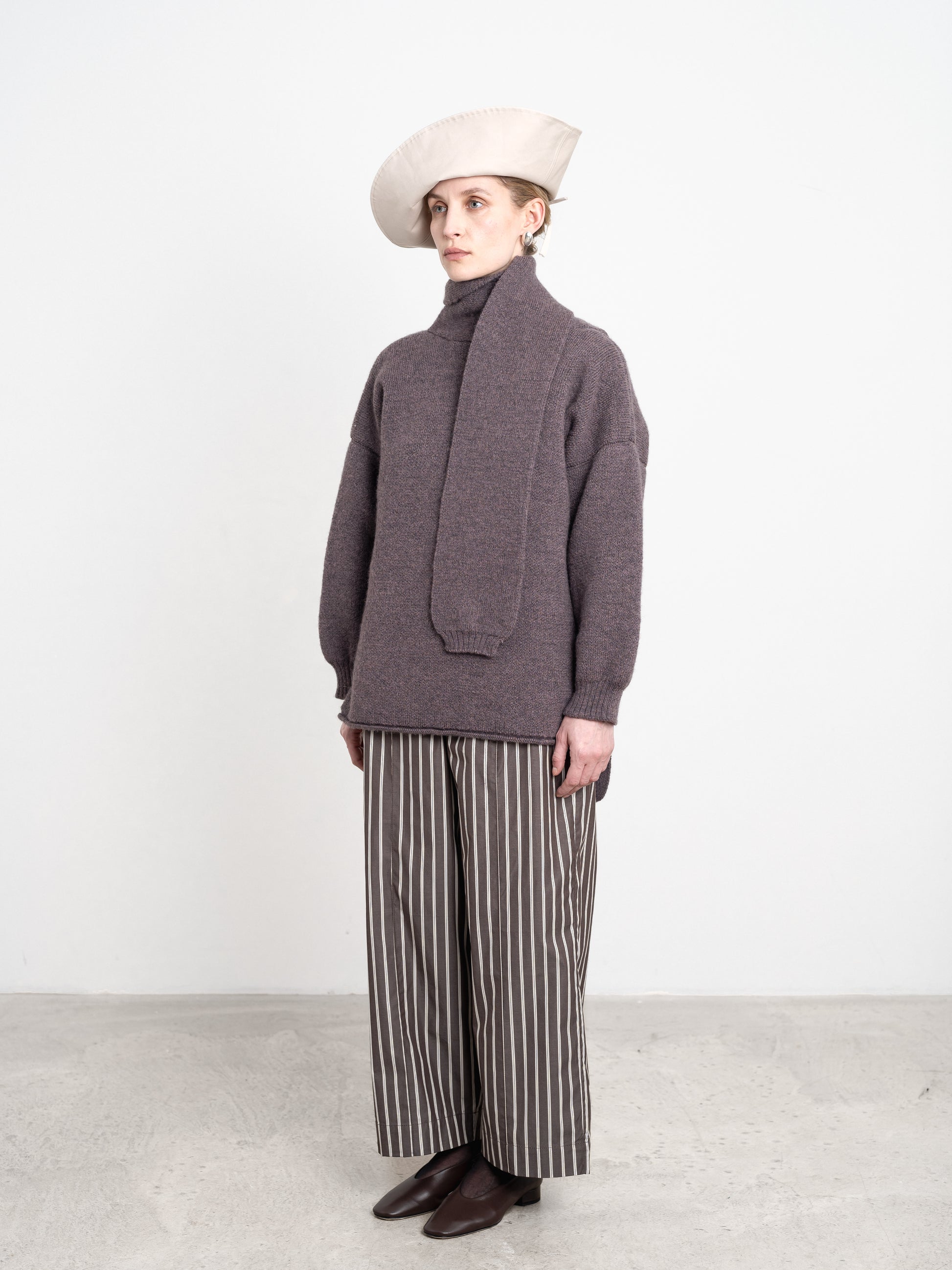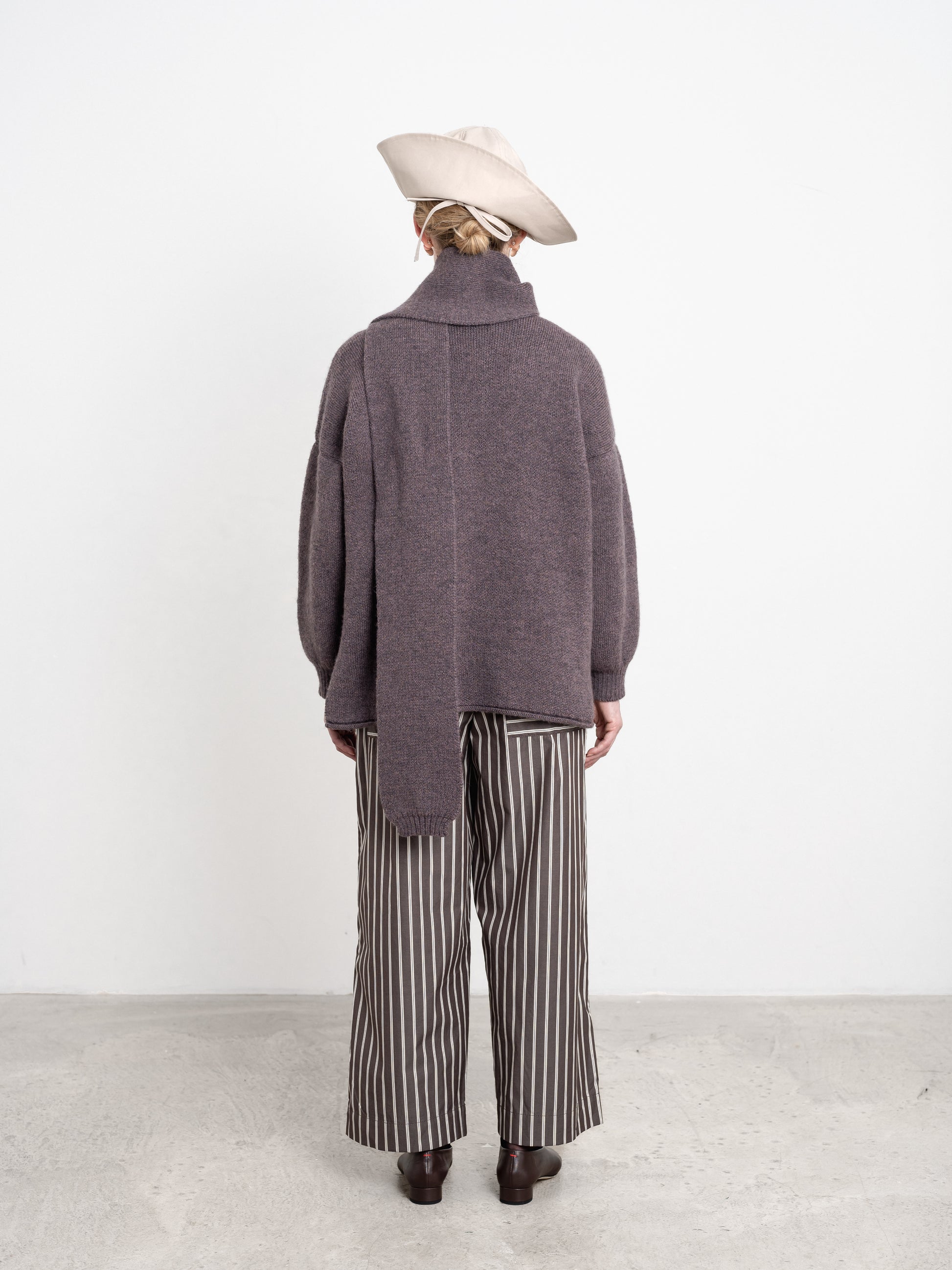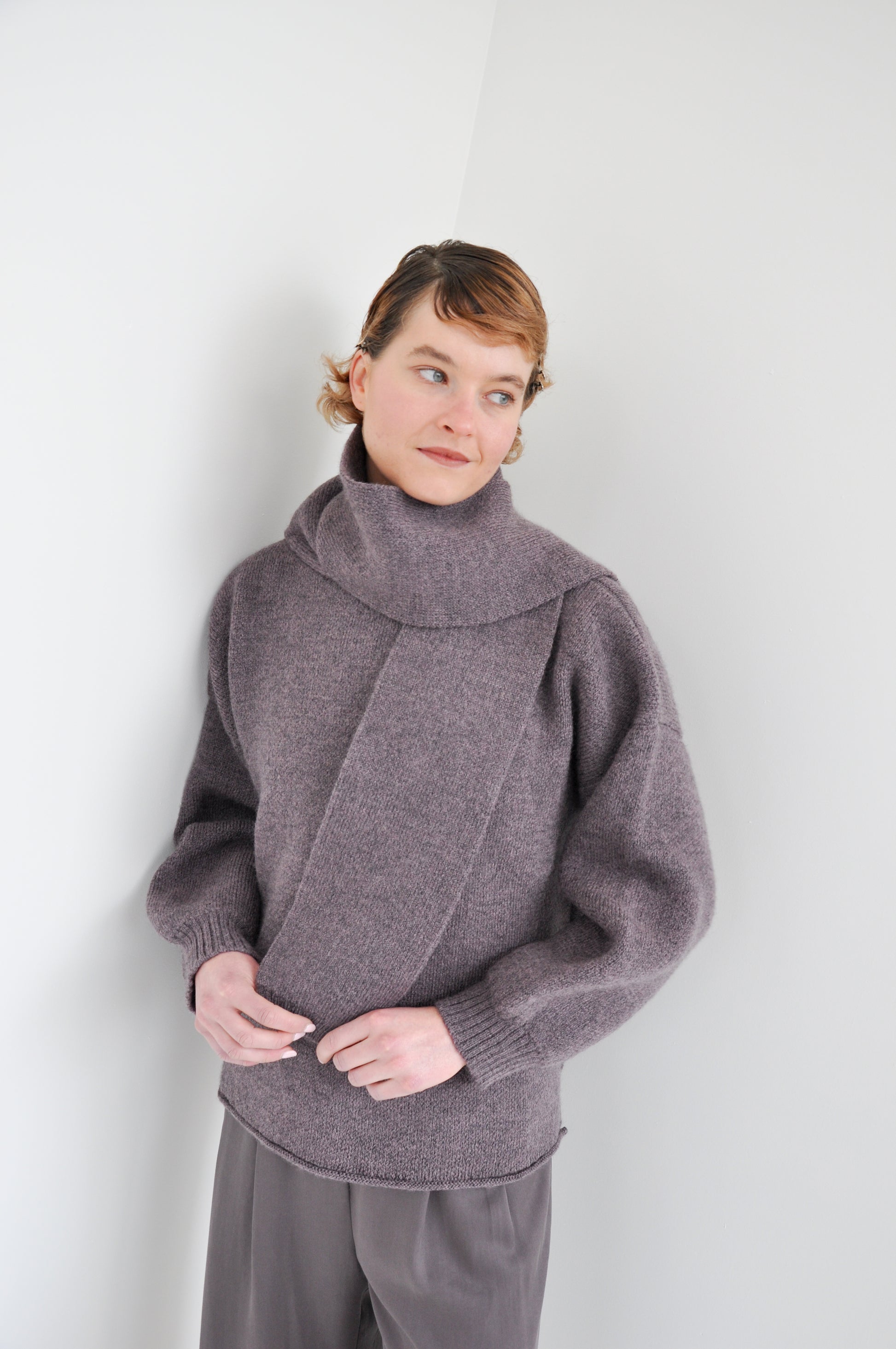 British Merino Wool Wrap Neck Pullover in Luna - knitted from 100% merino wool, this jumper is designed with an integrated matching tonal scarf that can drape effortlessly or be tied around the neck. shaped to have an oversized and relaxed fit, the jumper is detailed with dropped shoulders, integrated rib cuffs, rolled hem and a split side seam.