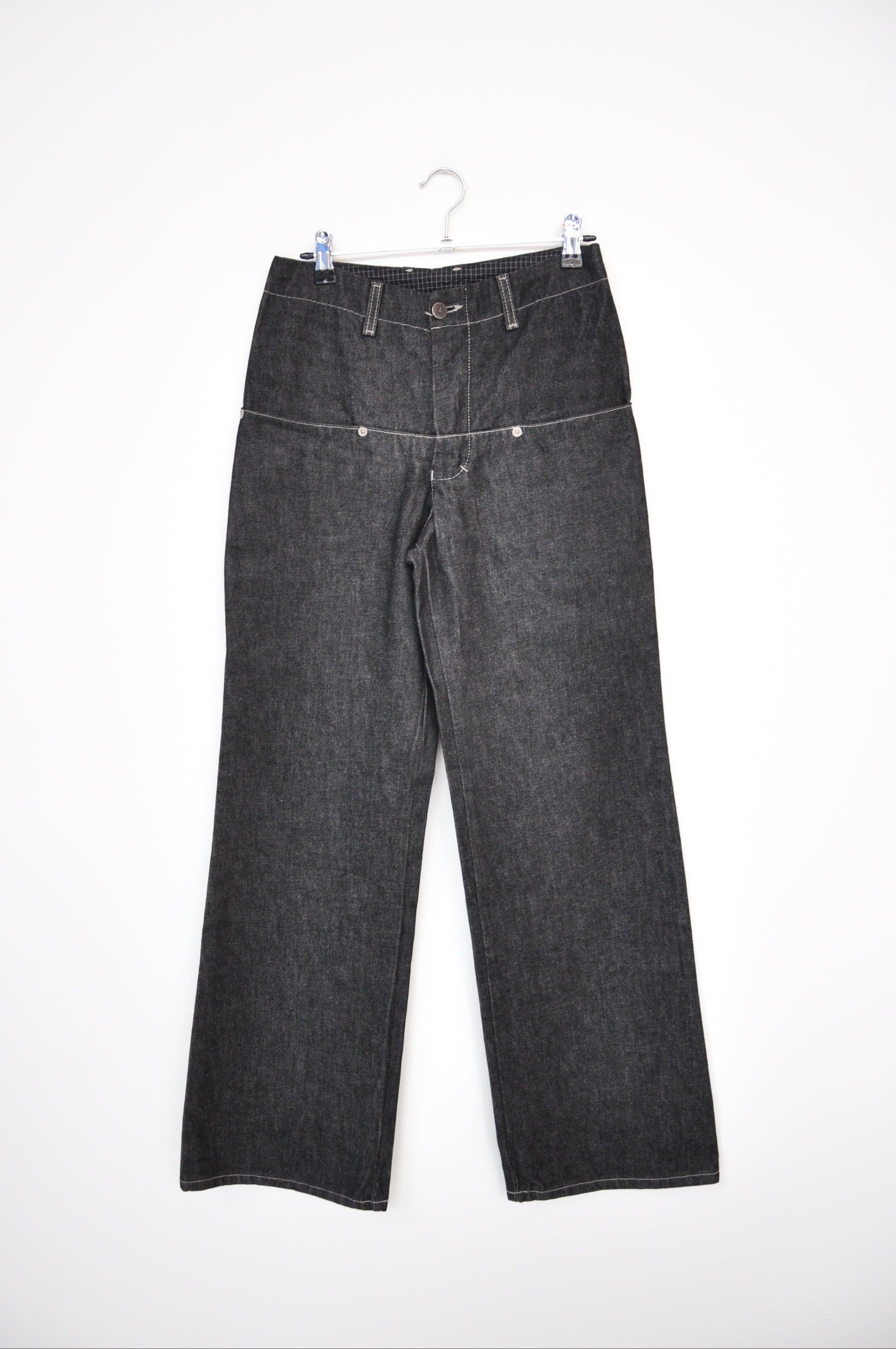 A straight leg jean in a dark denim, with white contrast stitch. This jean features pockets which are disguised as a stitch detail at the hip and back of the jean. By the brand Bug Denim in an 8.