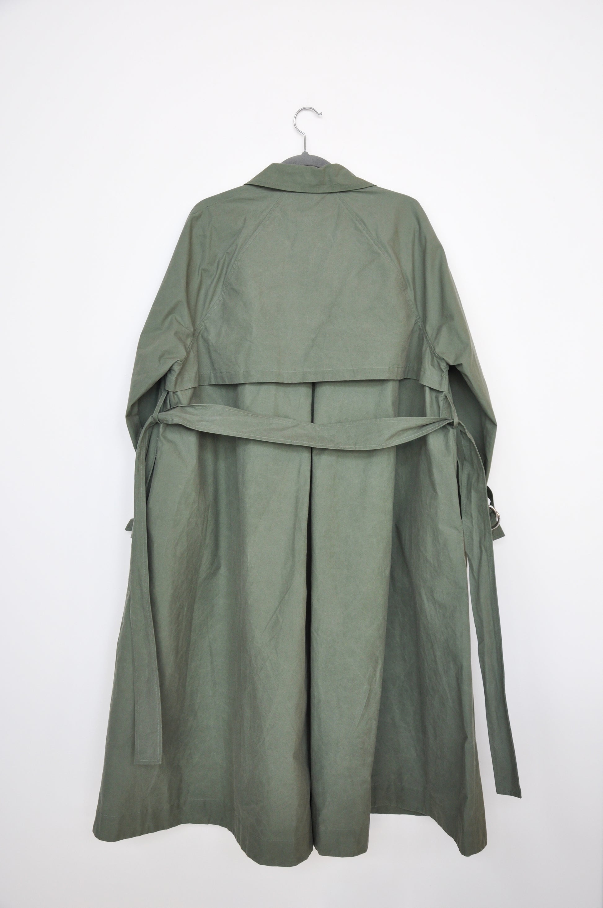 British Dry Oilskin Trench in Moss, perfect for rainy showers. An oversized style for layering underneath, it features a back storm flap, two front flap pockets with button enclosure, an adjustable button closure at the cuff so you can cinch the cuffs as desired, and a removable belt. Shower Proof. By the brand Cawley.