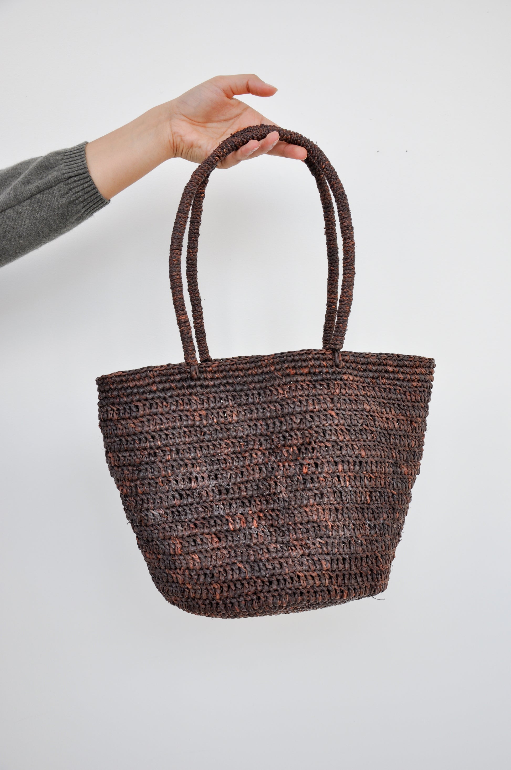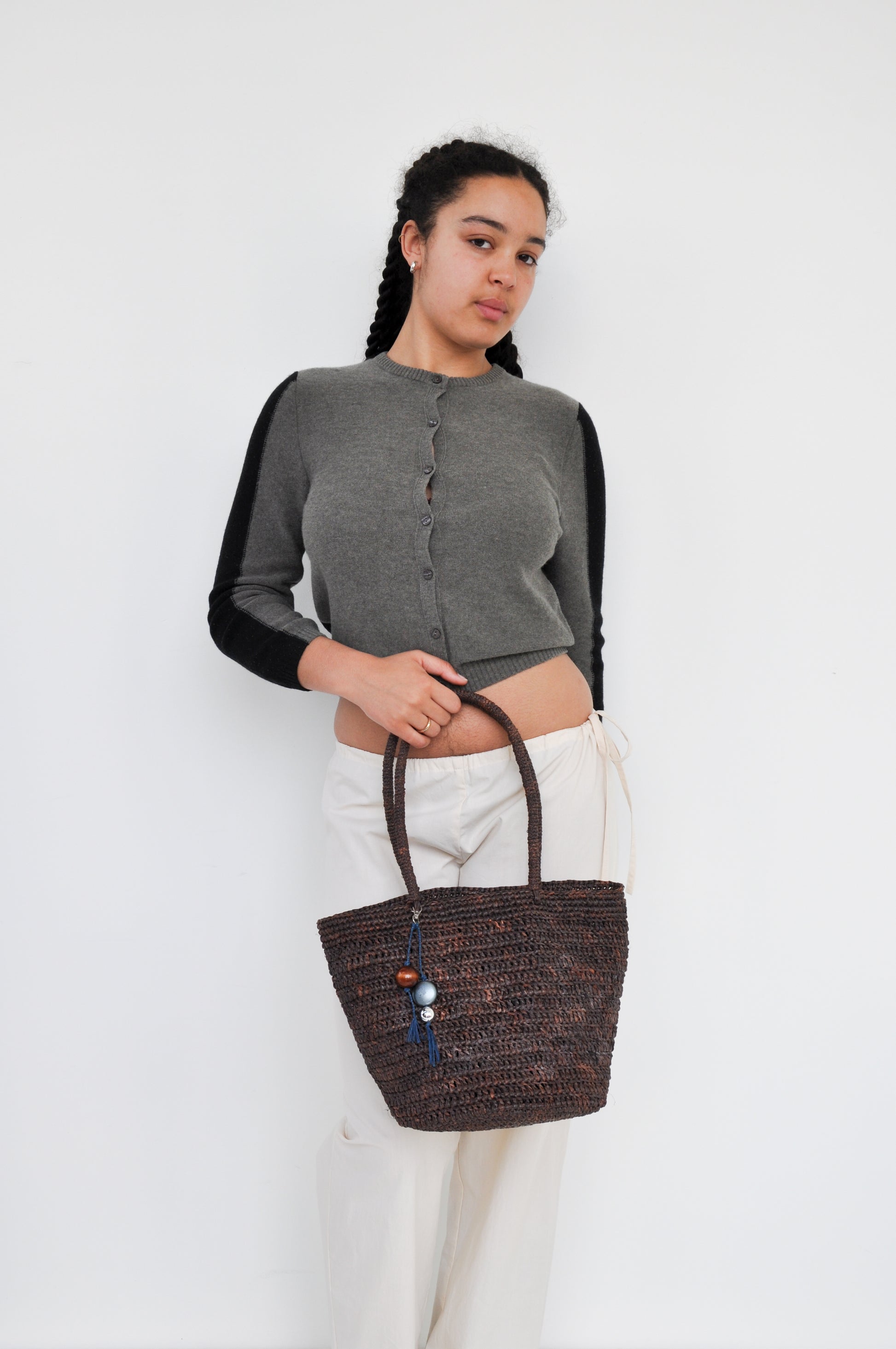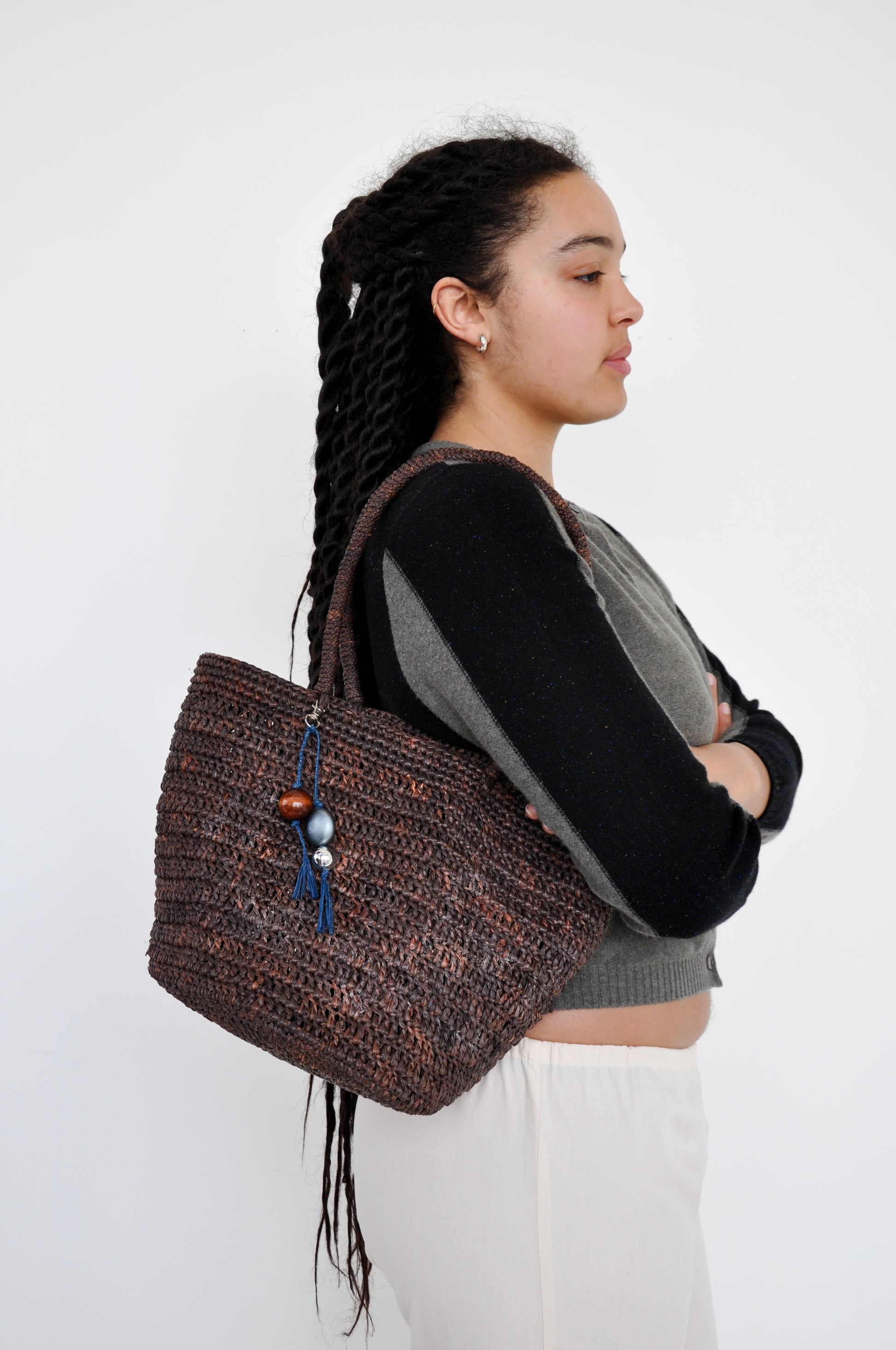 Classic Bucket With Charm in Mid Brown - A one-of-one hand crocheted bag made from hand dyed Raffia. Hand braided raffia cord and loop handle. This item includes a one-of-one bag charm.