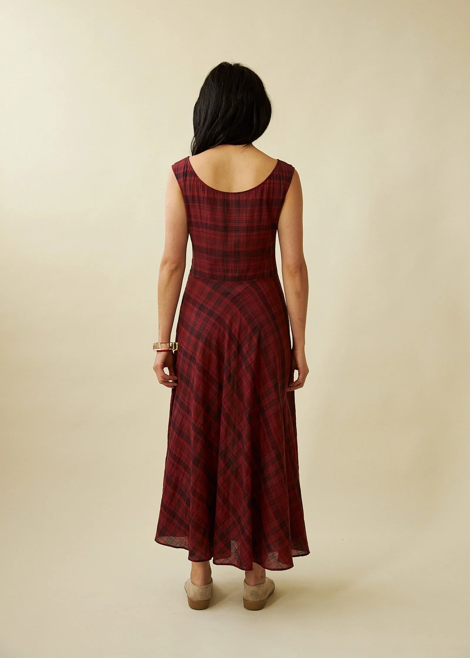 Slip Skirt in Vermillion Tartan a midi bias-cut skirt in a lightweight breathable summer wool gauze. Features a lingerie-inspired exposed elastic waistband.
