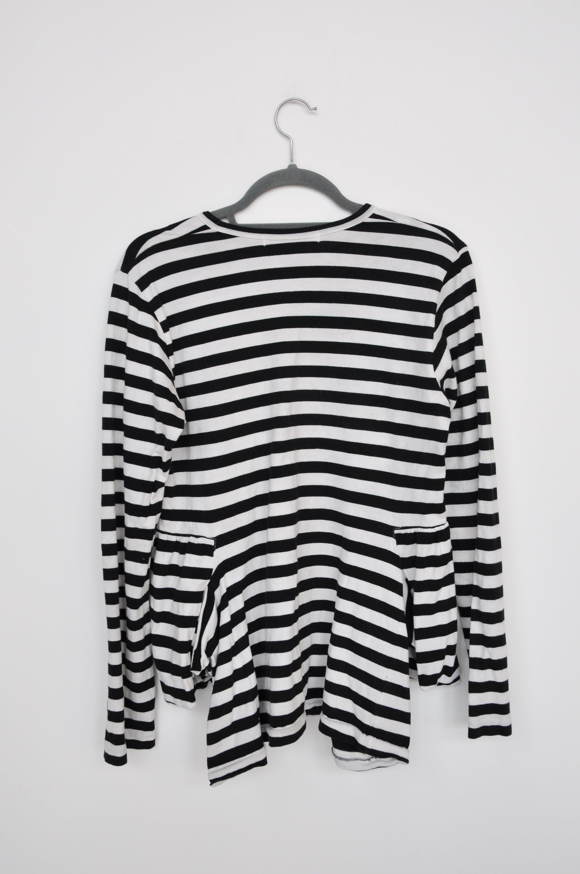 Long sleeved, black and white striped top. Round neckline. Ruffled peplum-style hemline on the sides. By the brand Comme Des Garcons.