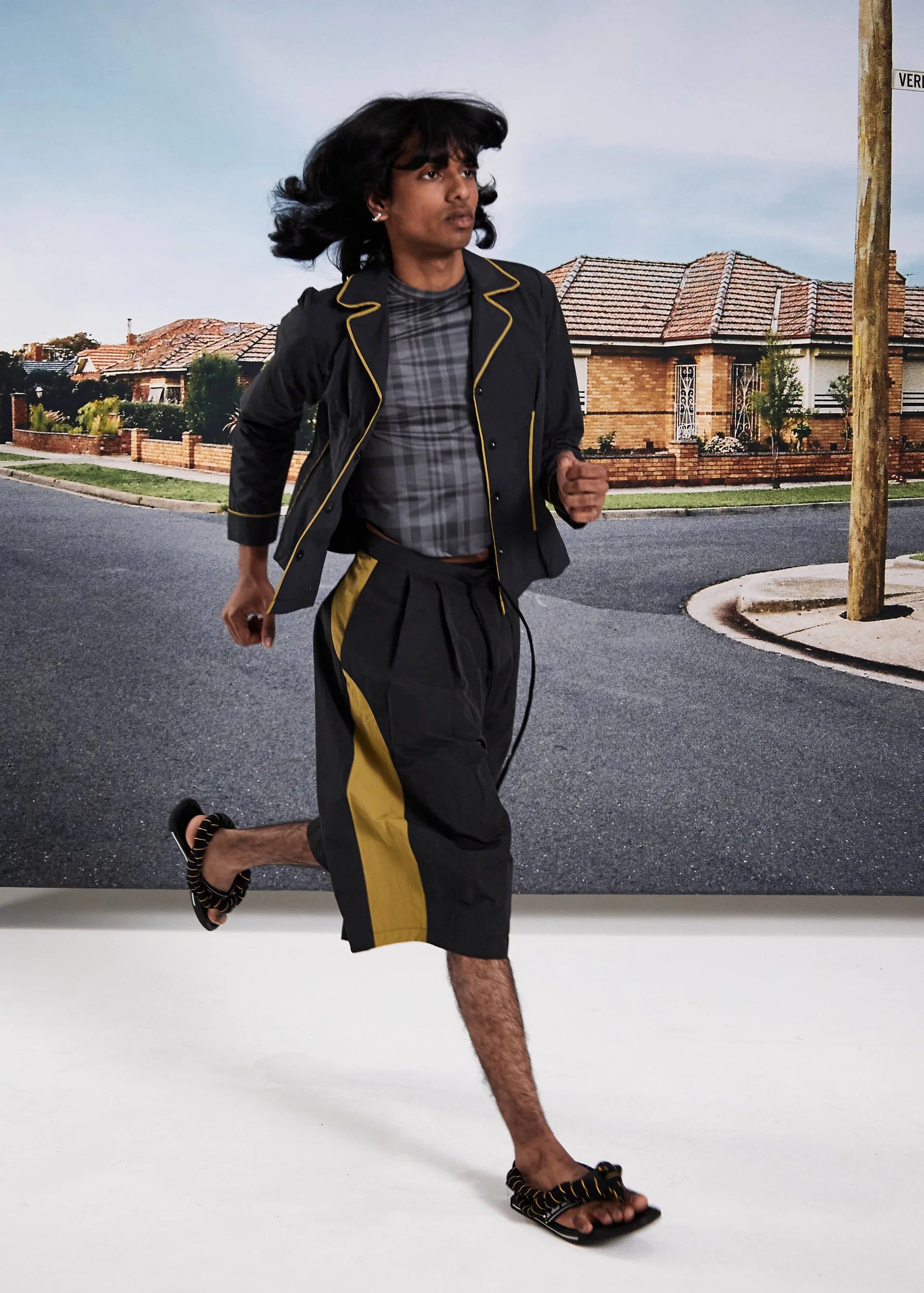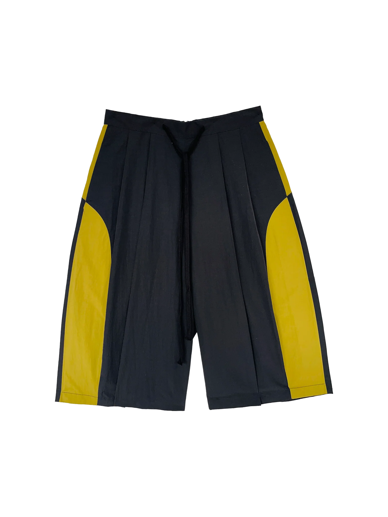 Contrast Short in Black & Khaki, a Knee-length, wide-leg shorts with a pleated front waist. Features a partly elasticated back waistband, drawstring for added comfort, centre-back zip, and in-seam pockets. Two-toned contrast colourway on the side and back arch detail. Constructed from a premium cotton-nylon blend for breathability and durability. Model wears size XS.