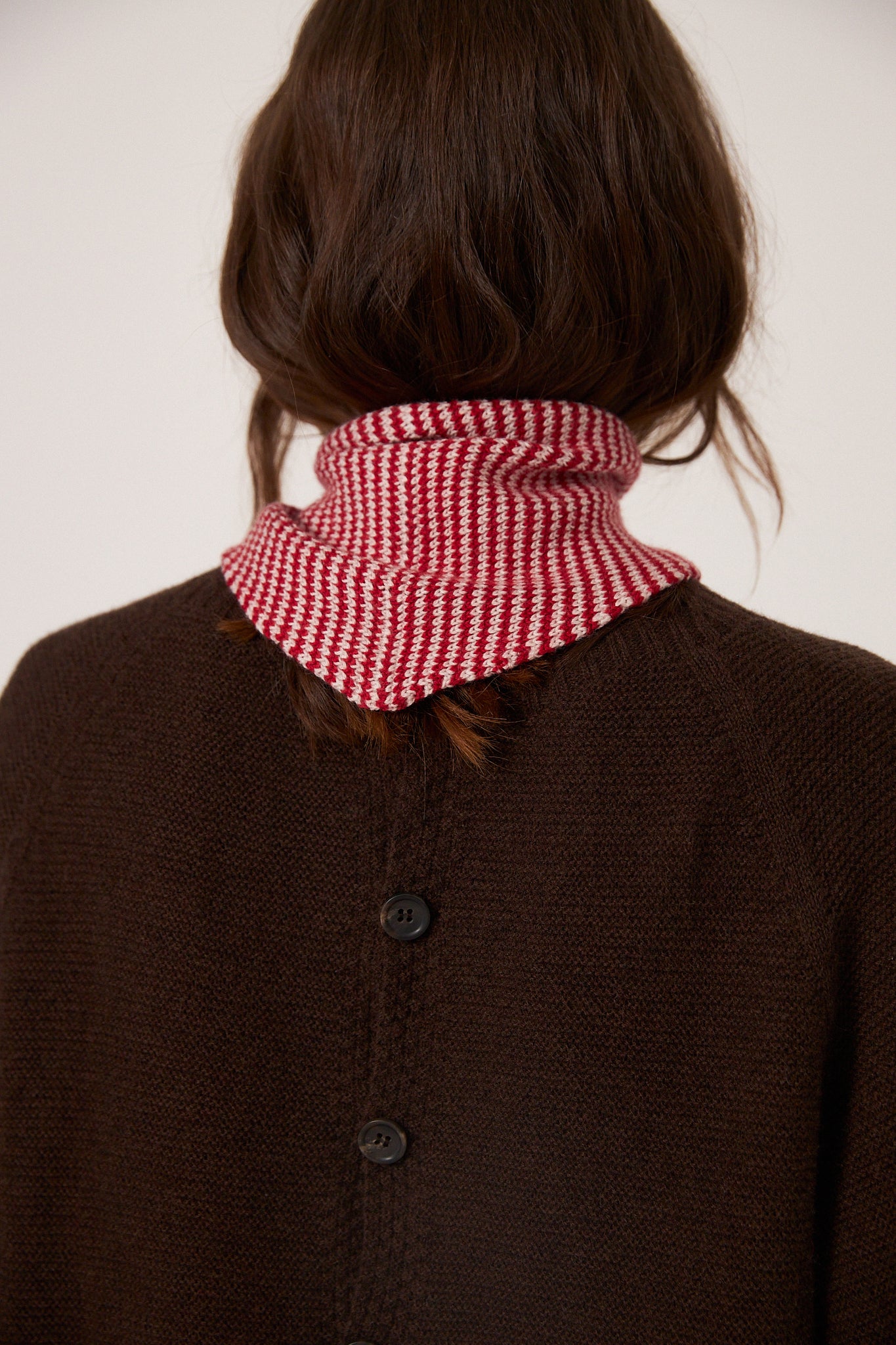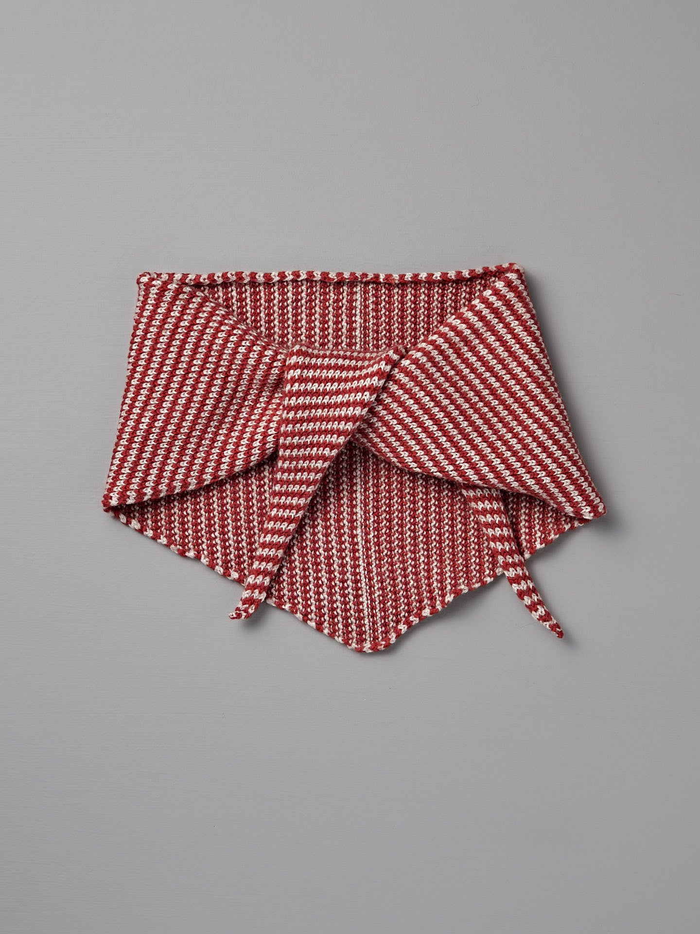 Daisy Scarf in Cherry, Creme Stripe - The nostalgic little Francie scarf, knitted in a chic stripe, can be worn in a multitude of ways. Knitted thickly enough to provide soft, breathable warmth when tied twice around the neck, yet light-weight enough to be worn as a headscarf too.