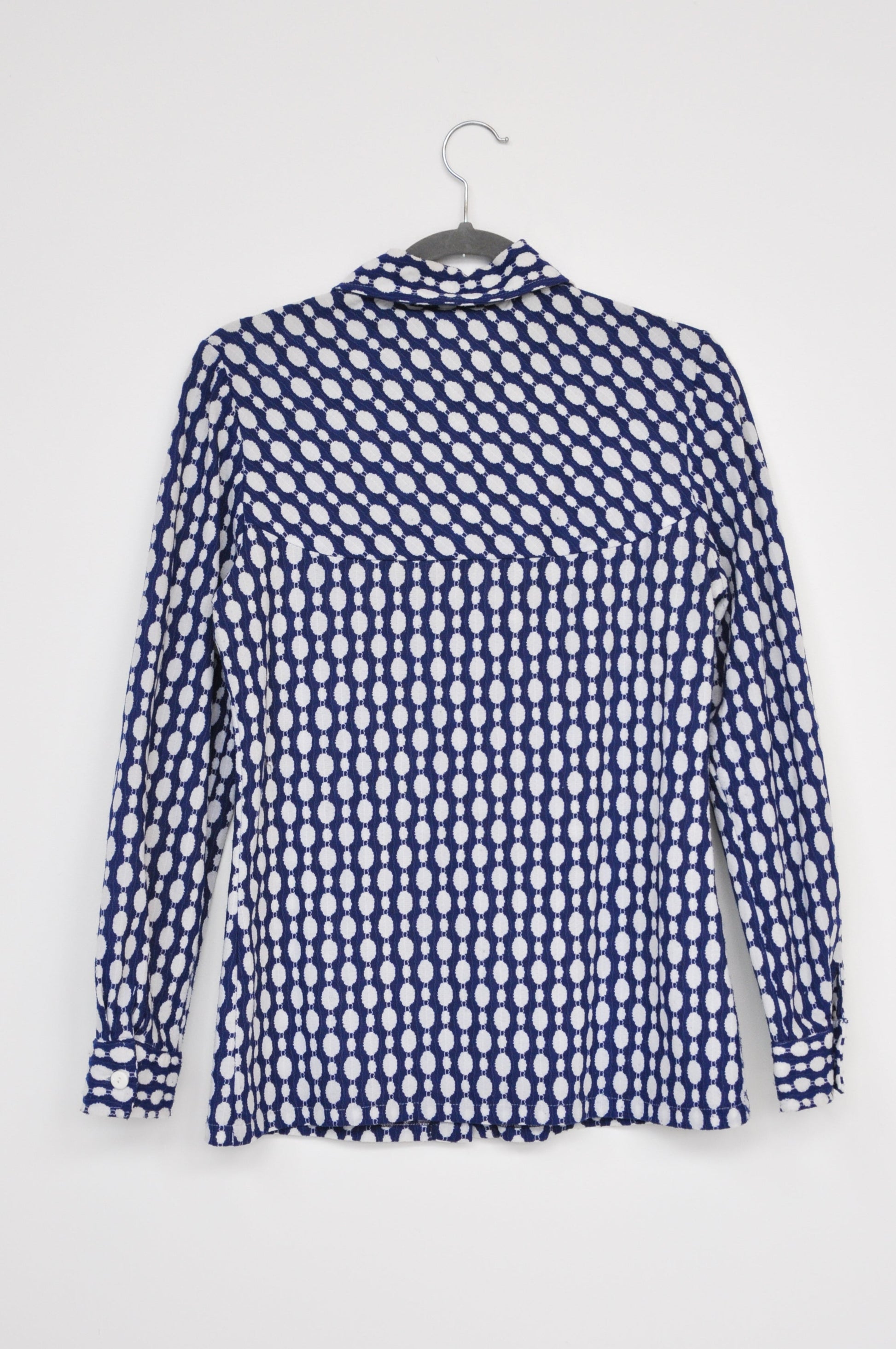 White button up detailing. Pointed collar. Abstract polkadot pattern.