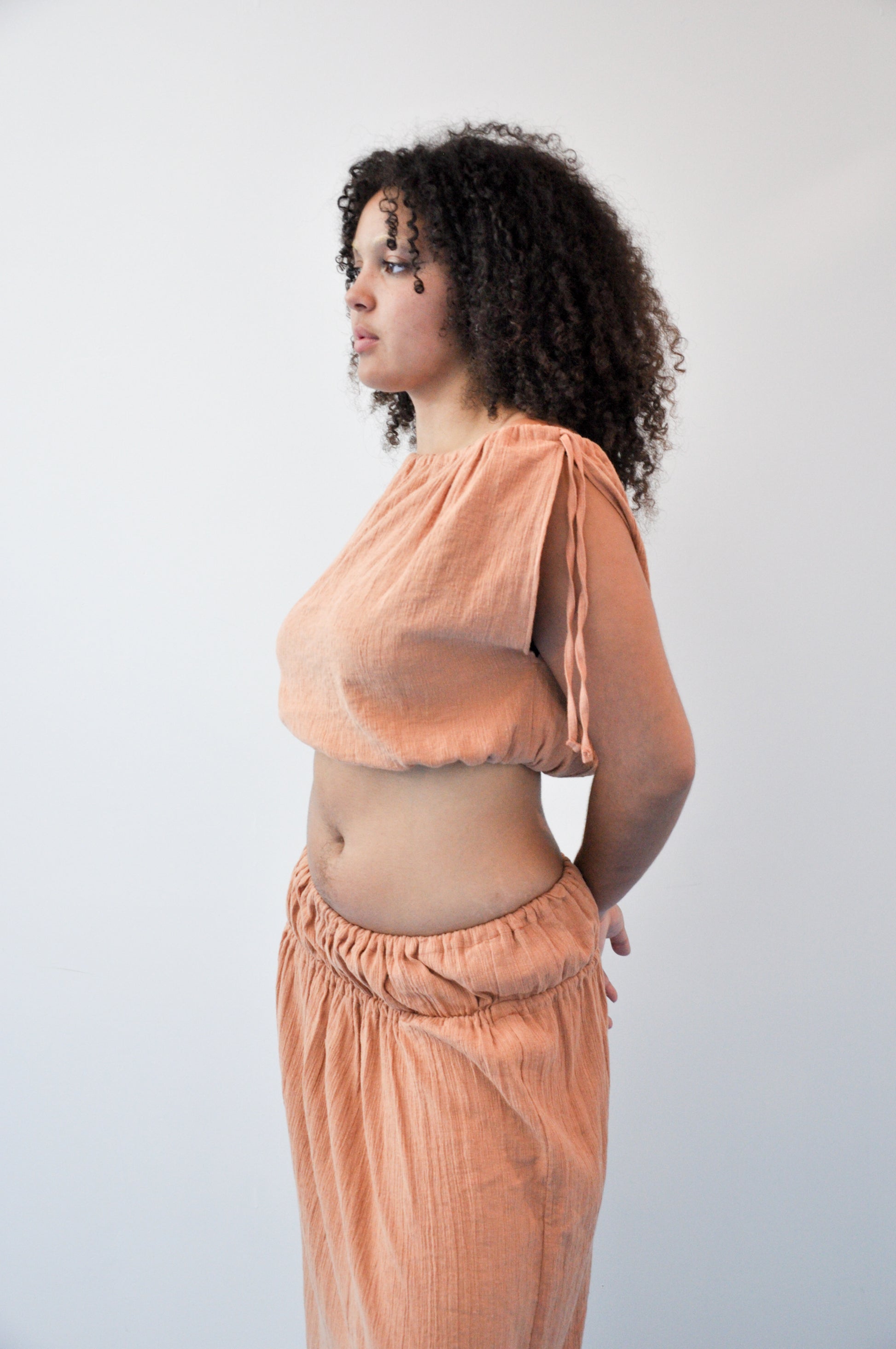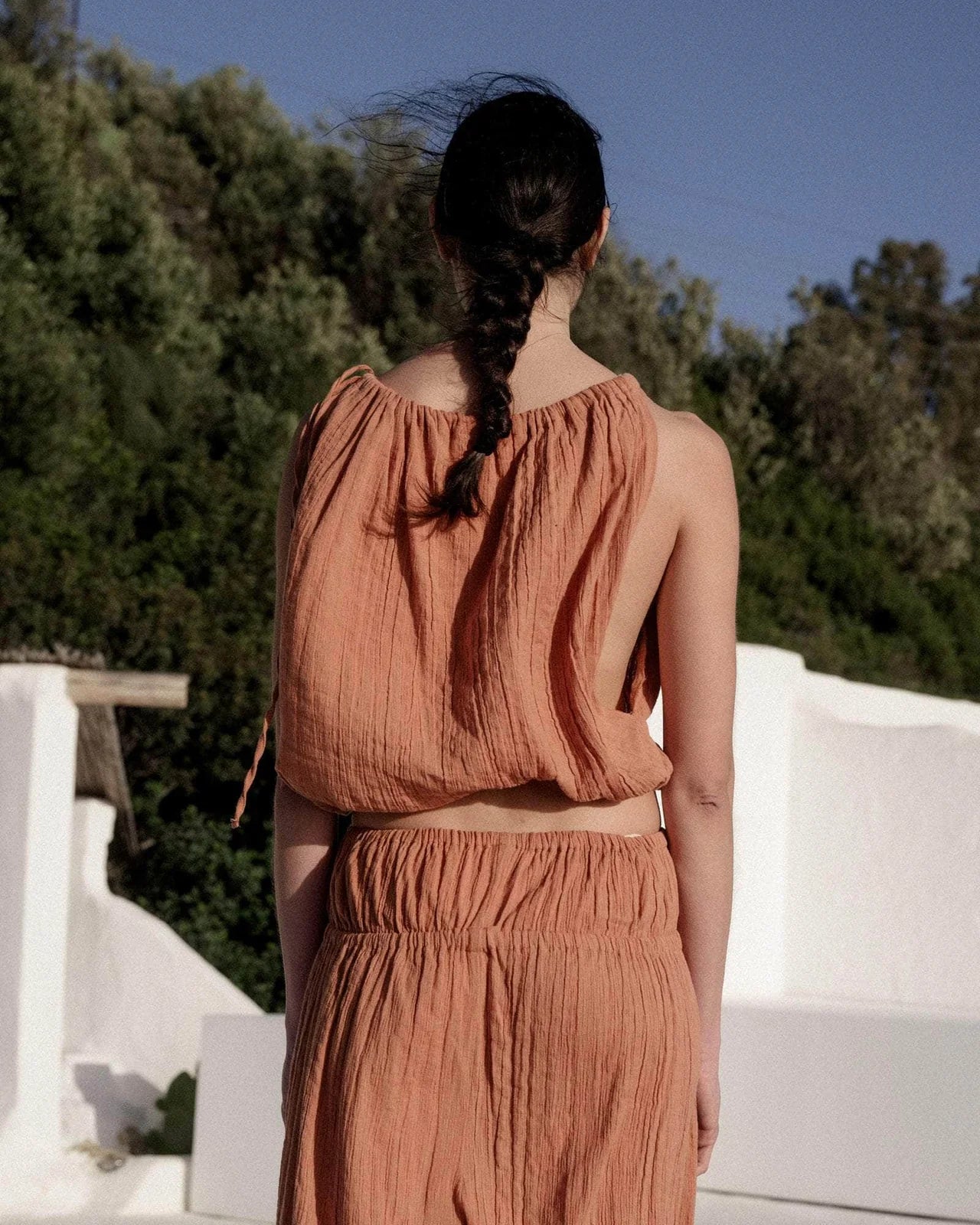 Diph Top in Brick, a linen cotton top in a Crinkle Linen featuring a boat neck, ties at neck and elasticated gathers at waist. Can be worn multiple ways