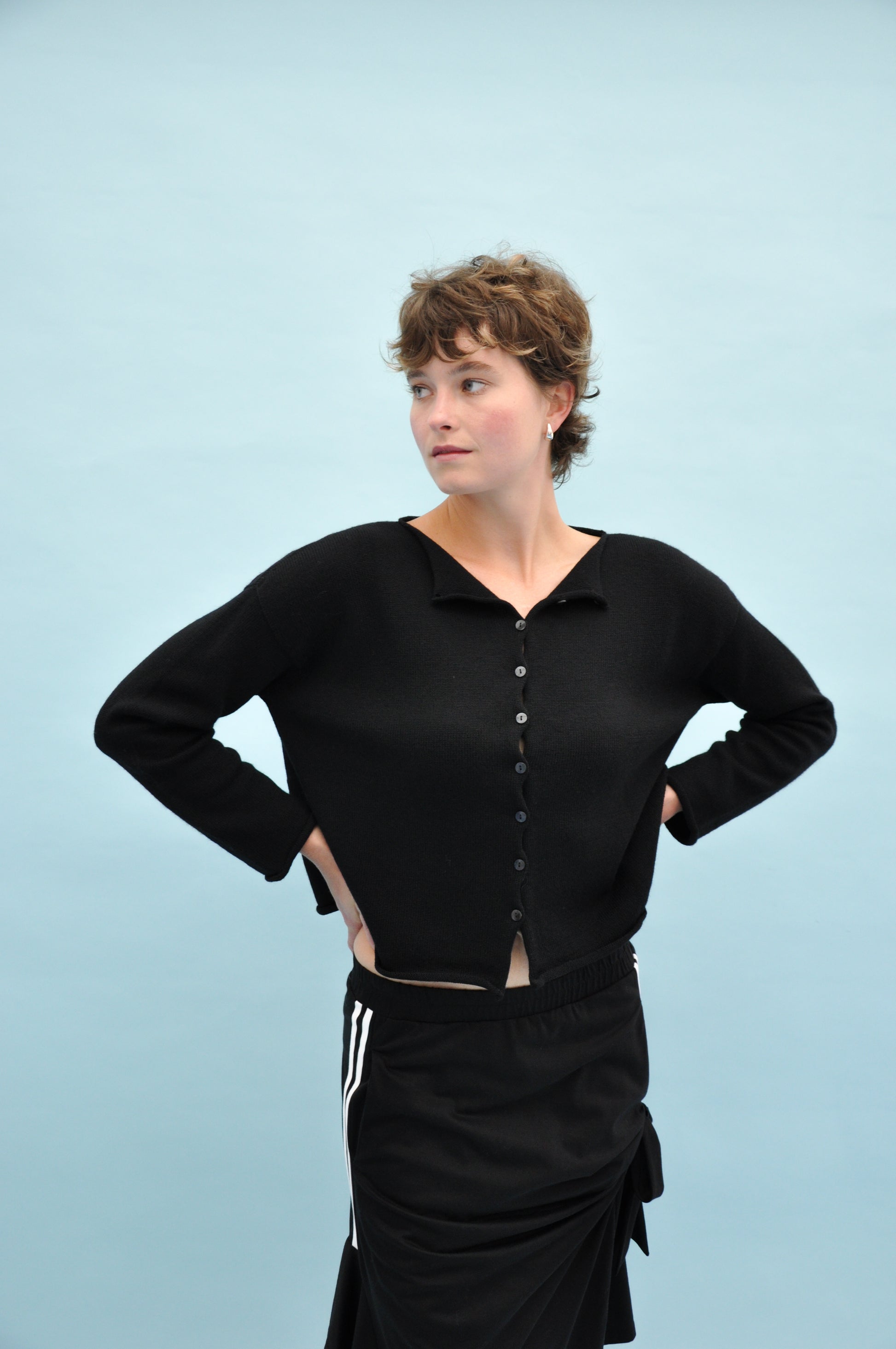 Doll's Reversible Cardigan in Black with it's dainty little Japanese buttons, the Doll's cardigan is two garments in one. Wear it with the buttons at the front as a cardigan, or with the buttons down the back as a jumper. The doll's cardigan features a drop shoulder, a boxy yet cropped fit, and a boat neck.