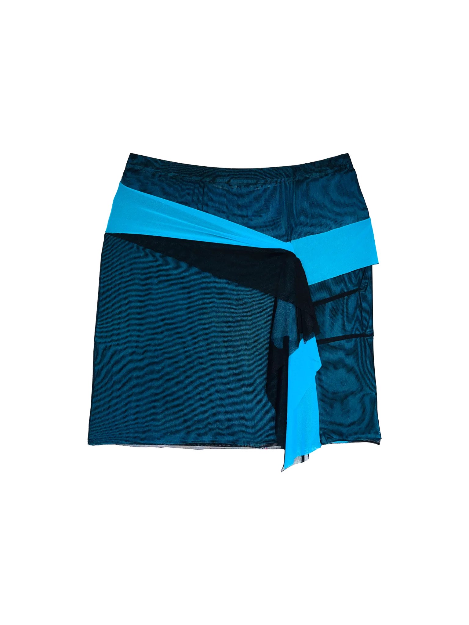 Double Layer Mesh Mini in Black over Blue, a multi-layered draped mini skirt. A complex construction in contrasting coloured layers of soft, lightweight mesh. Close fit with an elasticated waistband.