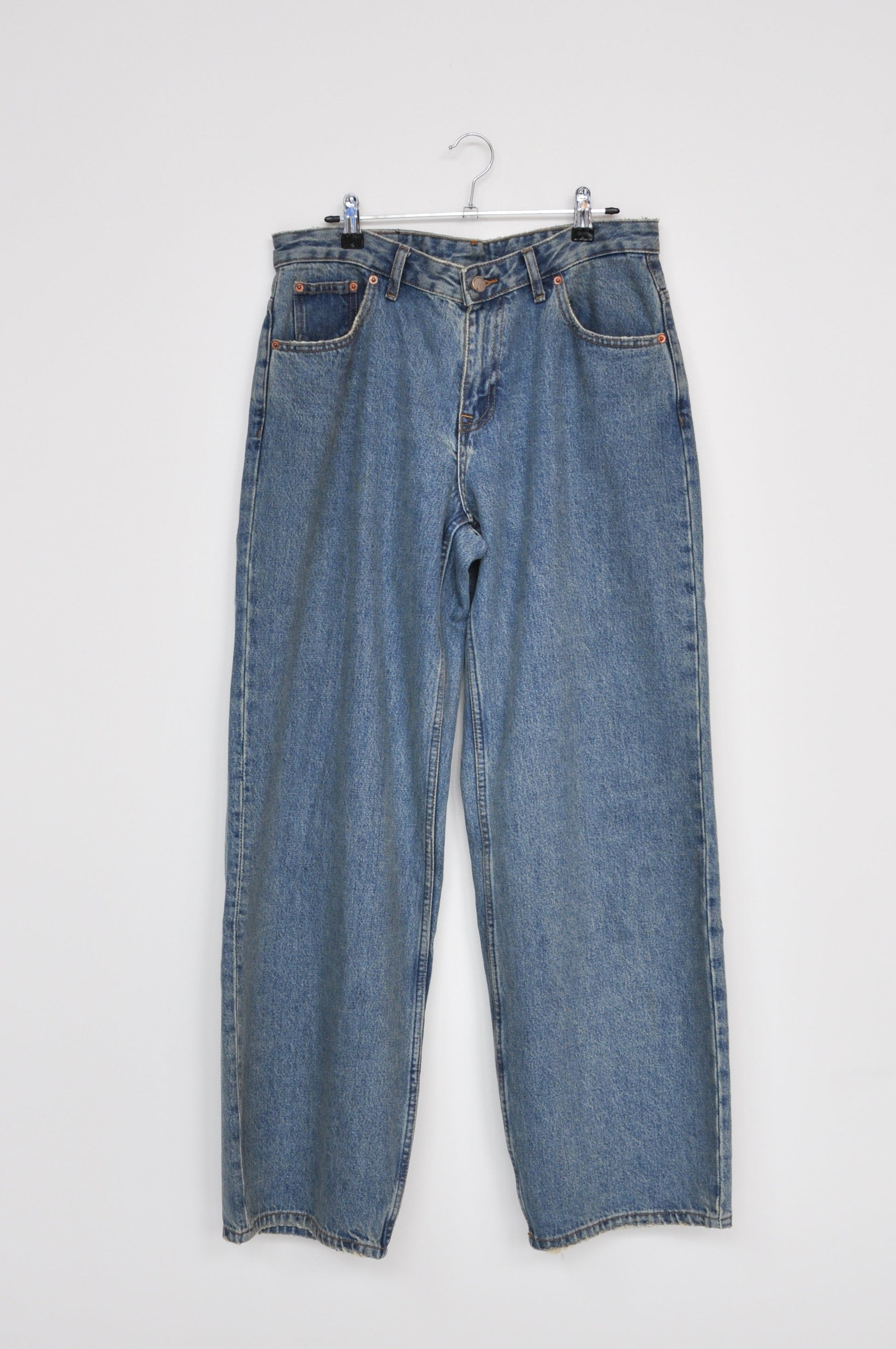 Wide leg. Zip fly button up. Straight leg. Belt Loops. Loose fitting. By the brand DrDenim.