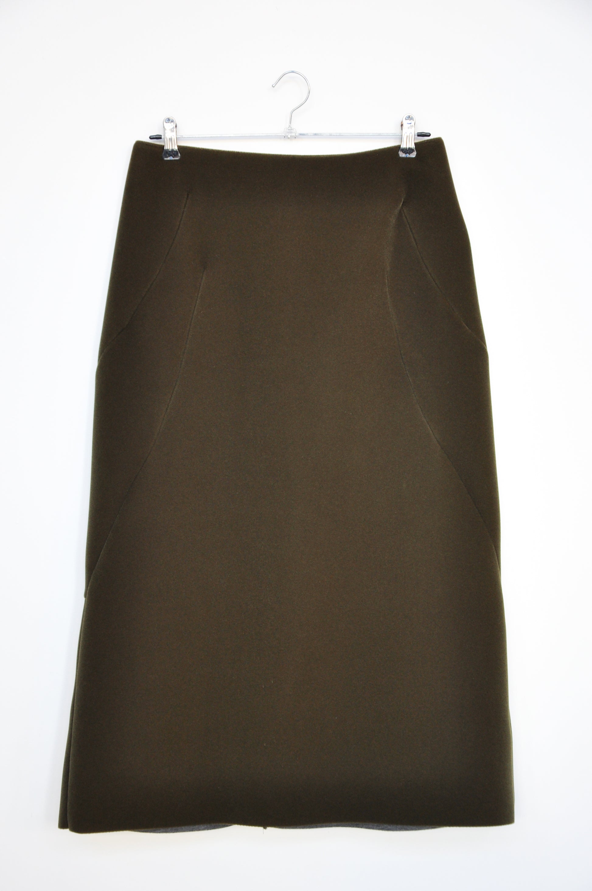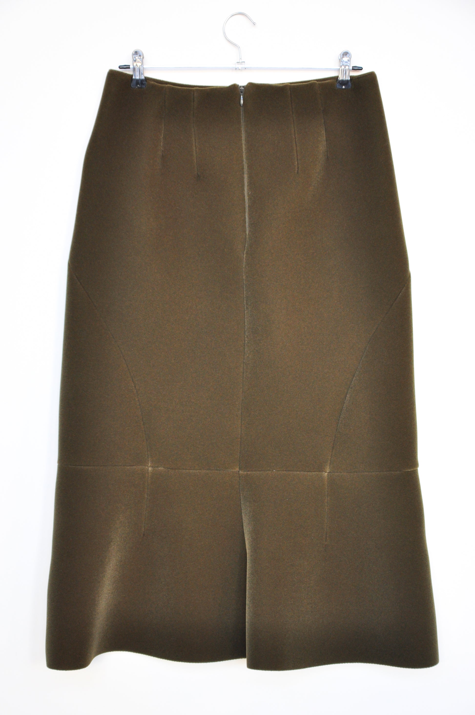 Pencil style skirt. Hidden zip at the back. Velvet like fabric. Abstract stitching giving it a unique structure. By the brand Dries Van Noten.