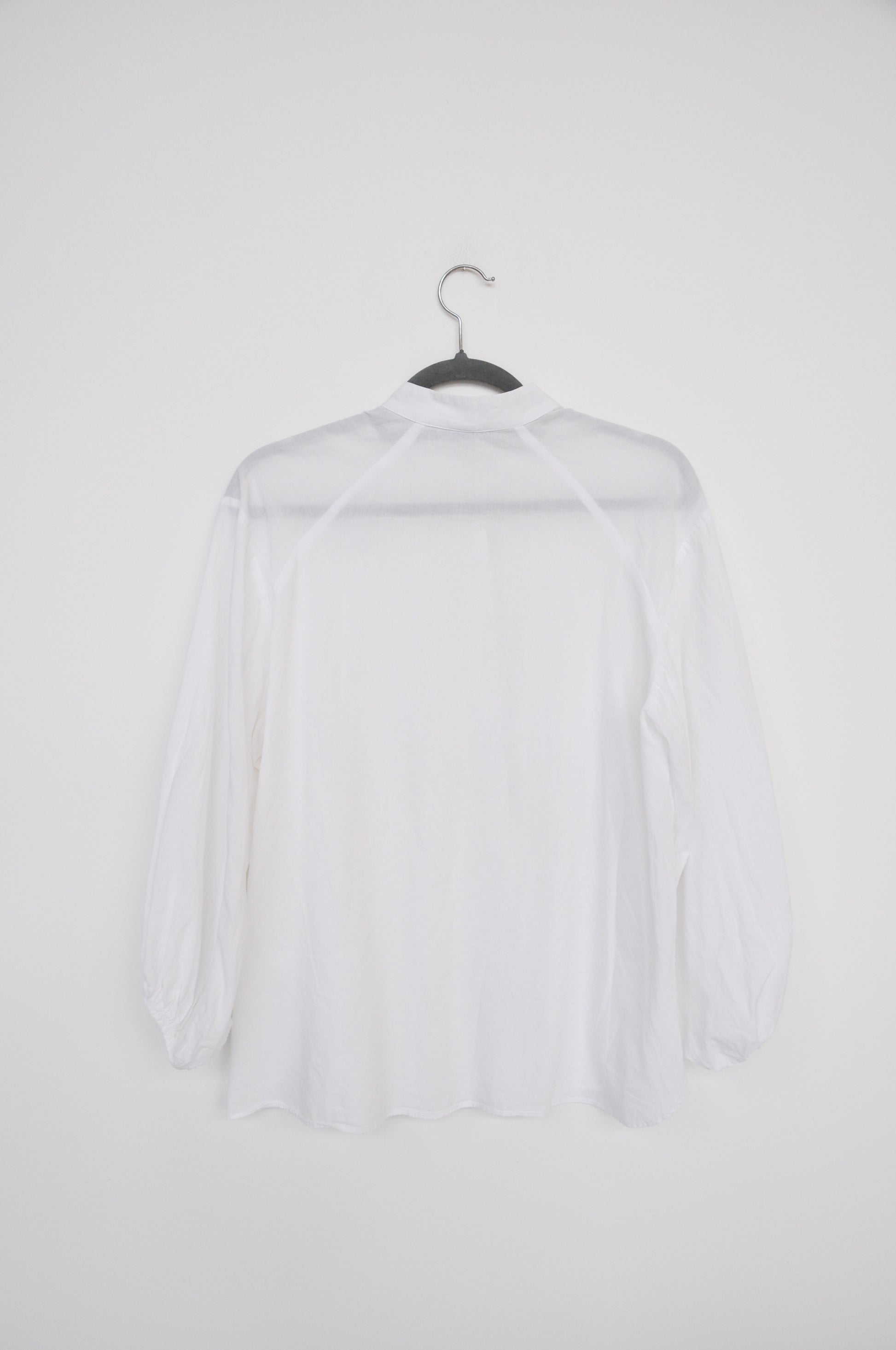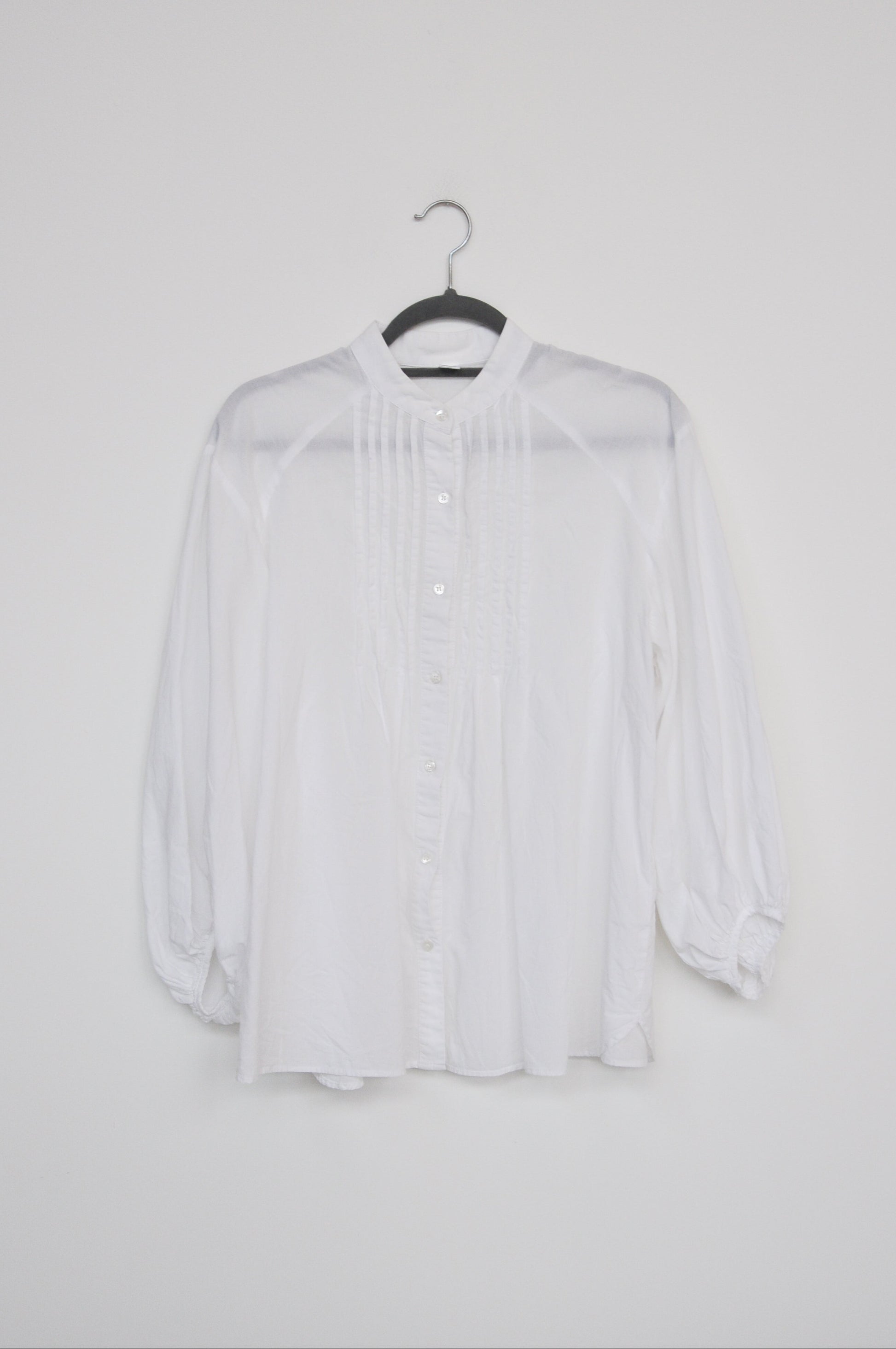 Long sleeve blouse. Pleated folds at the front. Collarless. Tappers in at the cuff. Button down. By the brand Ellis.