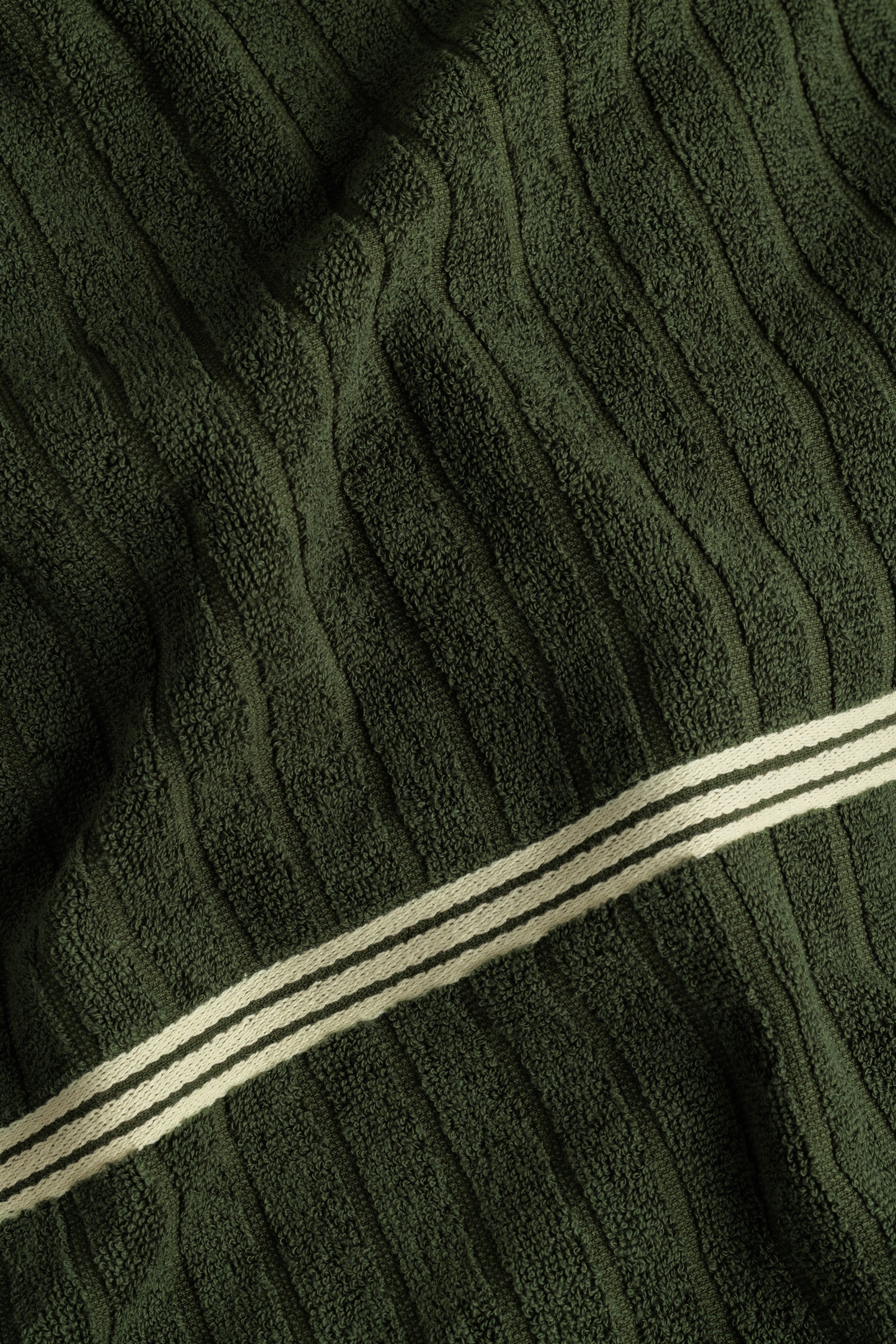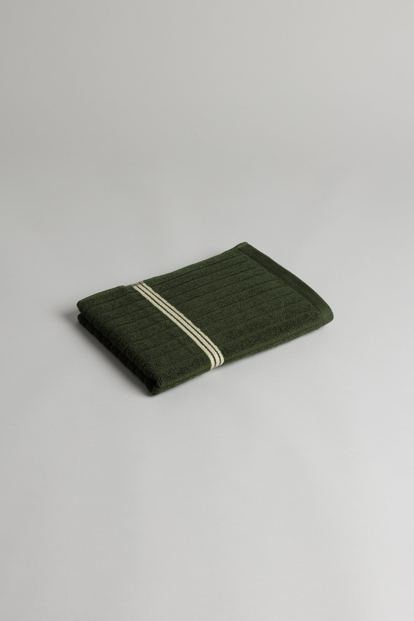 Emerald Hand Towel in Moss, a100% Organic Cotton hand towel with a luxuriously soft handle. Reminiscent of heritage club rooms, this towel is defined by textural moss rib accented by three crème stripes. Inspired by the spaces where an individual sits, inwardly connected to, the post-match exhale.