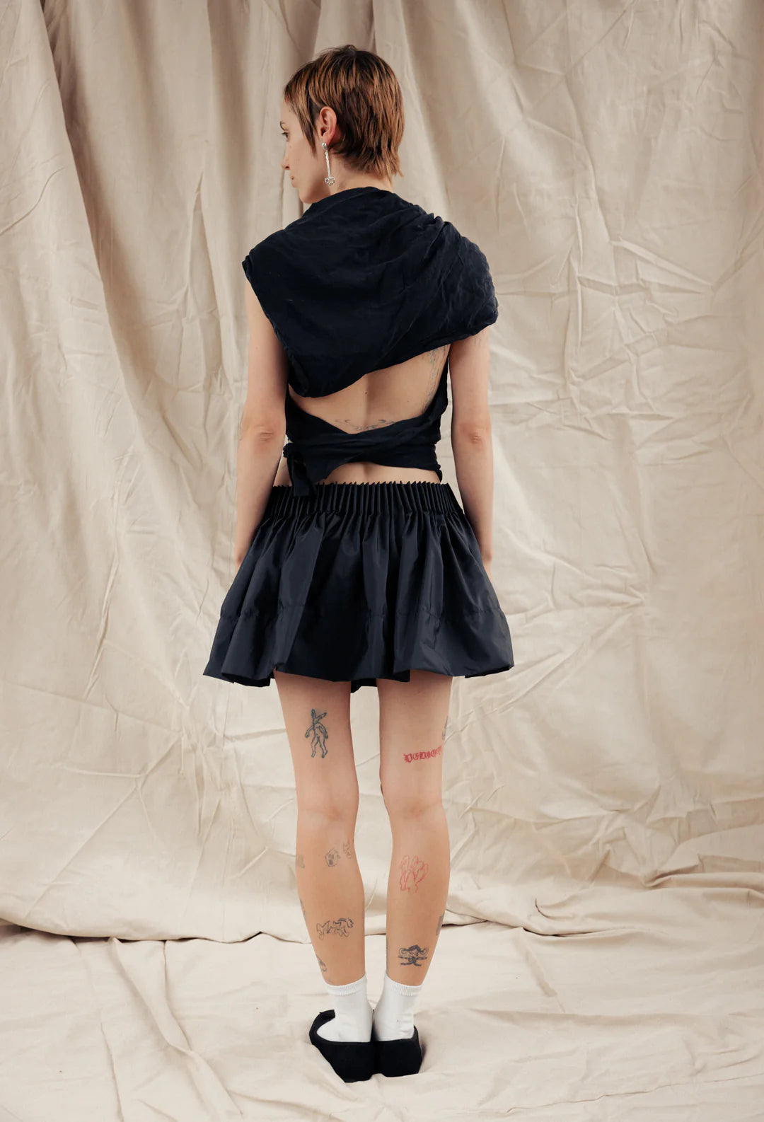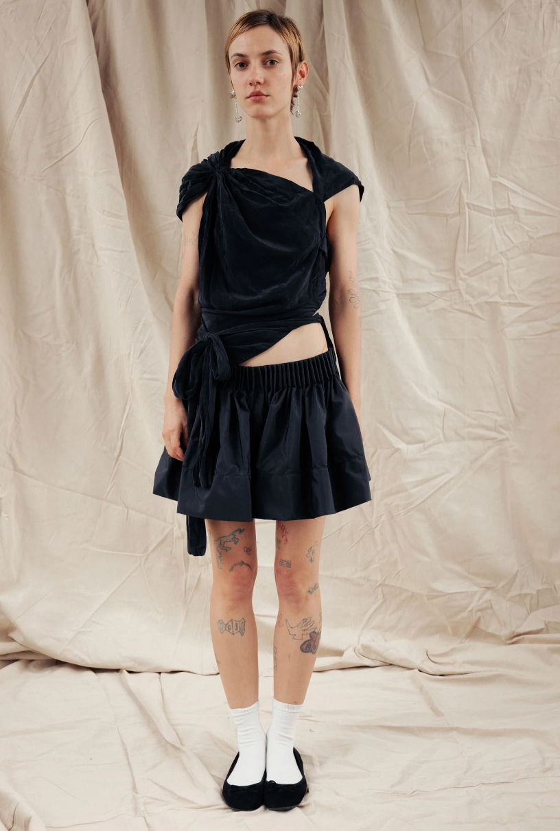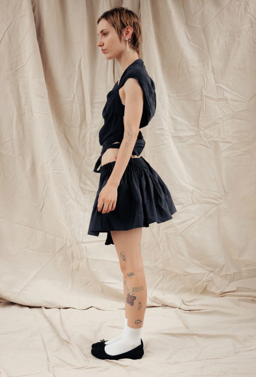 Eva Top in Black is an asymmetrical wrap-style blouse made from silk. Featuring an artful draping that creates folds and pleats, giving it a sculptural look. One shoulder is left bare, while the other has a soft gathered sleeve. The top ties at in many ways creating a cinched effect and adding shape. It's a statement piece that balances structure with softness.