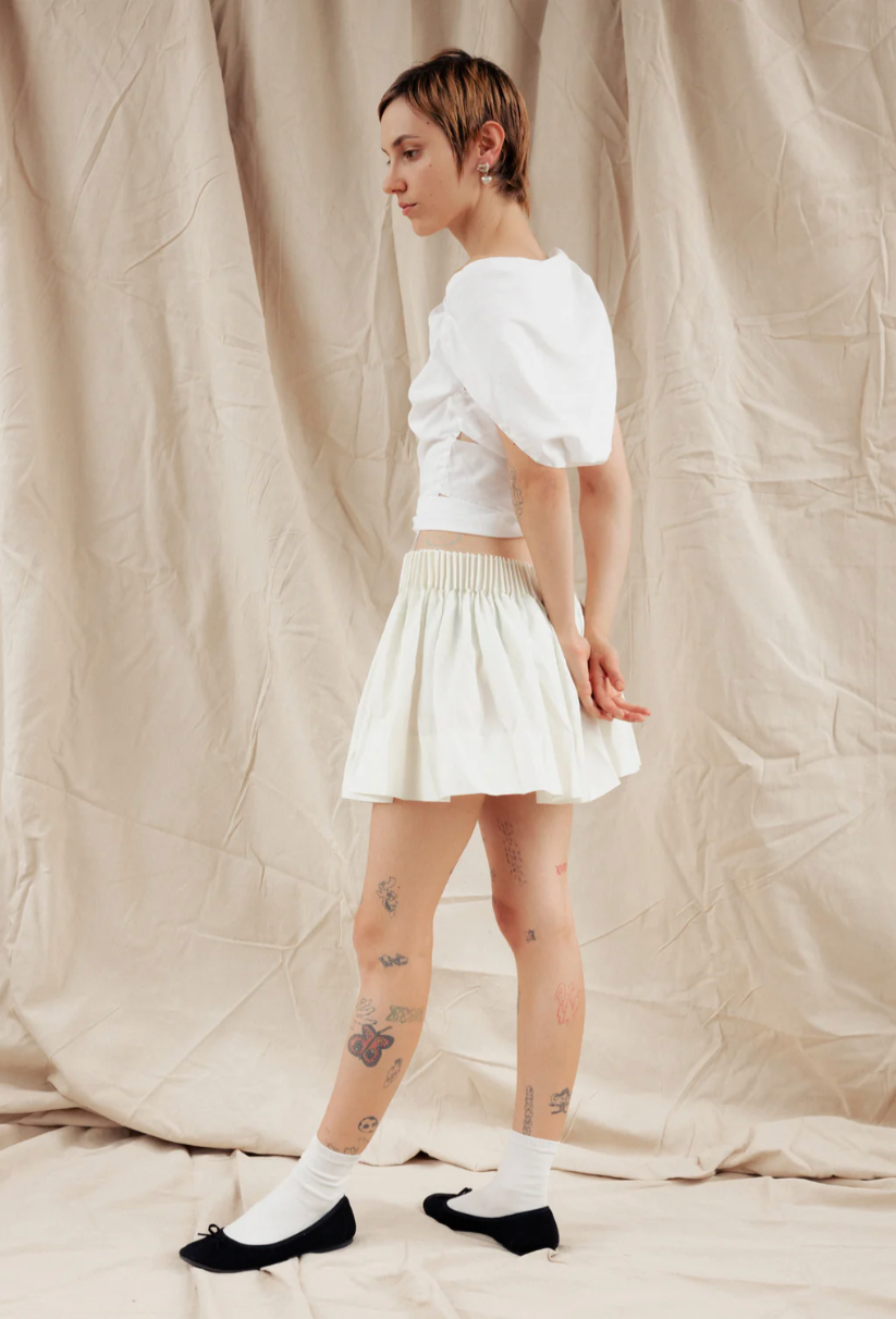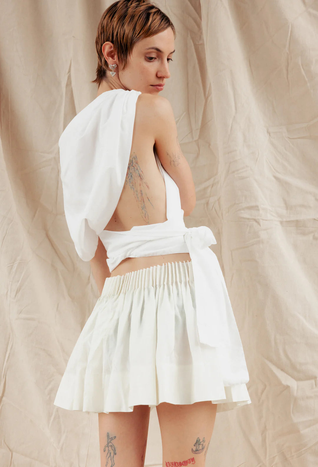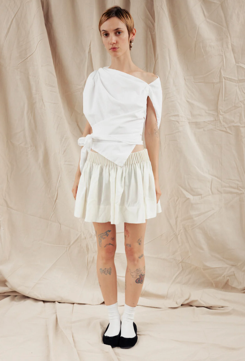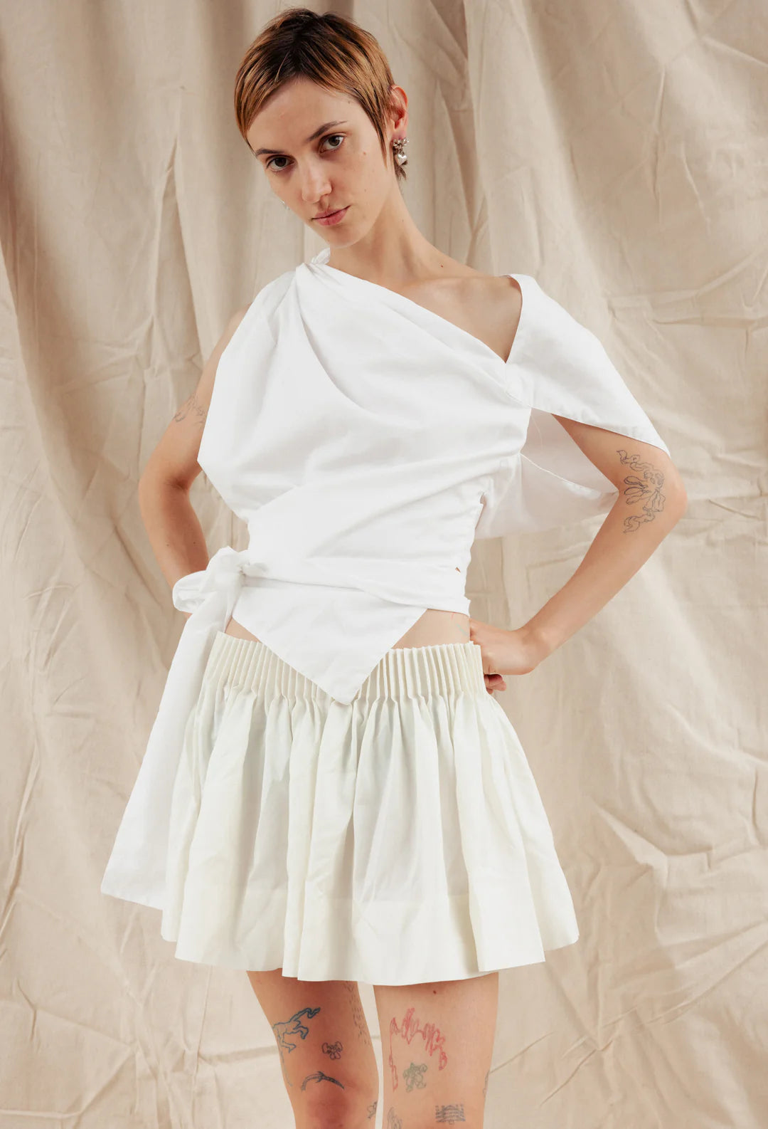 Eva Top in White is an asymmetrical wrap-style blouse made from crisp cotton. Featuring an artful draping that creates folds and pleats, giving it a sculptural look. One shoulder is left bare, while the other has a soft gathered sleeve. The top ties at in many ways creating a cinched effect and adding shape. It's a statement piece that balances structure with softness.