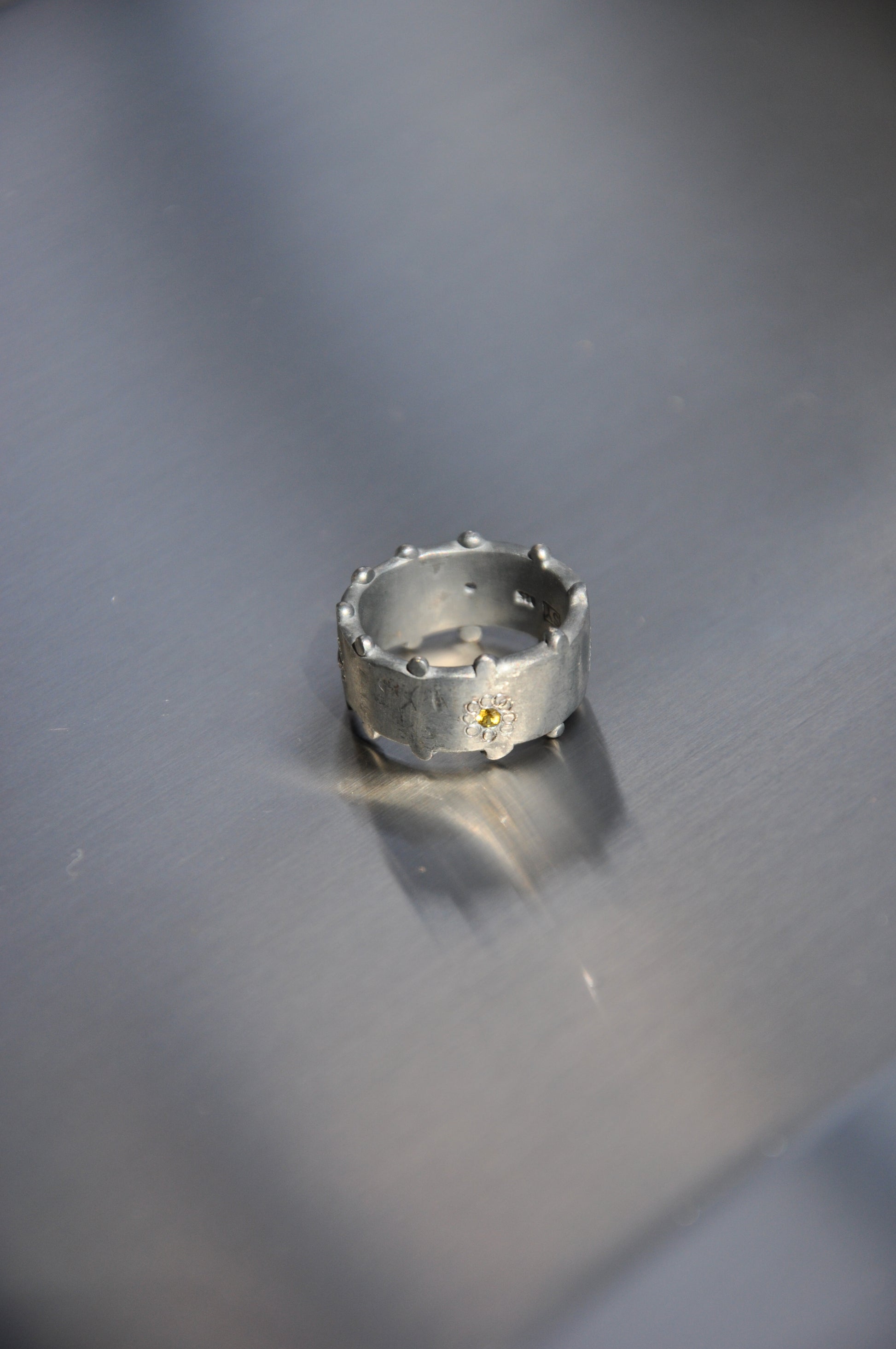 Please note: This ring has been oxidised, it will fade with wear, becoming more silver. Crevices and indentations will hold some of the dark oxidisation.