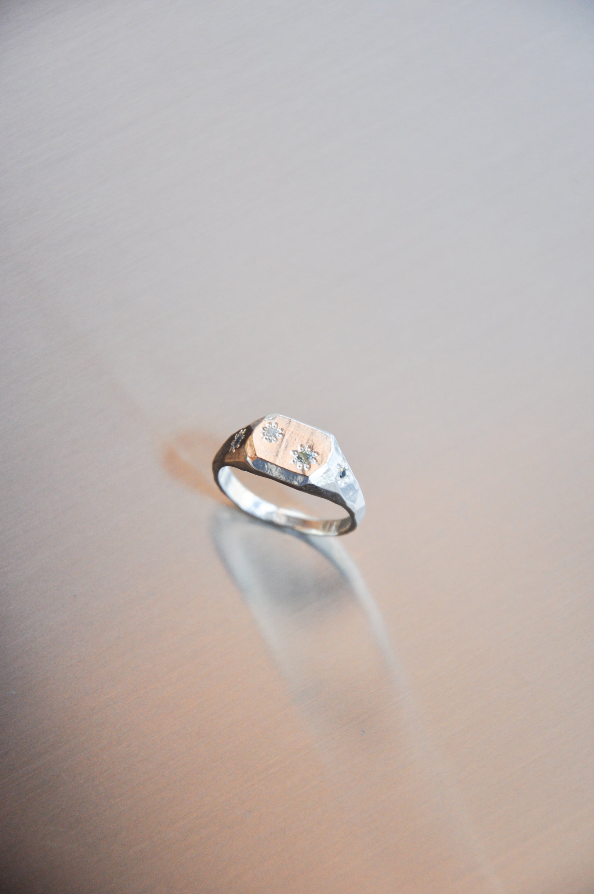 Faceted Signet Ring in Silver, Sapphires & Diamond, a heavily faceted signet ring that retains its hand carved quality. Set with Sapphires and 1x 1.5 lab Diamond - it is chunky with a nice amount of metal but can be comfortably worn everyday.