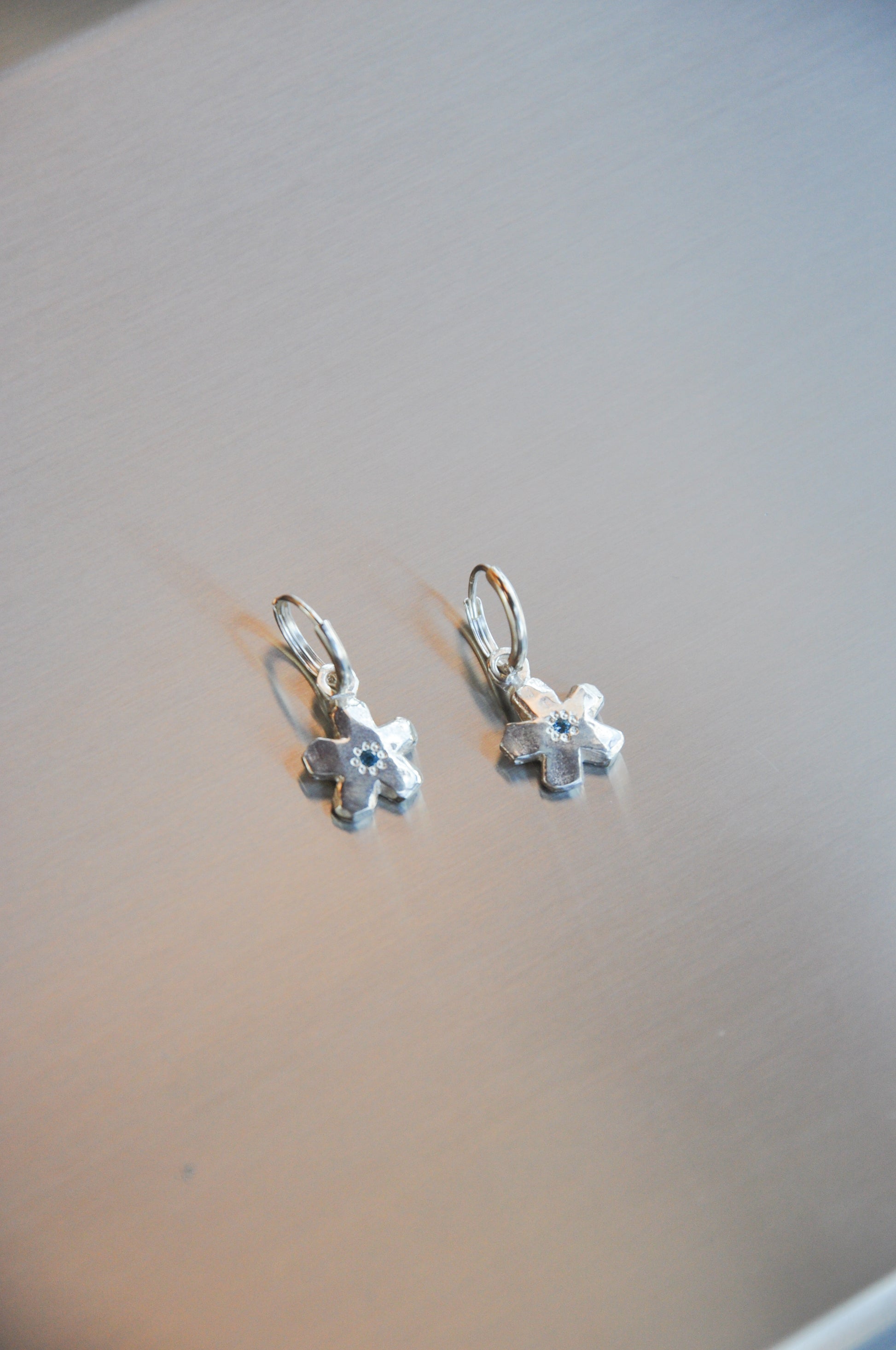 Flower Earrings in Silver & Topaz, these sweet Flower Earrings are hand carved and are set with two Topaz gems one gem in the middle of each flower charm.