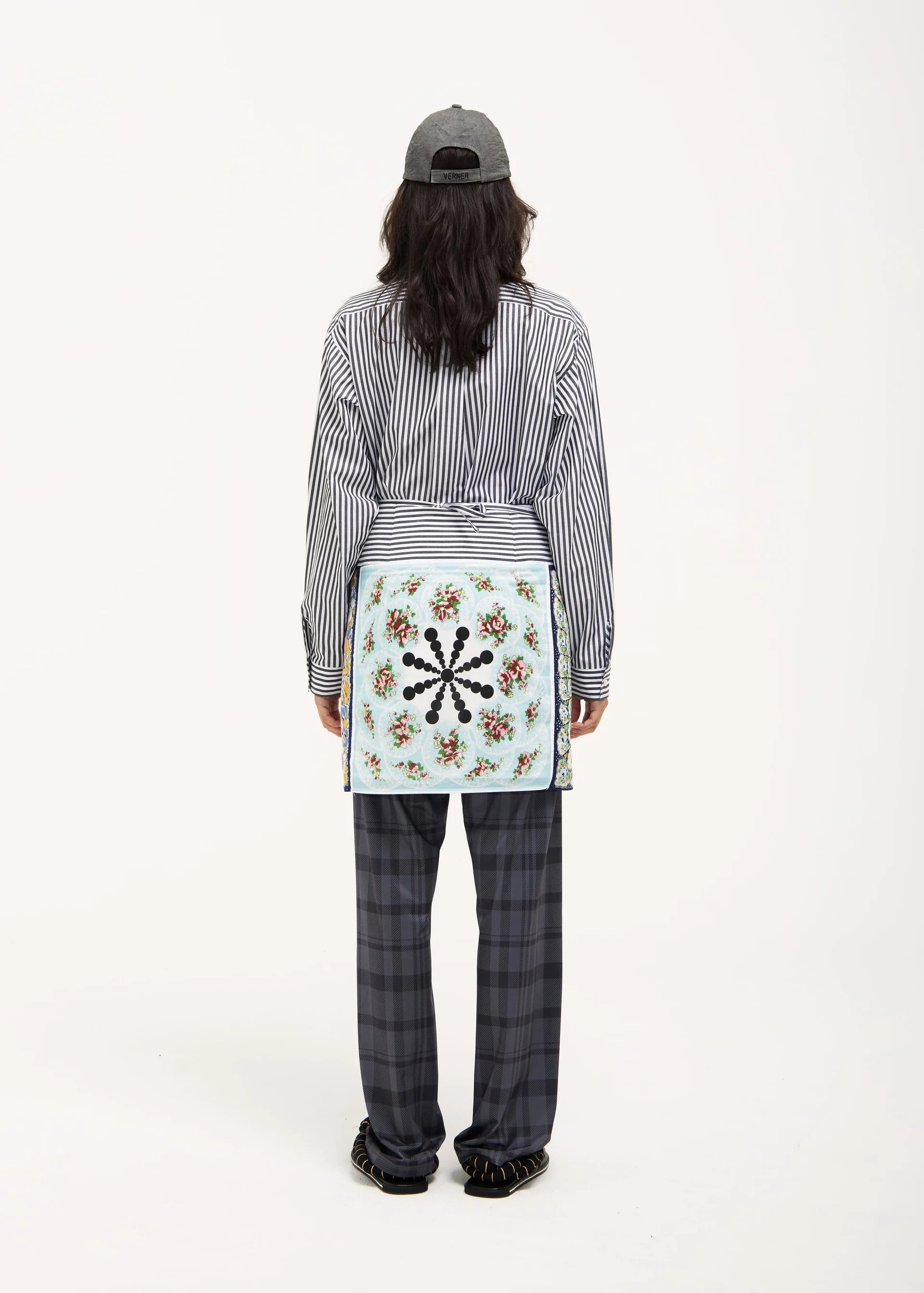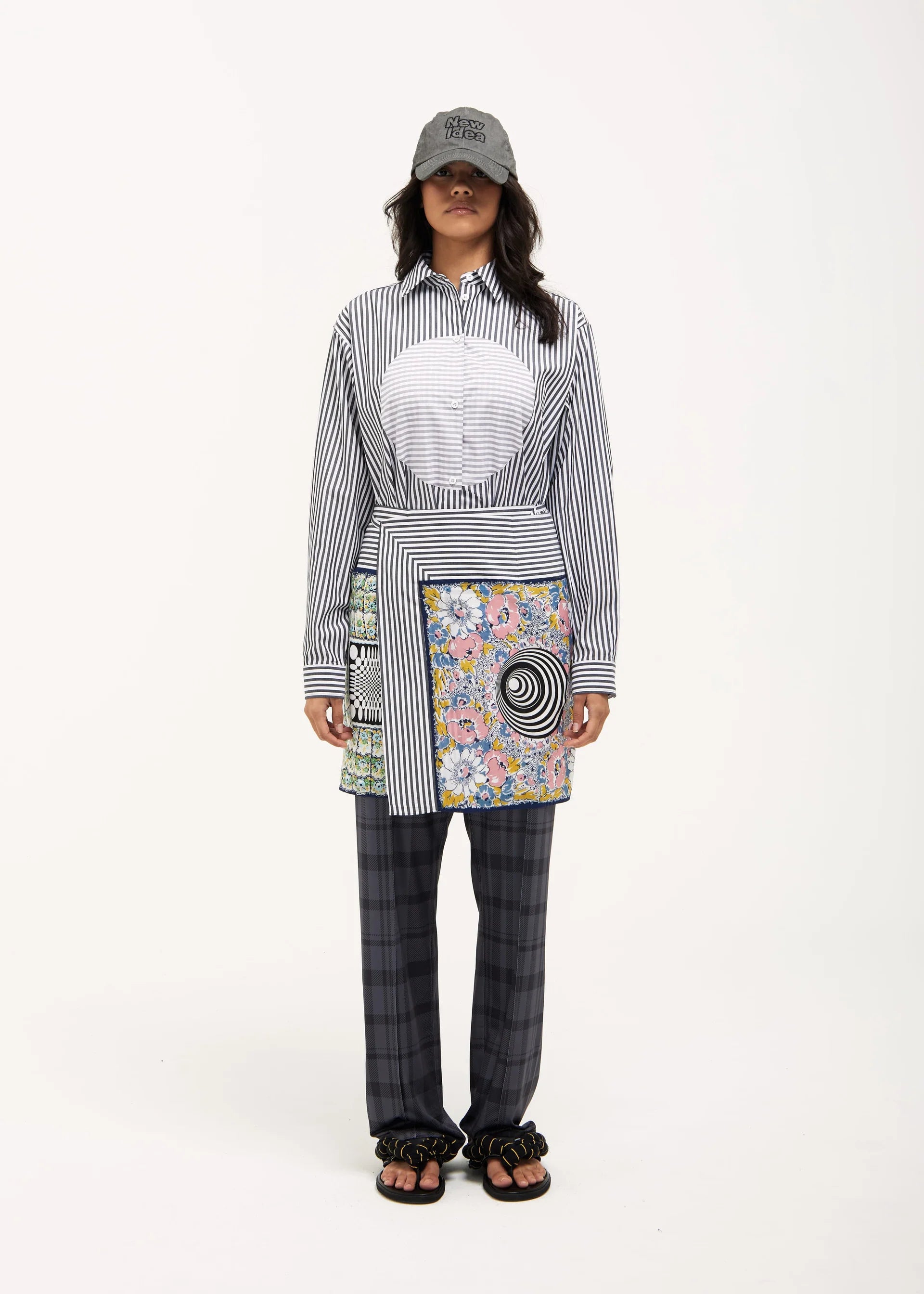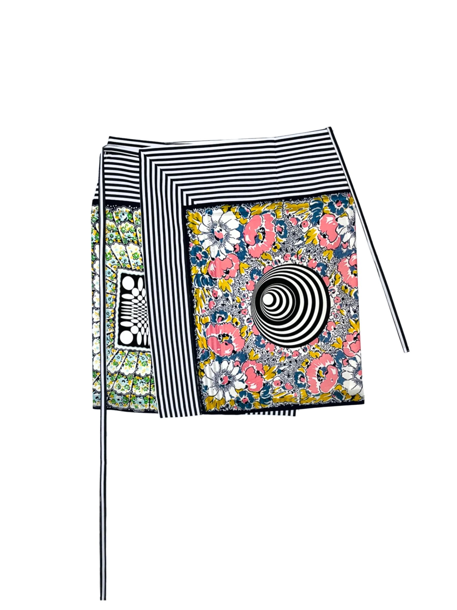 Handkerchief Sarong in Blue with Mixed Handkerchief Print, a wrap-style, above-the-knee sarong skirt featuring printed handkerchief squares, a waist tie, and contrasting striped cotton shirting border trim. Materials: Striped Cotton Shirting. Size & Fit: Adjustable fit.