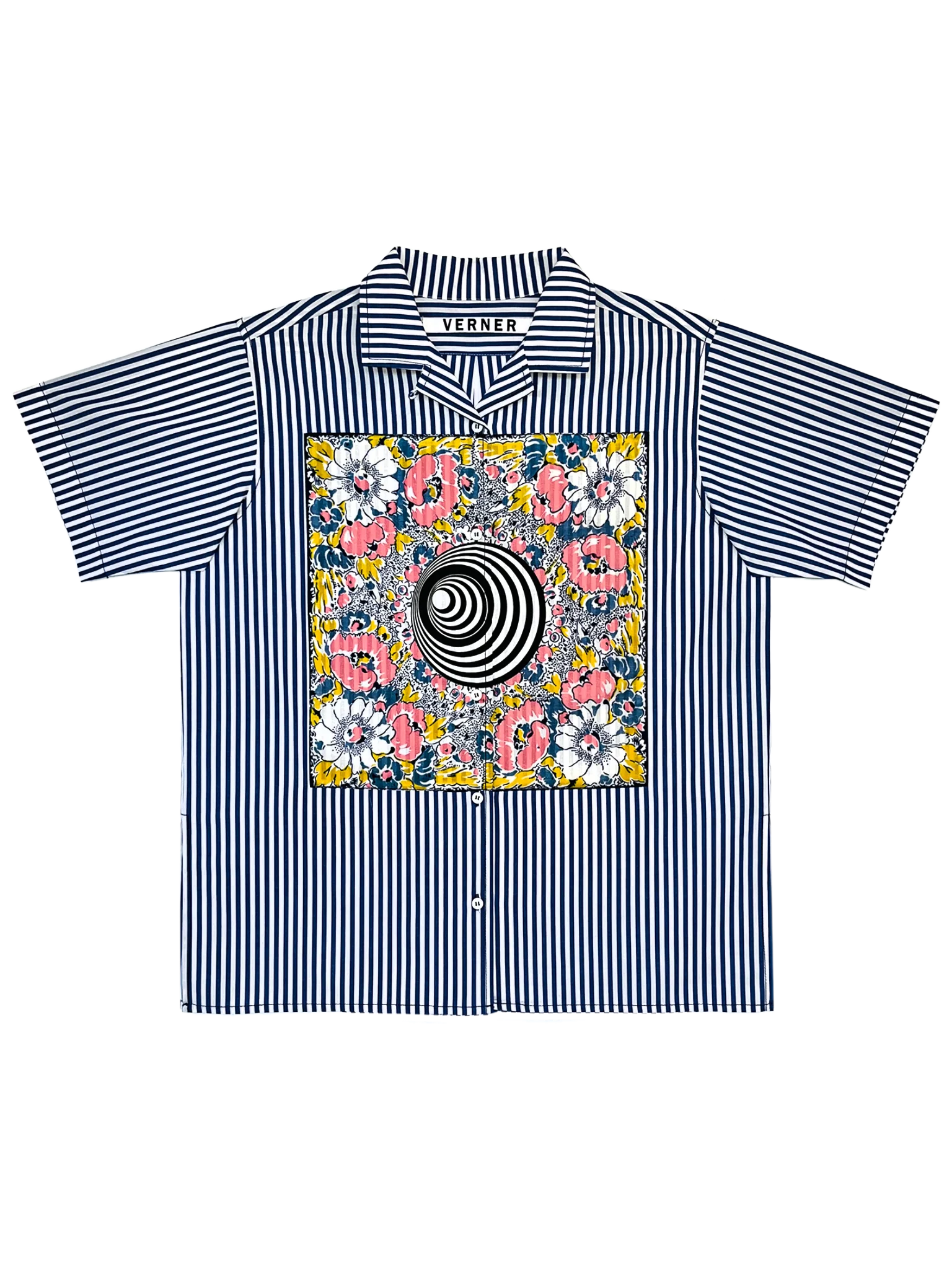 Handkerchief Shirt in Dark Blue with Spiral Motif, a loose-fitting, boxy short-sleeve shirt in striped cotton shirting featuring an appliqué handkerchief print. Re-worked vintage handkerchiefs inspired the printed appliqué panels.
