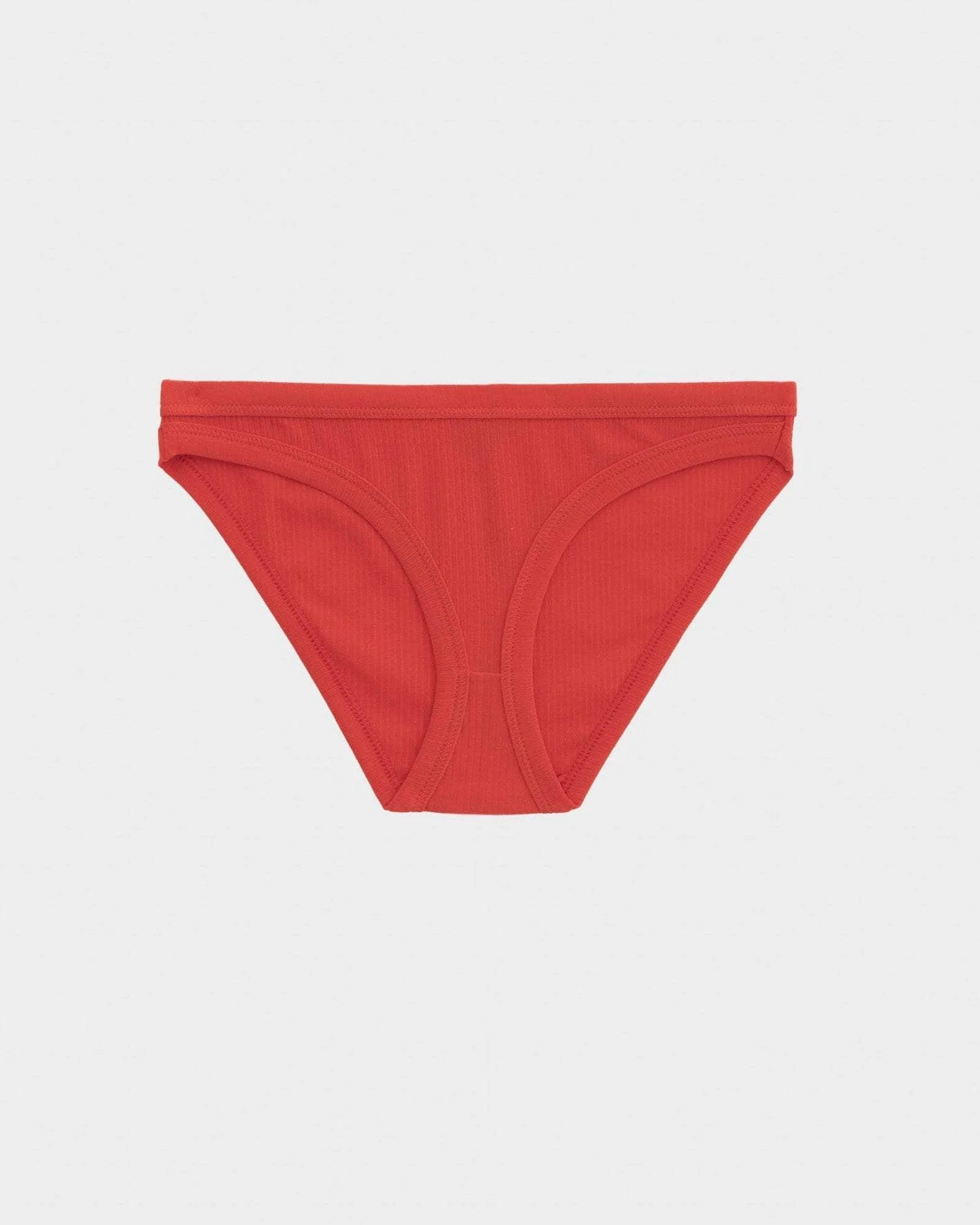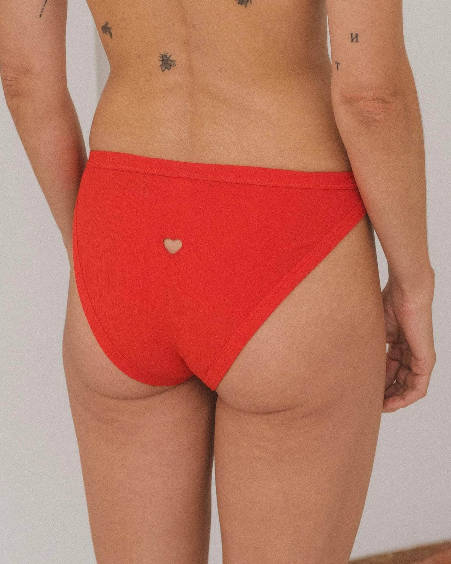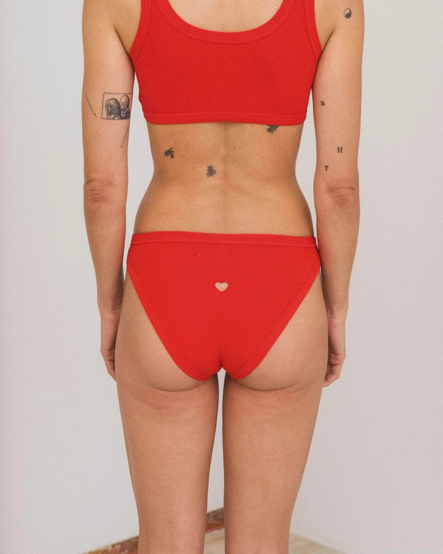 Heart Bell Pants in My Red is a Organic cotton rib underpant.Elastic trim at waist and leg. Heart shape embroidery with cut out at back