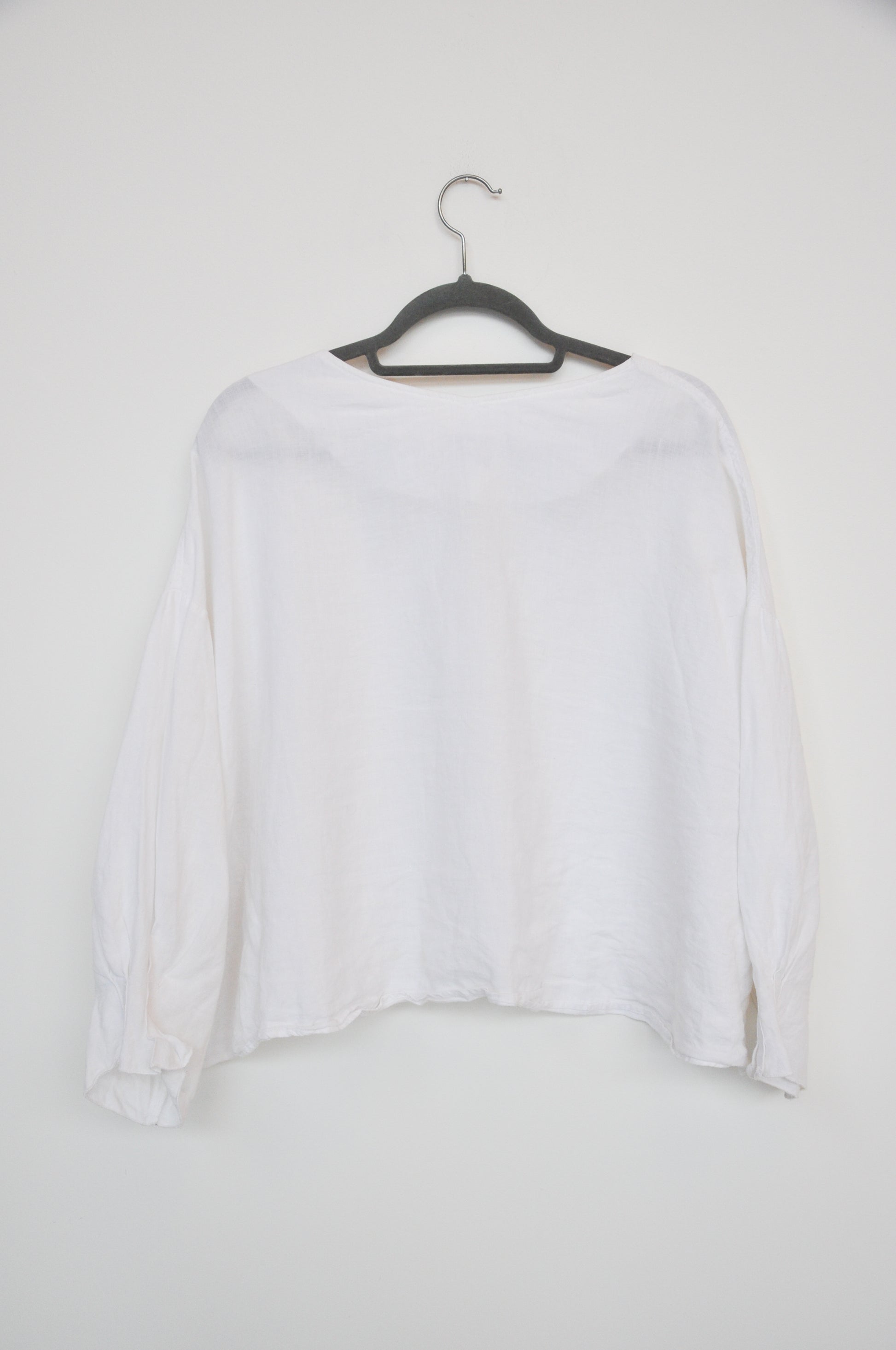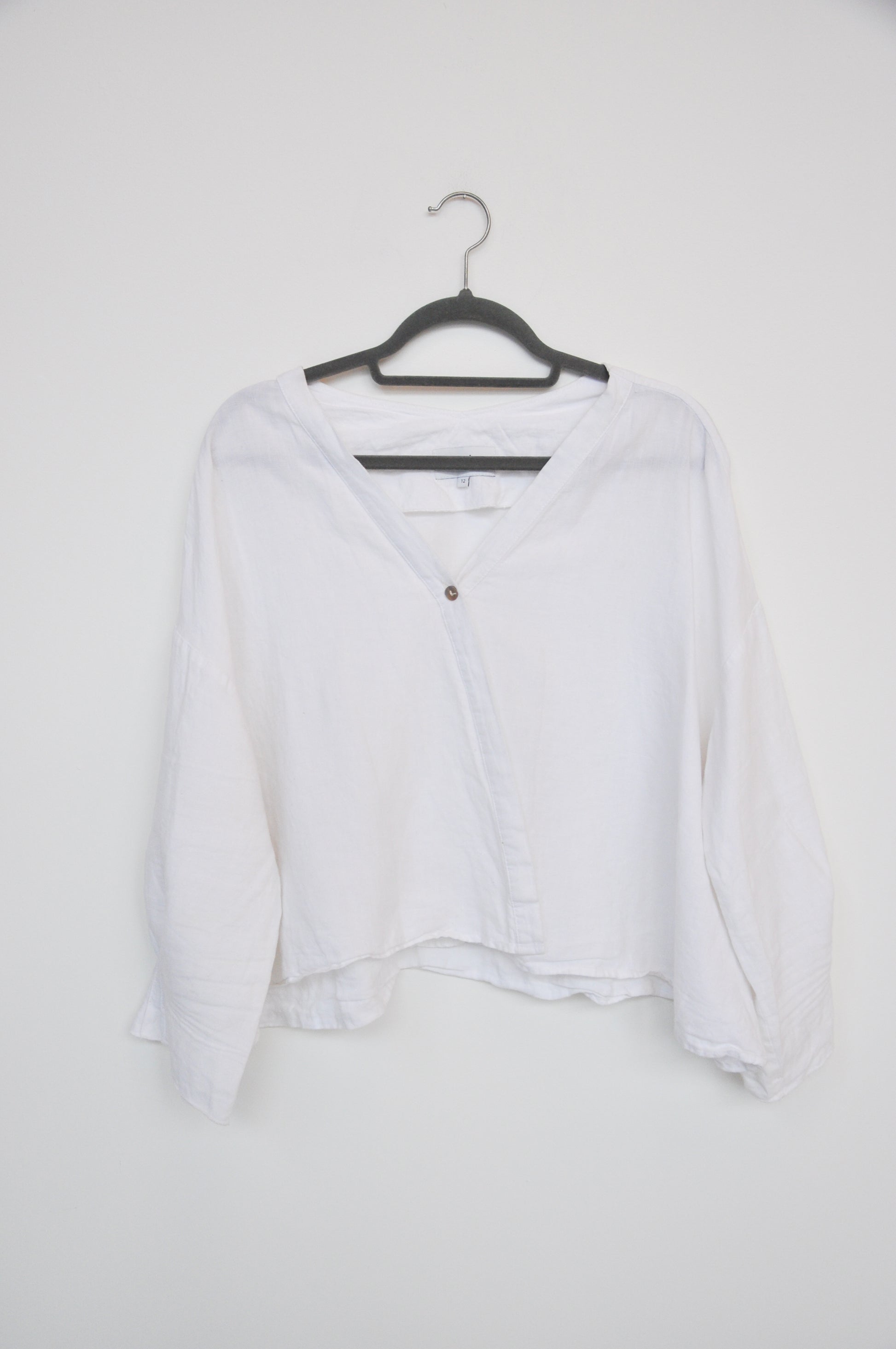 The shirt has loose, flowy fit. Long sleeves. Pleated at the cuffs. One button at the v-neckline. By the brand Hej Hej.
