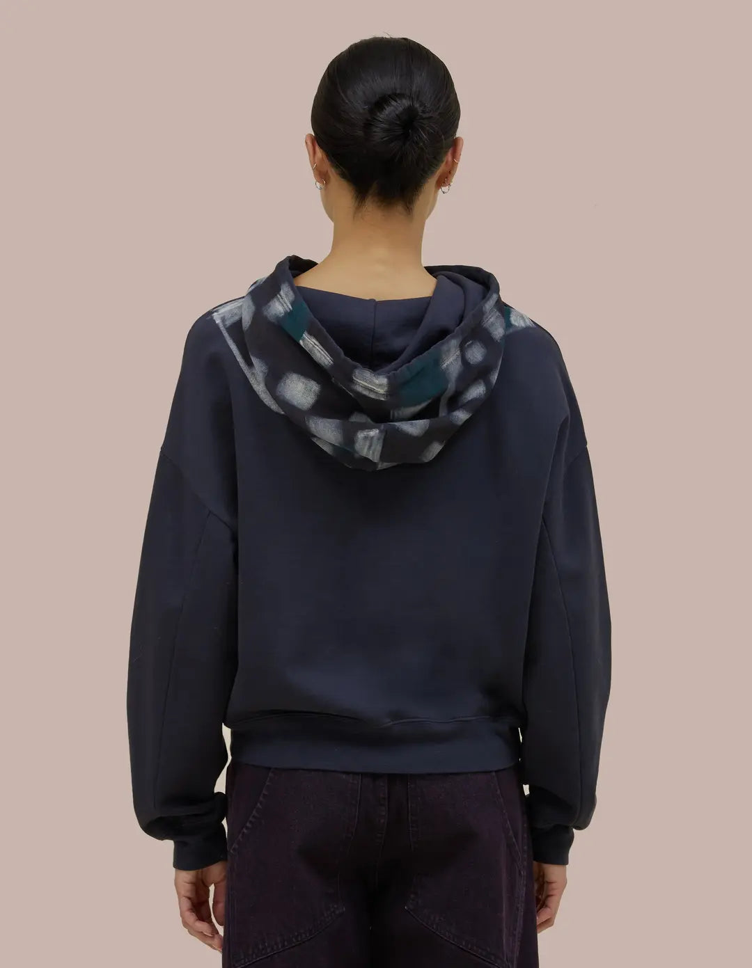 Hoodie in Porcupine, Made of brushed French terry with a relaxed, cropped fit. Garment dyed in deep navy and finished with a checkered spray design across the body, shoulders, and hood. Features a glossy "Eckhaus Latta" logo on the shoulder.
