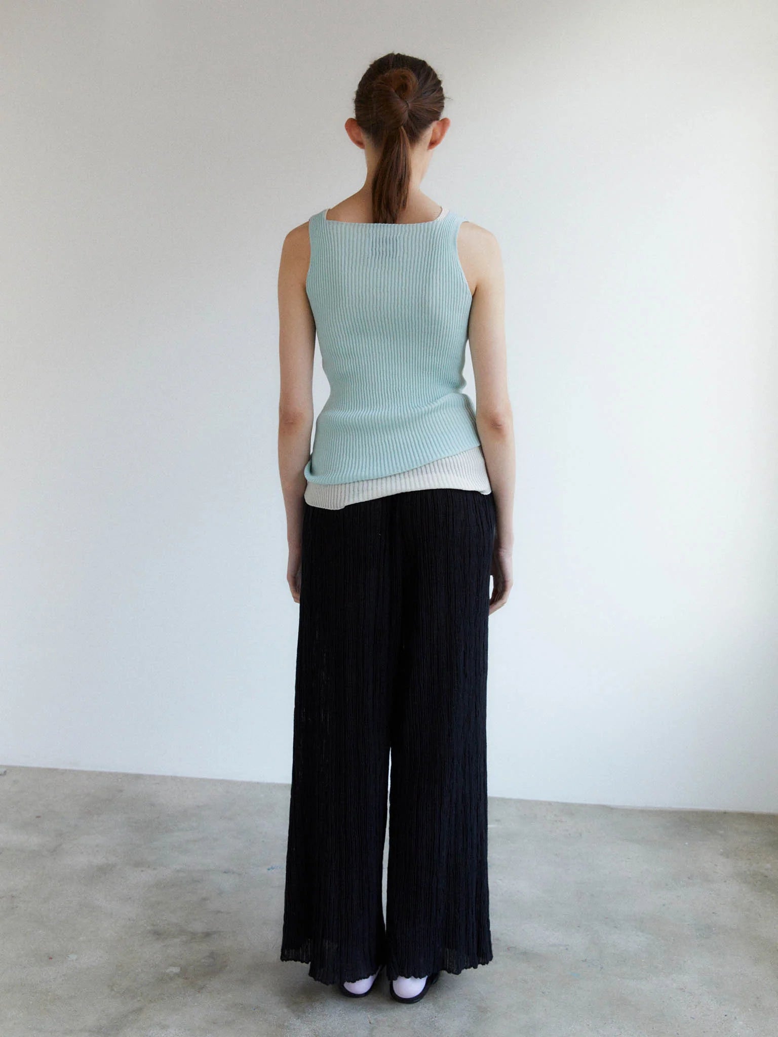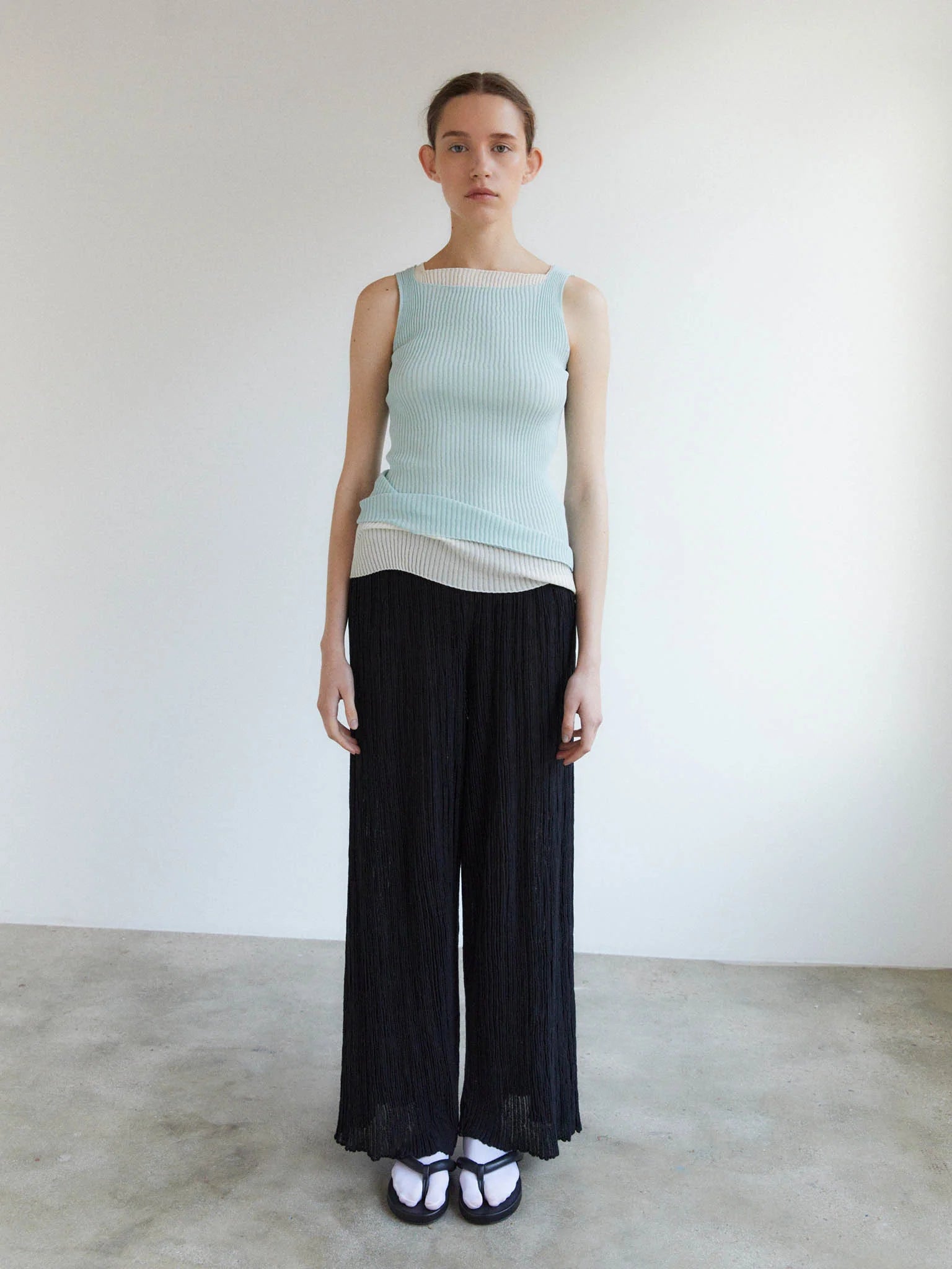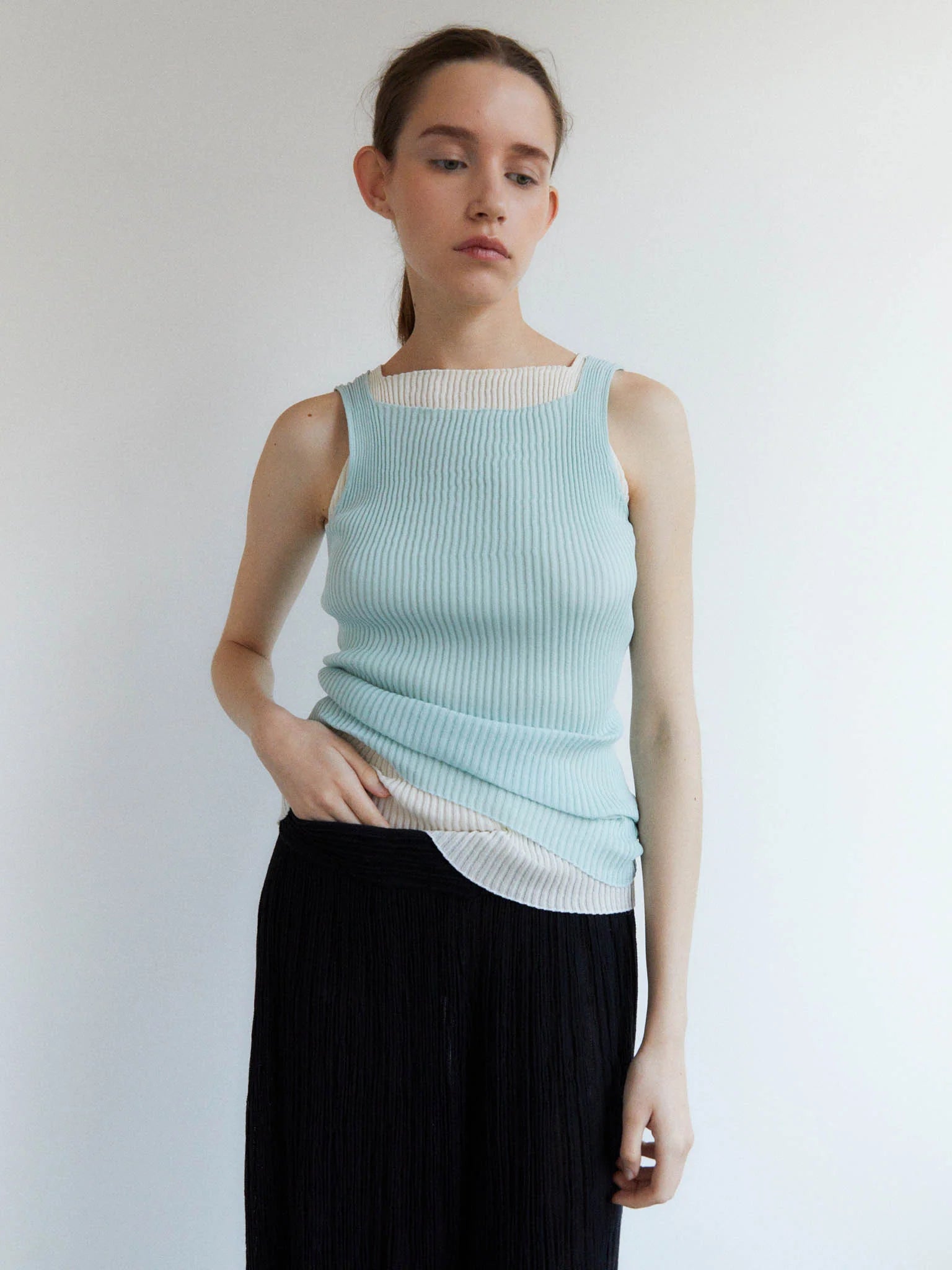 Junko Top in Light Blue is a form fitting sleeveless ribbed top crafted from an ultrafine makò cotton blend with a dry handfeel. Featuring a square neckline. Crafted with whole-garment technology.