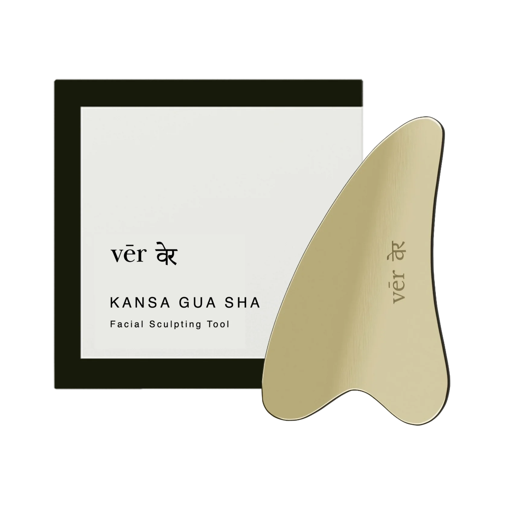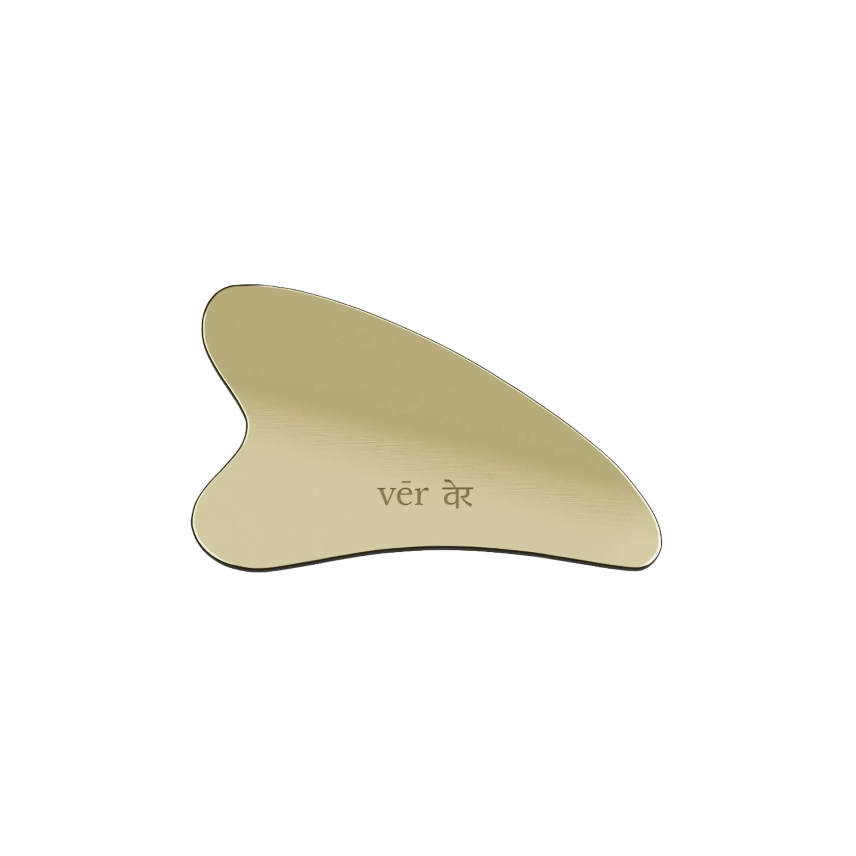 Kansa Gua Sha - Rooted in Ayurvedic practice, Kansa Metal, also known as 'healing bronze,' is revered for its therapeutic properties. It helps to detoxify and rejuvenate the body by balancing mental and physical energies identified as Doshas. Vēr's Kansa Gua Sha, meticulously handcrafted by skilled artisans in India, is inspired by the ancient traditions of Chinese acupuncture and Ayurvedic healing. It is designed to sculpt, lift, redefine, and promote lymphatic drainage, serving as the ultimate companion for naturally enhancing facial contours.