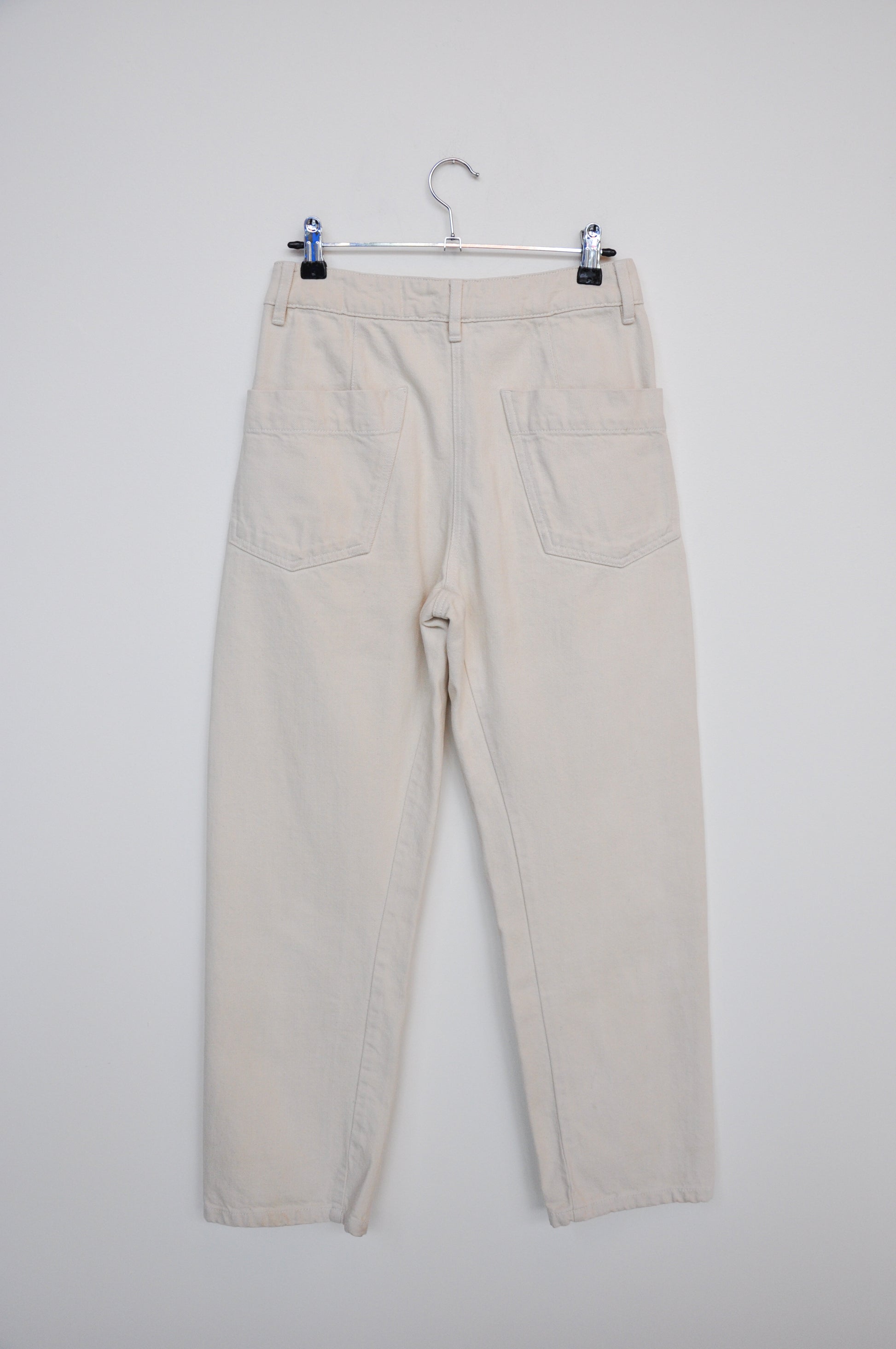 A calssic cut witha slgiht curved detail seam down the leg. Featuring back pocket, side seam pockets and belt loops. Zip fly and button closure. By the brand Lemaire in size 34/ NZ8