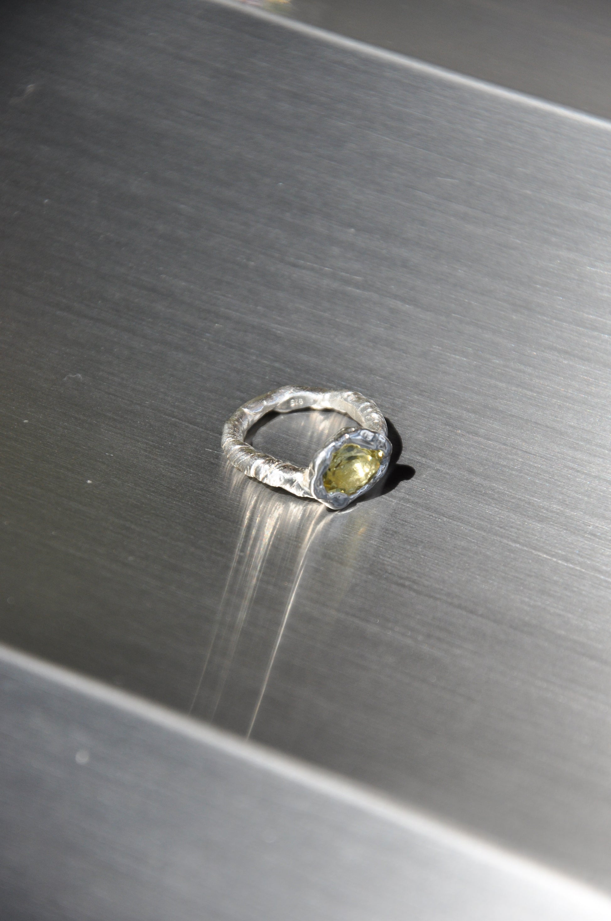 Lemon Quartz ring in Silver, with a twisted sterling silver band, a big Lemon Quartz stone sits above. Sculptured in wax, cast, hallmarked and finished by hand in Tāmaki Makaurau.