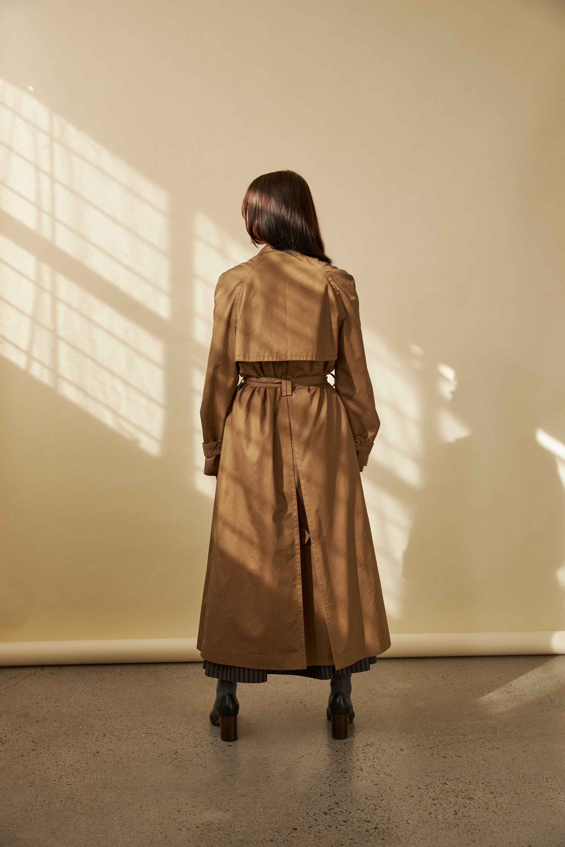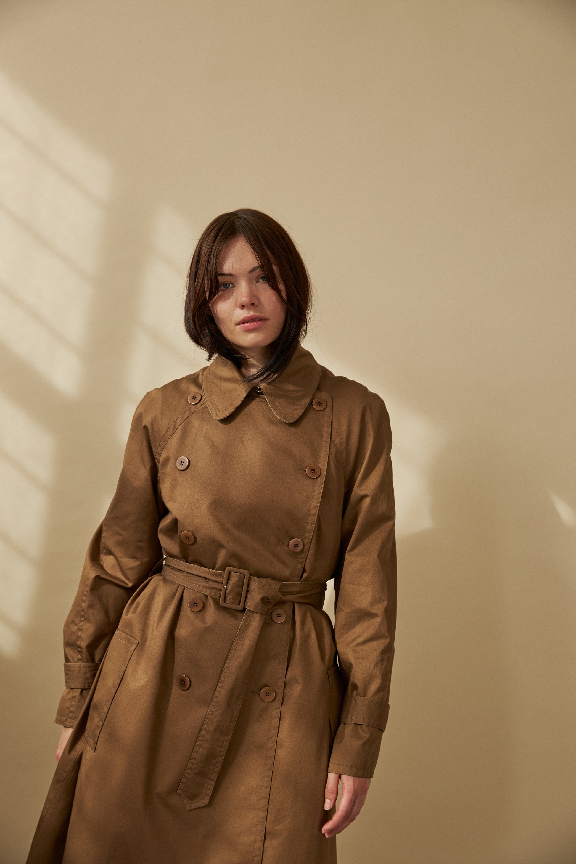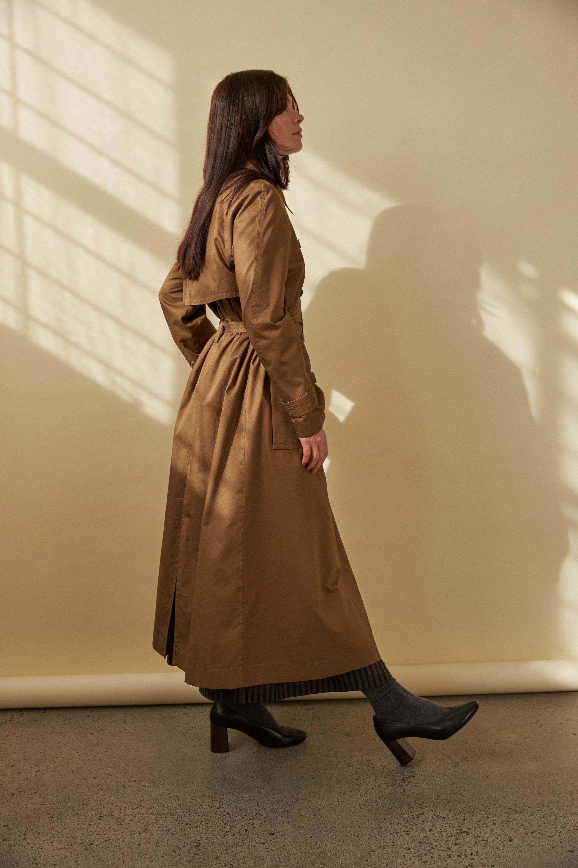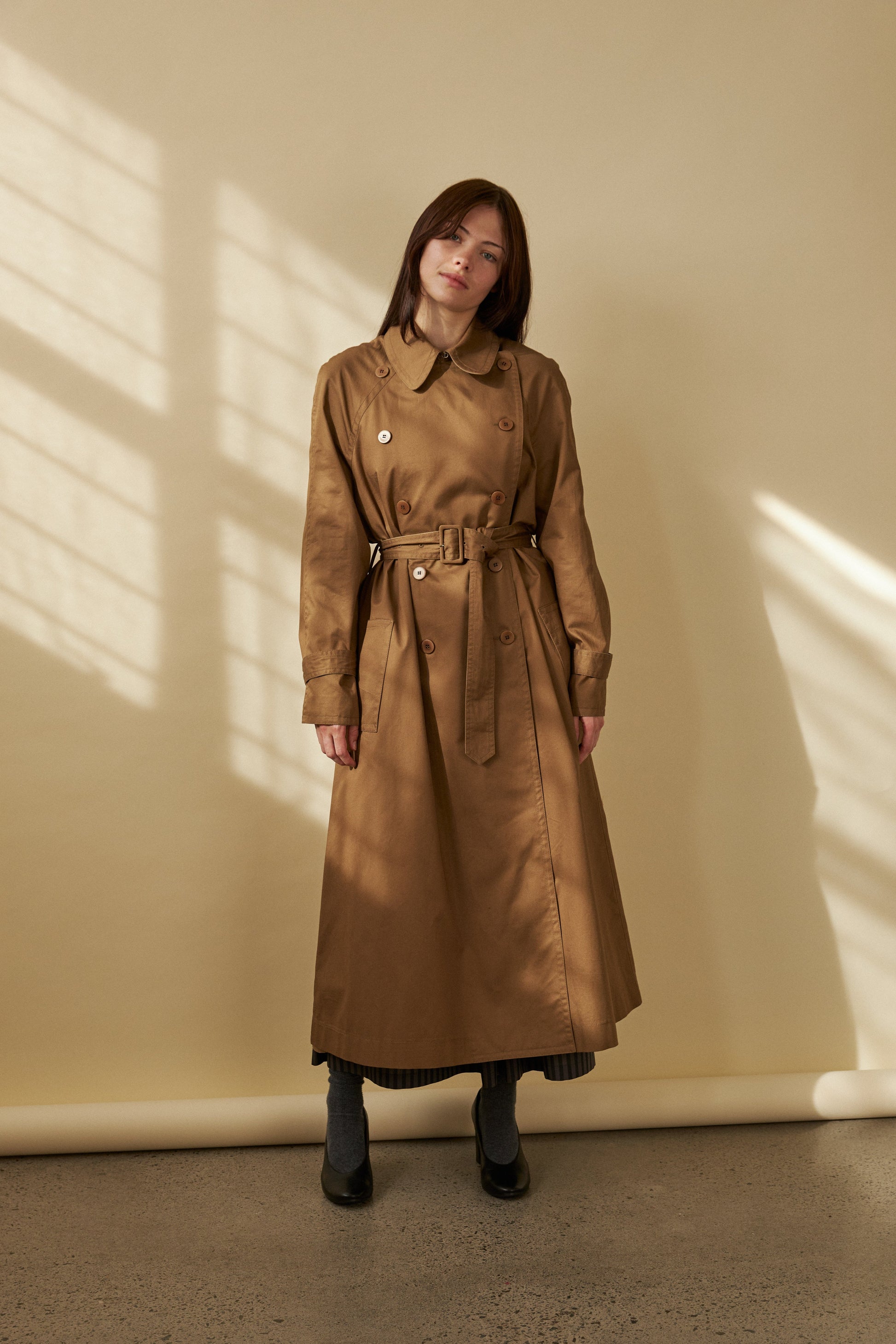 Leo Trench in Bronze, a long trench coat with a large lapel and collar. Crafted in a cotton drill with a slight sheen finish and fully-lined. The coat is double breasted and fastens with corozo nut buttons. Features top-stitched seams, a raglan sleeve with adjustable wrist tabs, a pleated vent at the back and a storm flap. The coat has an adjustable and removable belt with matching buckle, belt loops hold the belt in place when worn un-fastened.