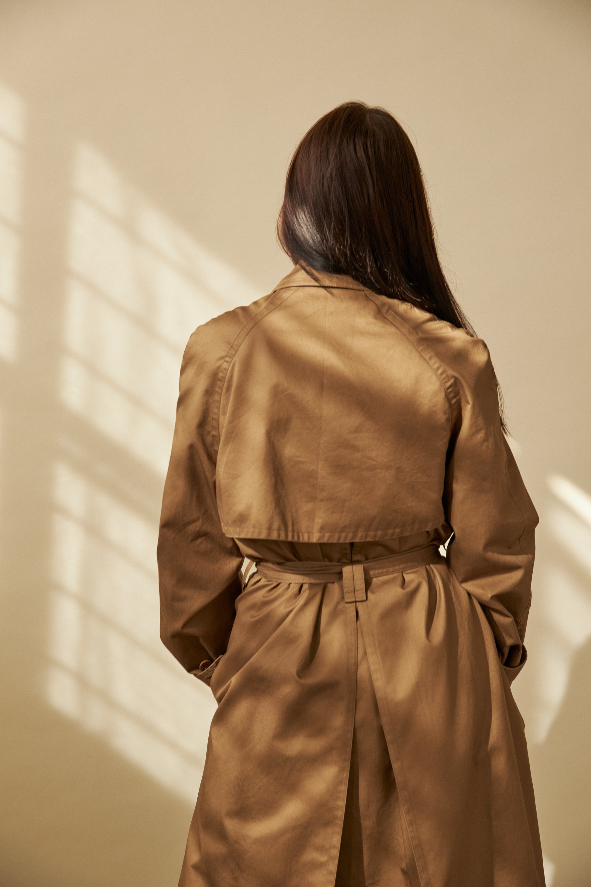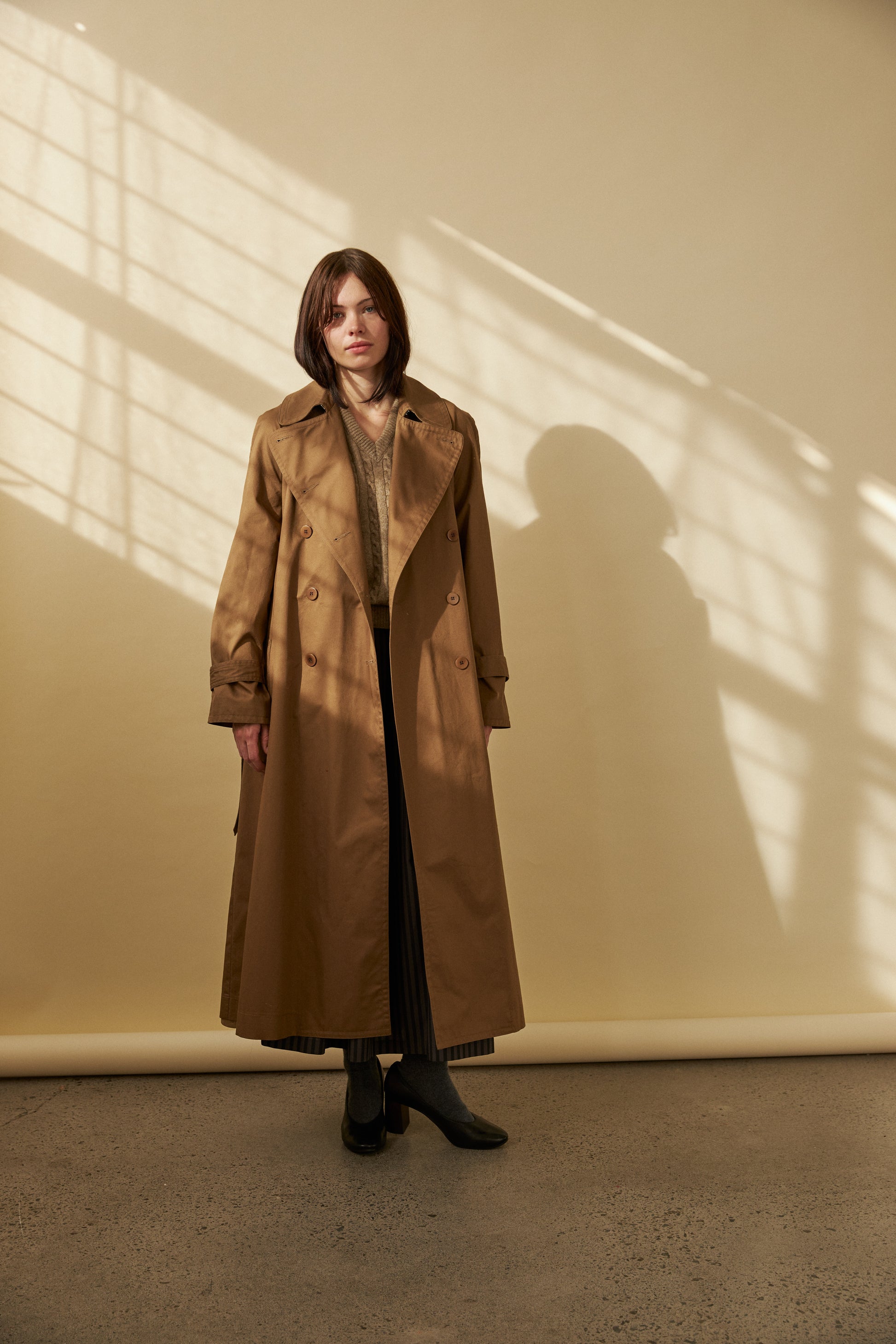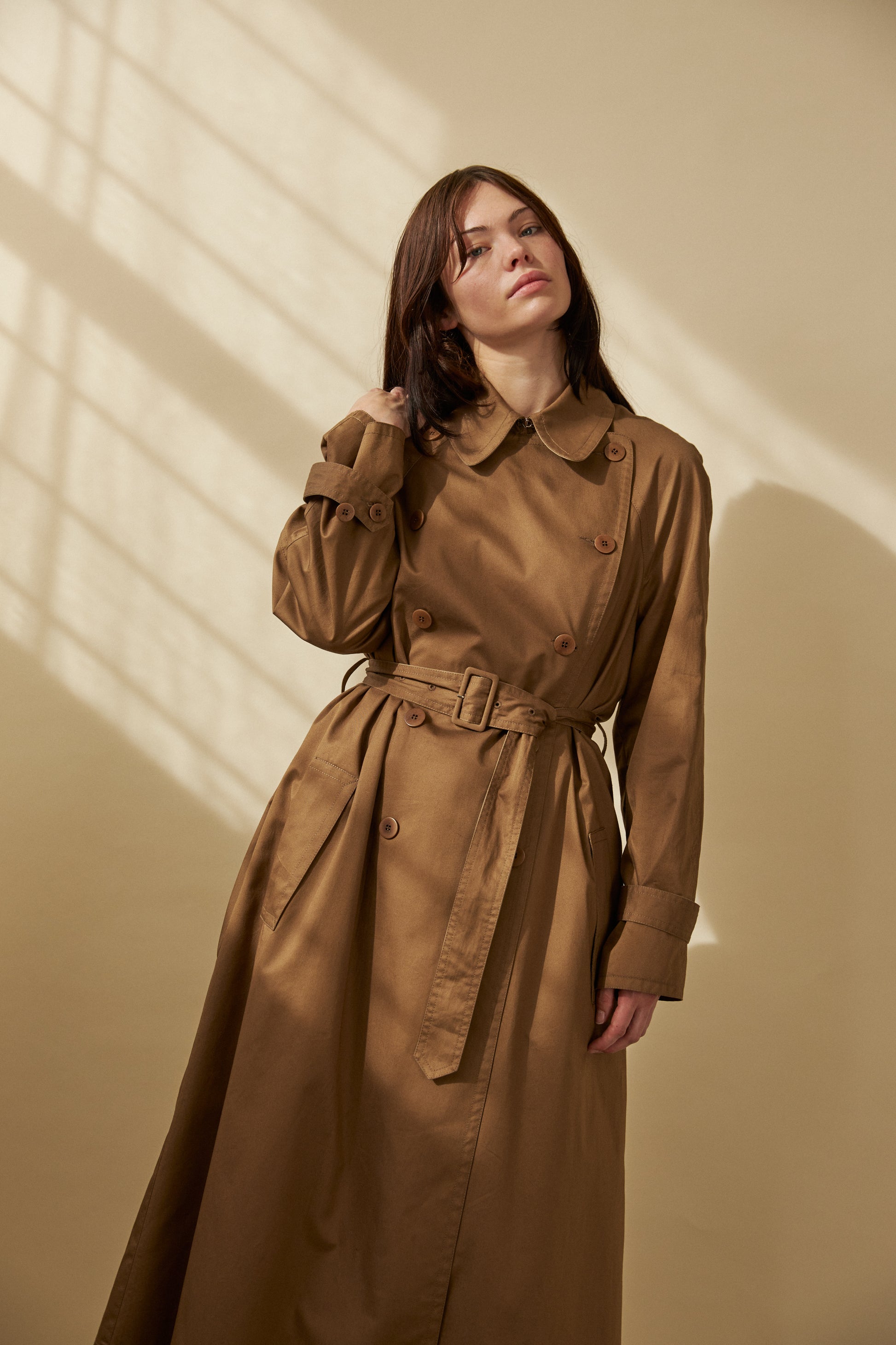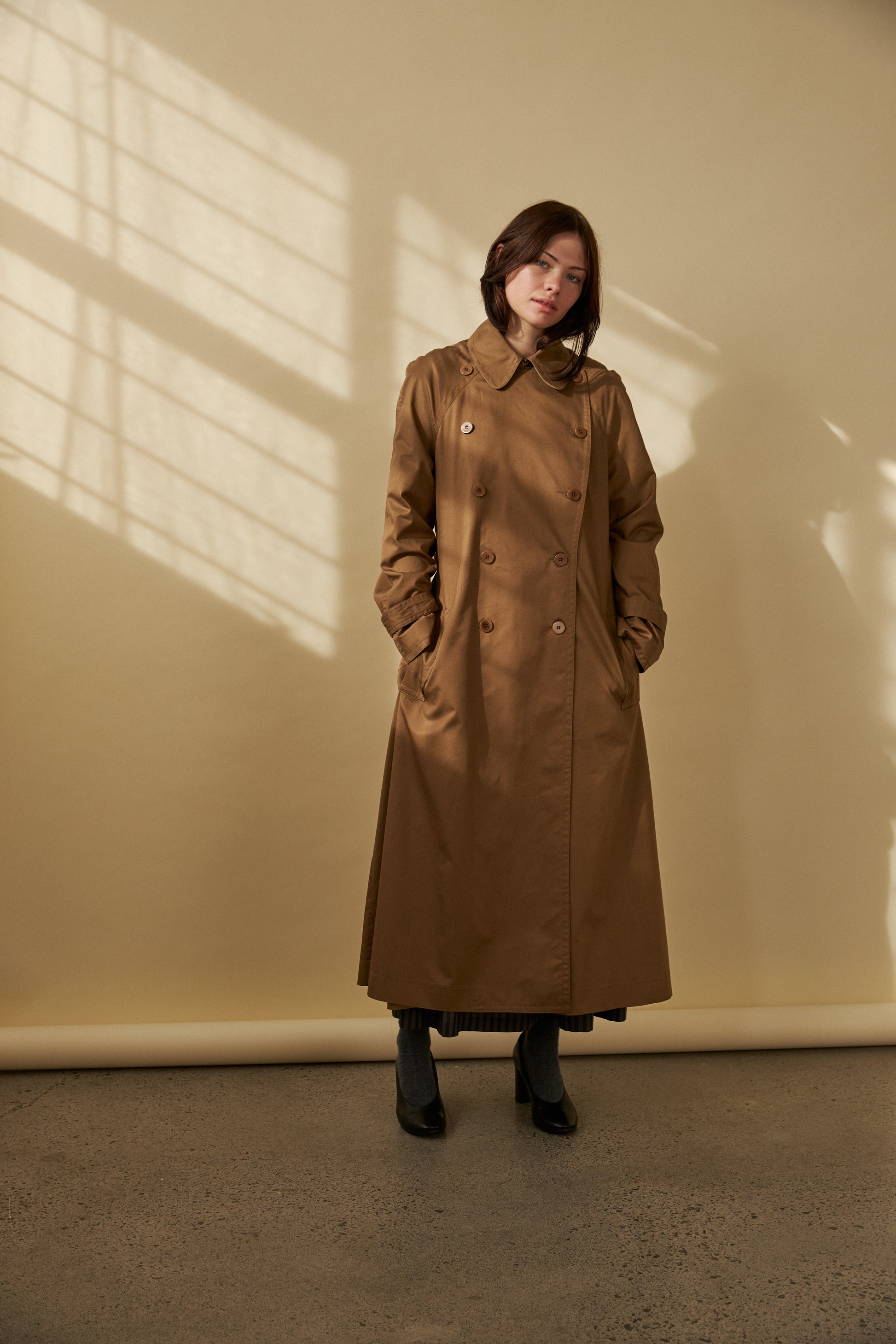 Leo Trench in Bronze, a long trench coat with a large lapel and collar. Crafted in a cotton drill with a slight sheen finish and fully-lined. The coat is double breasted and fastens with corozo nut buttons. Features top-stitched seams, a raglan sleeve with adjustable wrist tabs, a pleated vent at the back and a storm flap. The coat has an adjustable and removable belt with matching buckle, belt loops hold the belt in place when worn un-fastened.