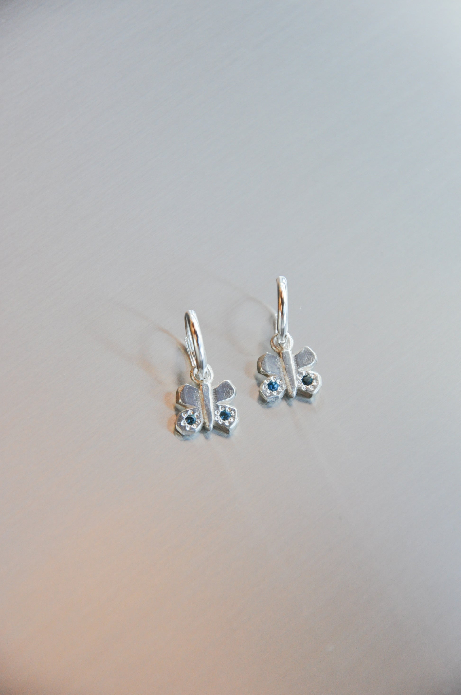 Little Butterfly Earrings in Silver & Topaz, these little butterfly earrings are whimsical and retain their hand carved quality. They are set with four Topaz gems two gems on each butterfly charm.