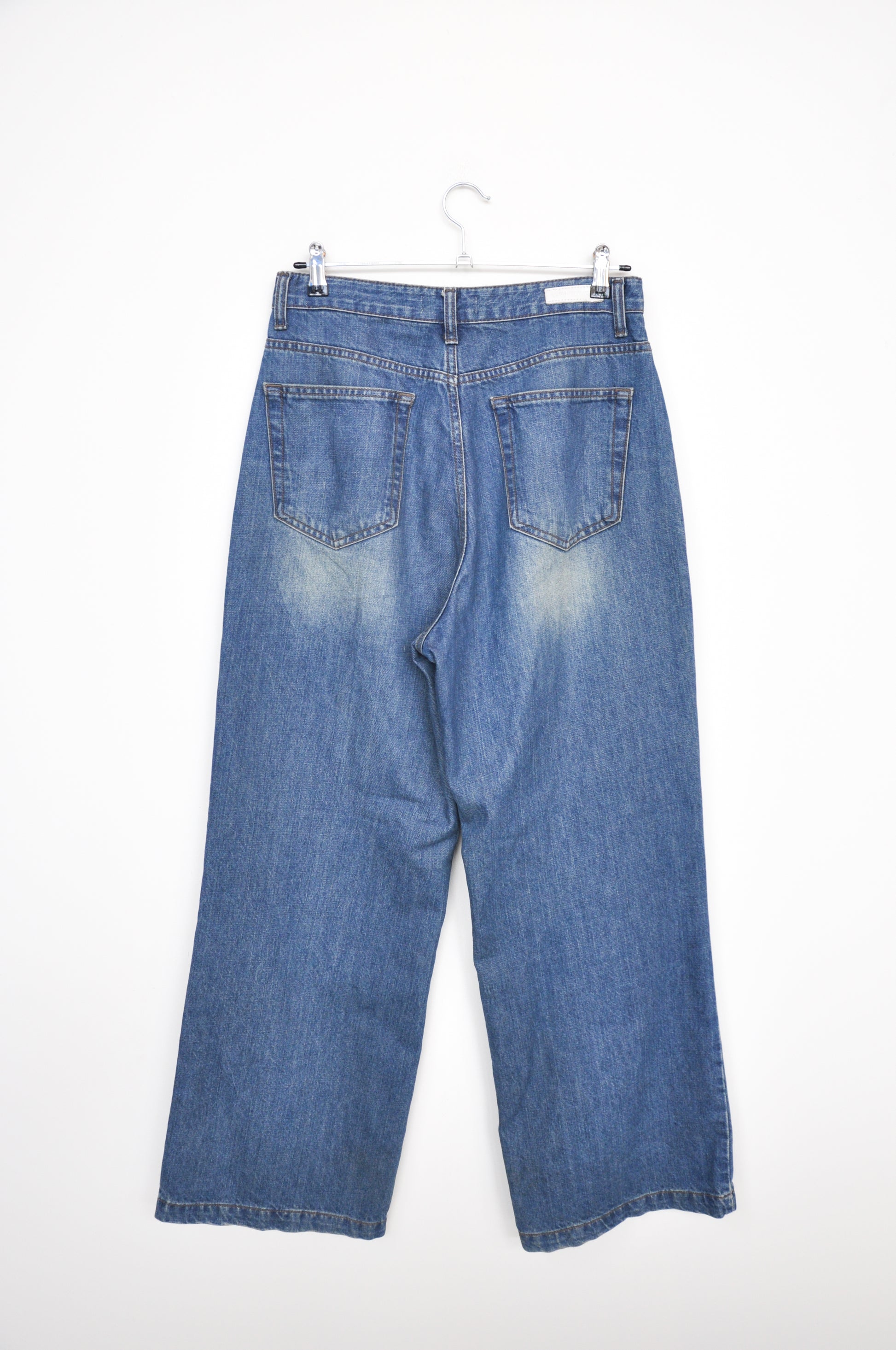 Relaxed fit jeans. Wide leg. Faded denim style. Belt loops. Back and front pockets. By the brand Low Classic.