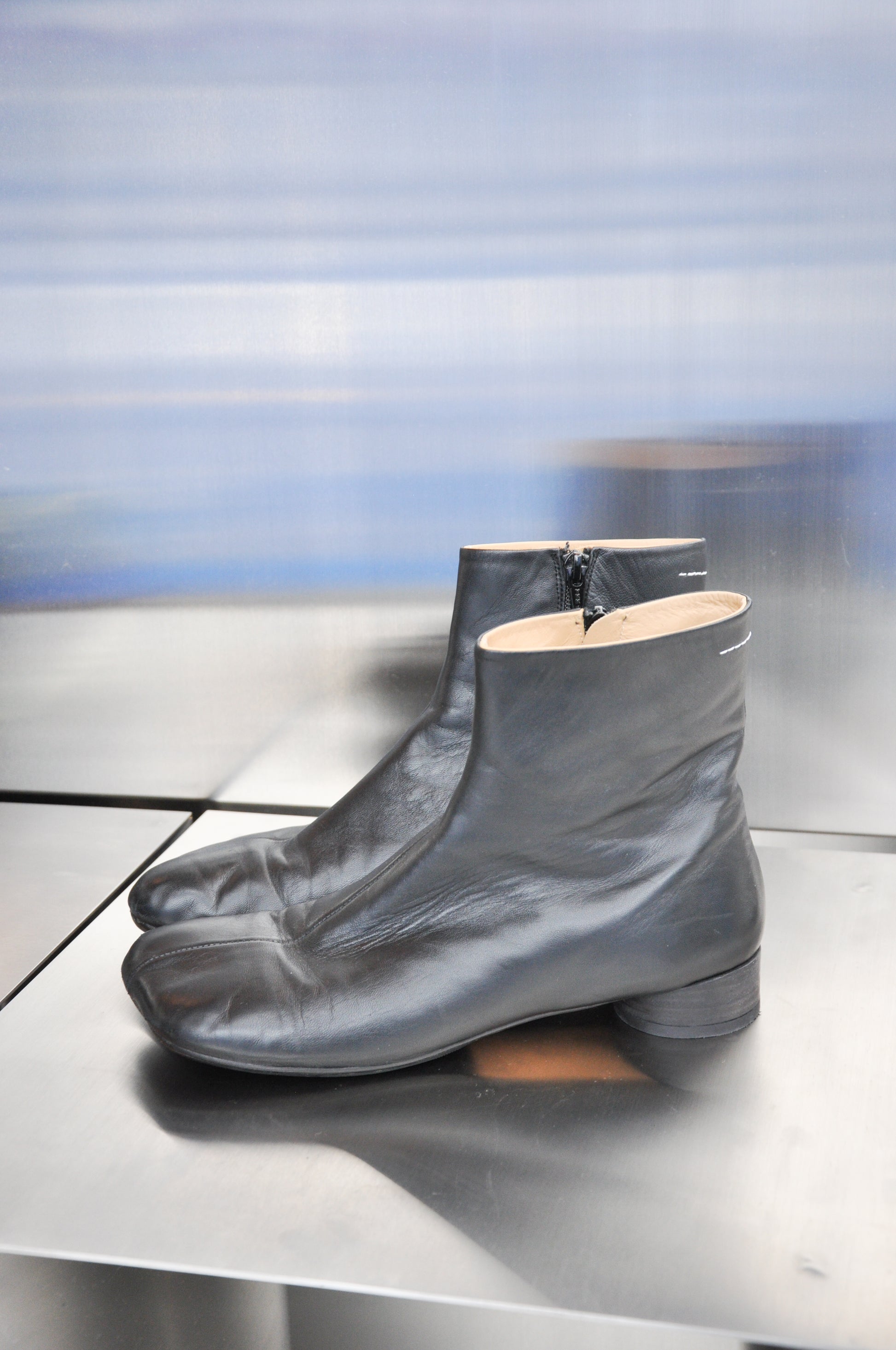 Ankle boots. Branded leather insole. Asymmetrical toe. Side zip fastening. Low heel. By the brand Maison Margiela.