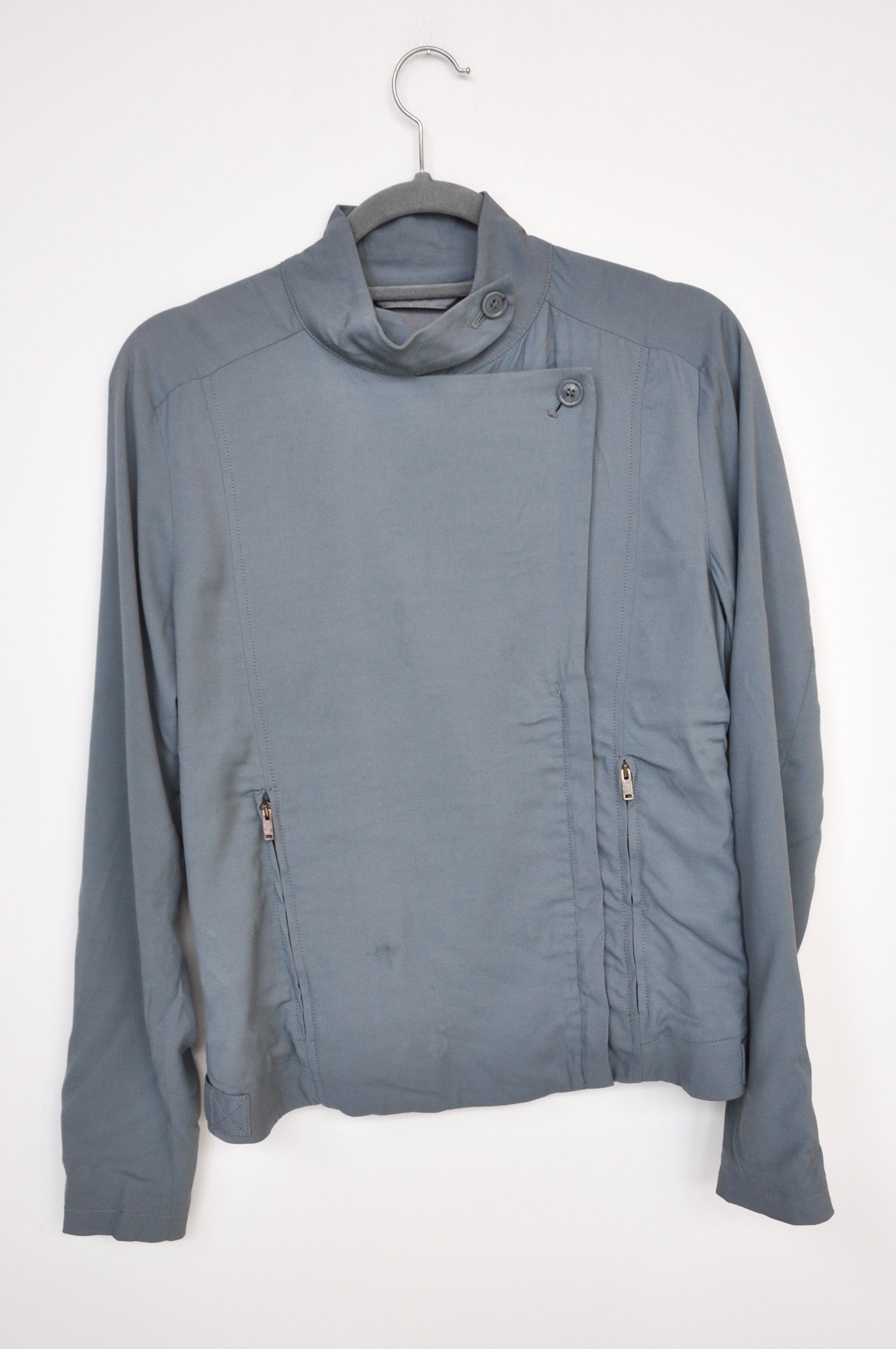 Asymmetrical front closure with buttons leading to a mock-neck collar. Two vertical zippered pockets on the front. Long sleeves and a slightly cropped length ending around the hips. By the brand Maison Margiela.