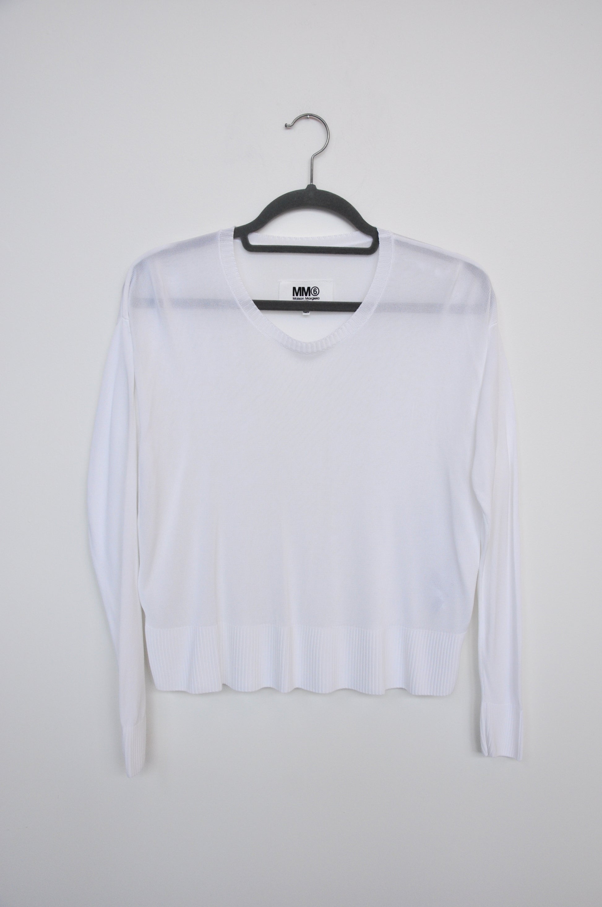 Semi sheer knit long sleeve. Ribbed at the cuffs, neckline and ends of the top. Rounded neckline. By the brand Maison Margiela.