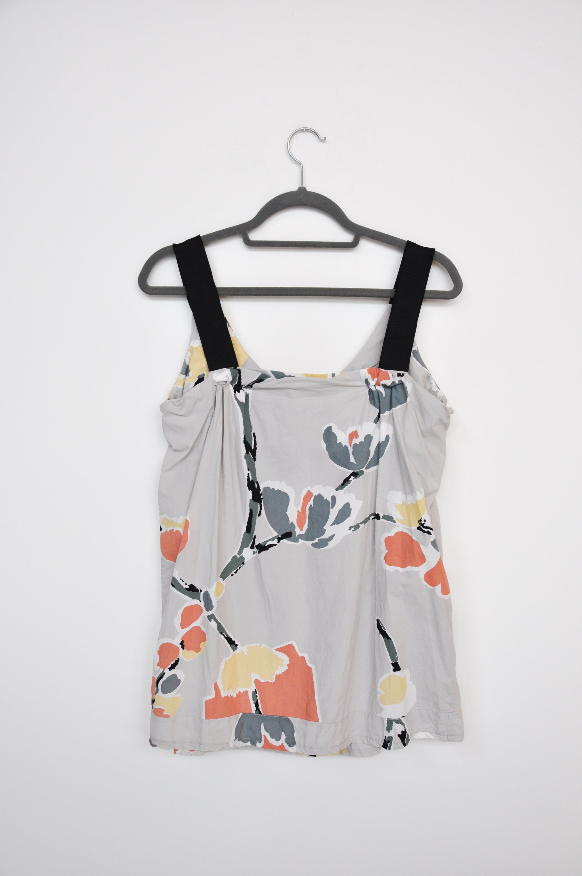 The top has a light-coloured base with all-over abstract floral pattern in shades of pink, yellow, grey, green. It features a gathered neckline, creating a draped effect. Thick black straps. By the brand Marni.