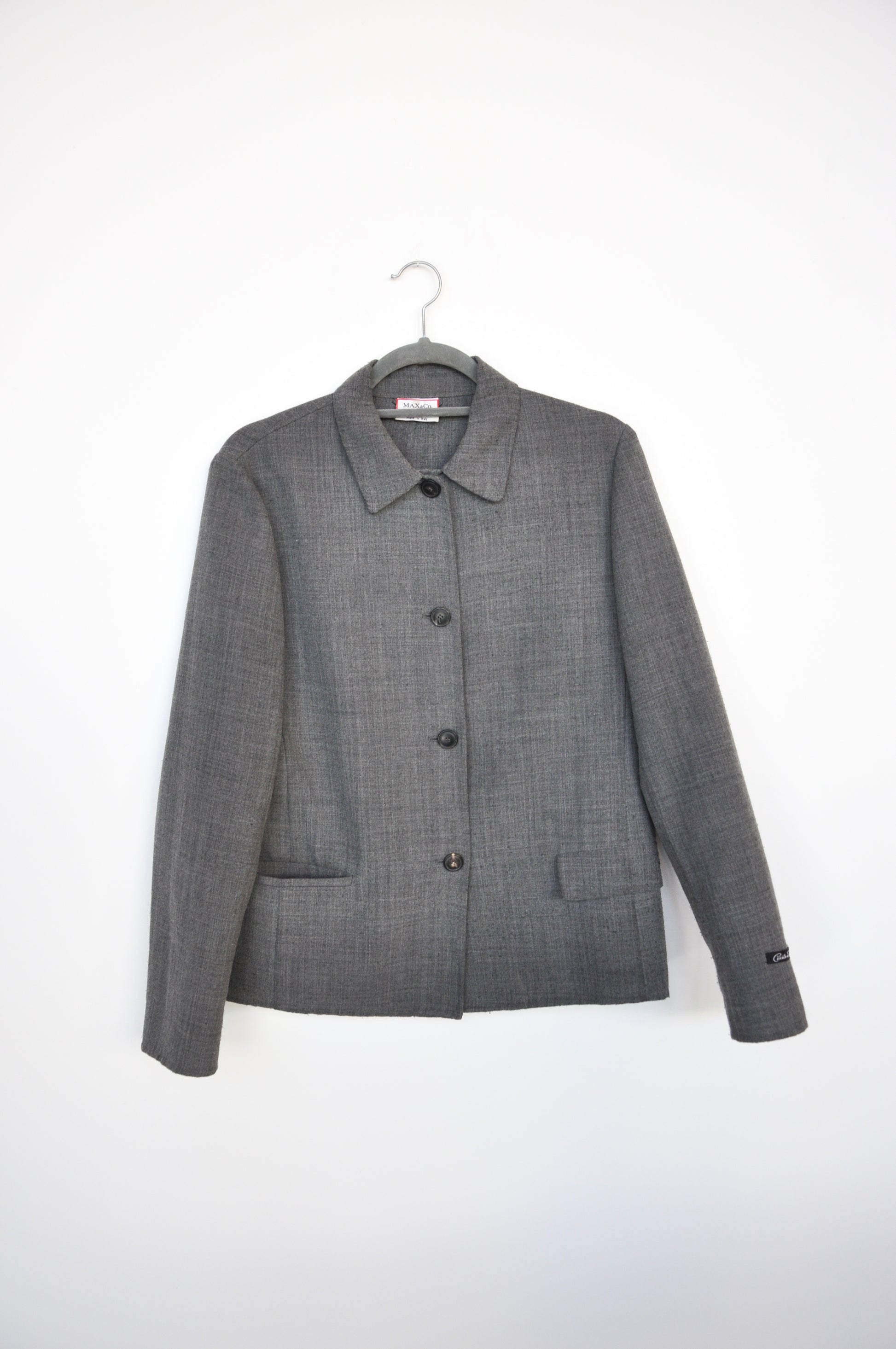 Button up blazer. In a textured grey colourway. Two front pockets. Buttons all the way up to the collar. By the brand Max & co.